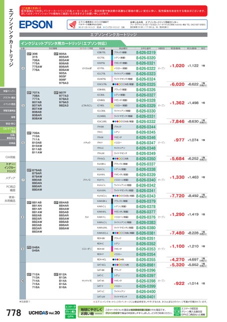 【ご注意ください】販売価格につきましてトナーカートリッジの各メーカーにおいて、原材料費や物流費の高騰など環境の著しい変化に伴い、販売価格を改定をする場合がございます。詳しくはオンラインショップの価格をご確認いただきますようお願い申し上げます。エプソン使用済カートリッジの回収でベルマーク点数がもらえます。▶トナーカートリッジ50点▶インクカートリッジ5点お申し込み先エプソンカートリッジ回収センターフリーダイヤル:0120-170-822(フリーダイヤルがご利用いただけない場合TEL:042-587-9585)受付時間:9:00〜17:00(土/日/祝日を除く)エプソンインクカートリッジインクジェットプリンタ用カートリッジ(エプソン対応)対応機種※パッケージ写真お申込番号●EP712A713A714A715A716AEP812A813A814A815A816A●包装数:1778※エプソンインクカートリッジのパッケージには商品特定をしやすくするため、さくらんぼなどのイメージ写真が印刷されています。Vol.20地球にやさしくお買い物このマークのついた商品は地球環境保護に配慮された商品です。グリーンの文字で商品の判別をしやすくしました。どうぞご利用ください。エコマーク認定品グリーン購入法適合品GPNエコ商品ねっと掲載さくらんぼM品番ICBK70LICC70LICM70LICY70LICLC70LICLM70LIC6CL70LICBK80LICC80LICM80LとうもろこしICY80LICLC80LICLM80LIC6CL80LITH-BKITH-CITH-MITH-YITH-LCITH-LMITH-6CLKUI-BK-LKUI-C-LKUI-M-LKUI-Y-LKUI-LC-LKUI-LM-LKUI-6CL-LKAM-BK-LKAM-C-LKAM-M-LKAM-Y-LKAM-LC-LKAM-LM-LKAM-6CL-LRDH-BKRDH-CRDH-MRDH-YRDH-4CLSAT-6CLSAT-BKSAT-CSAT-MSAT-YSAT-LCSAT-LMイチョウクマノミカメリコーダーサツマイモブラックL(増量)シアンL(増量)商品種別ブラック(増量)シアン(増量)ブラック(増量)シアン(増量)ライトシアンライトマゼンタマゼンタ(増量)イエロー(増量)マゼンタ(増量)イエロー(増量)ブラックシアン●●●●●●6色マゼンタイエローライトシアン(増量)ライトシアン(増量)ライトマゼンタ(増量)ライトマゼンタ(増量)8-626-03198-626-03208-626-03218-626-03228-626-03238-626-0324●●●●●●6色(増量)8-626-03258-626-03268-626-03278-626-03288-626-03298-626-03308-626-0331●●●●●●6色(増量)8-626-03328-626-03448-626-03458-626-03468-626-03478-626-03488-626-03498-626-03508-626-03378-626-03388-626-03398-626-03408-626-03428-626-0341●●●●●●6色L増量)8-626-03438-626-03798-626-03788-626-03778-626-03768-626-03838-626-0380●●●●●●6色L増量)8-626-03818-626-03518-626-03528-626-03538-626-03548-626-03558-626-89818-626-03968-626-03978-626-03988-626-03998-626-04008-626-0401ライトマゼンタL増量)ライトマゼンタL増量)ライトシアンL(増量)ライトシアンL(増量)マゼンタイエローマゼンタイエロー●●●●●●6色ブラックシアンブラックシアンイエローL増量)マゼンタL増量)イエローL増量)ライトシアンライトマゼンタブラックL(増量)シアンL(増量)マゼンタL増量)●●●●4色M価税抜税抜価格税込価格単位¥1,020¥1,1221個オープン¥6,020¥6,6221箱(6色入)¥1,362¥1,4981個オープン¥7,846¥8,6301箱(6色入)¥977¥1,0741個オープン¥5,684¥6,2521箱(6色入)¥1,330¥1,4631個オープン¥7,720¥8,4921箱(6色入)¥1,290¥1,4191個オープン¥7,480¥8,2281箱(6色入)¥1,100¥1,2101個オープン¥4,270¥5,320¥4,697¥5,8521箱1箱(4色入)(6色入)オープン¥922¥1,0141個EP805A805AR805AW806AB806AR806AW905A905F906F976A3EP907F977A3978A3979A3982A3EP884AB884AR884AW885AB885AR885AW886AB886AR886AW合番●EP306315706A775A775AW776A●●●●EP707A708A777A807AB807AR807AW808AB808AR808AWEP709A710A711A810AB810AW811AB811AWEP879AB879AR879AW880AB880AN880AR880AWEP881AB881AN881AR881AW882AB882AR882AW883AB883AR883AW●PX048A049Aエプソンインクカートリッジ学習ペーパークラフト・素材イベント用品学習支援用品保育安全・安心OA・サプライ用品文具・事務用品日用品OA用紙OA用紙トナー・インクカートリッジメディアメディPC周辺PC周辺機器機器家具・家具共用備品共用備