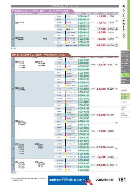 エプソンインクカートリッジ学習ペーパークラフト・素材イベント用品学習支援用品保育安全・安心OA・サプライ用品文具・事務用品日用品OA用紙用紙トナー・インクカートリッジメディアィアPC周辺辺機器器家具・具・共用備品用ビジネスインクジェットプリンタ用カートリッジ(エプソン対応)エプソンインクカートリッジ合番対応機種●PXS5010●PXM780FM781F大容量●包装数:1M品番IB06KAIB06CAIB06MAIB06YAIB06CL5AICBK84ICC84ICM84ICY84IC4CL84商品種別お申込番号シアンマゼンタイエローブラック●●●●●4色8-626-04138-626-04148-626-04158-626-04168-626-04178-626-04188-626-04198-626-04208-626-0421●●●●4色(大容量)8-626-0422イエロー(大容量)マゼンタ(大容量)ブラック(大容量)シアン(大容量)M価税抜税抜価格¥1,258税込価格¥1,383オープン¥1,673¥1,840単位1個¥7,300¥5,0681箱(5個入)¥8,030¥5,574オープン¥3,362¥3,6981個¥14,682¥16,1501箱(4色入)大判インクジェットプリンタ用カートリッジ(エプソン対応)合番●SCT2150T3150T3150MT3150N対応機種SCT5150T5150MT5150N●PXH8000H10000●PXF8000F8000MSF10000●SCT3050T3250T3255T5050T5250T5255●SCT3450T3450NT3455T3455N●包装数:1SCT7050T7250T7255SCT5450T5450MT5455M品番商品種別SC13MBMマットブラックSC13CLSC13MLSC13YLICBK57ICMB57ICC57ICVM57ICY57ICLC57シアンマゼンタイエローフォトブラック(350mL)マットブラック(350mL)シアン(350mL)ビビッドマゼンタ(350mL)イエロー(350mL)ライトシアンICVLM57ビビッドライトマゼンタICGY57ICLGY57ICOR57ICGR57ICBK57ICMB57ICC57ICVM57ICY57ICBK60ICMB60ICC60ICVM60ICY60グレーライトグレーオレンジグリーンフォトブラック(350mL)マットブラック(350mL)シアン(350mL)ビビッドマゼンタ(350mL)イエロー(350mL)フォトブラック(150mL)マットブラック(150mL)シアン(150mL)ビビッドマゼンタ(150mL)イエロー(150mL)SC1BK35フォトブラックSC1MB35マットブラックSC1C35SC1M35SC1Y35SC1MBシアンマゼンタイエローメンテナンスボックスSC14MB35マットブラックSC14C35シアンSC14M35SC14Y35マゼンタイエローお申込番号8-626-03848-626-03858-626-03868-626-03878-626-02378-626-02388-626-02398-626-02408-626-02418-626-02428-626-02438-626-02448-626-02458-626-02468-626-02478-626-02378-626-02388-626-02398-626-02408-626-02418-626-02488-626-02498-626-02508-626-02518-626-02528-626-02798-626-02808-626-02818-626-02828-626-02838-626-02848-626-03678-626-03828-626-03668-626-0365M価税抜税抜価格税込価格単位¥5,300¥4,710¥5,1811個¥15,900¥14,390¥15,8291個¥15,900¥14,390¥15,8291個¥8,300¥7,490¥8,239¥19,700¥17,720¥19,4921個¥7,000¥6,300¥6,930¥22,600¥19,600¥21,5601個※カタログに掲載の商品情報(仕様・価格・税率など)は変更になる場合がございます。最新情報はUCHIDASww.uchidas.netwへ!Vol.20