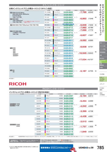 キヤノンインクカートリッジ・RICOHインクカートリッジ学習ペーパークラフト・素材イベント用品学習支援用品保育安全・安心OA・サプライ用品文具・事務用品日用品OA用紙用紙トナー・インクカートリッジメディアィアPC周辺辺機器器家具・具・共用備品用大判インクジェットプリンタ用カートリッジ(キヤノン対応)対応機種キヤノンインクカートリッジiPFiPF500/510/510plus600/605/605L/605Lplus610/610plus700/710/720650/655750/750school755/760/765※これらの機種はPFI-104M(マゼンタ)を使用してください。iPF650/655/750/750school/755/760/765iPF670/680/685770MFP/770school780/785TM-200205300305200MFP300MFPTA-2030●包装数:1M品番PFI-102MBKPFI-102BKPFI-102CPFI-102MPFI-102YPFI-104M商品種別マットブラックブラックシアンマゼンタイエローマゼンタPFI-107MBKマットブラックPFI-107BKPFI-107CPFI-107MPFI-107YブラックシアンマゼンタイエローPFI-120MBKマットブラックPFI-120BKPFI-120CPFI-121MPFI-120YブラックシアンマゼンタイエローPFI-320MBKマットブラックPFI-320BKPFI-320CPFI-320MPFI-320YブラックシアンマゼンタイエローPFI-030MBKマットブラックPFI-030BKPFI-030CPFI-030MPFI-030YブラックシアンマゼンタイエローM価税抜税抜価格¥7,766税込価格¥8,542単位オープンオープンオープン1個1個1個¥6,862¥7,548¥6,848¥7,982¥7,066¥7,532¥8,780¥7,772¥6,607¥7,267¥9,082¥9,990¥8,838¥9,721オープン¥16,949¥18,6431個¥17,034¥18,737オープン¥5,187¥5,7051個在庫無次第終了商品お申込番号8-626-86008-626-86018-626-86028-626-86038-626-86048-626-86058-626-87138-626-87148-626-87158-626-87168-626-87178-626-89118-626-89128-626-89138-626-89148-626-89158-626-89168-626-89178-626-89188-626-89198-626-89208-626-89918-626-89928-626-89938-626-89948-626-8995インクジェットプリンタ用カートリッジ(RICOH対応)対応機種M品番GC41KH商品種別RICOHインクカートリッジRICOHSG7200IPSiOSG7100RICOHSG23003300GC41CHGC41MHGC41YHGC41KGC41CGC41MGC41YGC43KGC43CGC43MGC43YGC43KSGC43CSGC43MSGC43YSブラックシアンマゼンタイエローブラックシアンマゼンタイエローブラックシアンマゼンタイエローブラックシアンマゼンタイエロー印字枚数※4200枚4000枚4000枚4000枚2000枚1900枚1900枚1900枚2000枚1900枚1900枚1900枚600枚500枚500枚500枚お申込番号8-626-20978-626-20988-626-20998-626-21008-626-21018-626-21028-626-21038-626-21048-626-21138-626-21148-626-21158-626-21168-626-21178-626-21188-626-21198-626-2120M価税抜税抜価格¥6,194税込価格¥6,813単位¥5,454¥5,999オープン¥4,242¥4,6661個¥3,399¥3,738¥4,438¥4,881¥3,512¥3,863オープン¥1,757¥1,9321個¥1,849¥2,033●包装数:1※国際標準規格であるISO/IEC24711(測定方法)、ISO/IEC24712(測定画像)に準拠し、スタート用インクカートリッジ交換後の2回目以降に装着したインクカートリッジを使用して算出しています。対応商品などお問い合わせ先製品に関するさらに詳しい情報に関しては、右記メーカーにお問い合わせください。リコーテクニカルコールセンター▶受付時間月〜金9:00〜17:00(土・日・祝祭日および当社休業日は除きます。)0120-892-111※カタログに掲載の商品情報(仕様・価格・税率など)は変更になる場合がございます。最新情報はUCHwIDASww.uchidas.netへ!Vol.20785