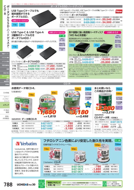 ※メディア類はメーカー事情により製造中止になることがありますのでご了承ください。ポータブルSSD・ハードディスクUSBType-Cケーブルでも端末接続ができるポータブルSSD。USB3.2/3.1/3.0/2.01TB2TBUSBType-Aケーブルに加え、USBType-Cケーブルも同梱。Type-Cケーブルでも端末接続ができるポータブルSSD。[バッファロー]ポータブルSSD商品種別お申込番号M価税抜税抜価格税込価格単位型式/SSD-PGC1.0U3-BC1TB2TB●寸法/75幅)×117(奥)×11.5(高)mm●質量/約110g●インターフェイス/USB3.2Gen1/USB3.1Gen1/3.0/2.0●端子形状/Micro-B●付属品/USBケーブル(AtoMicro-B、CtoMicro-B各50cm)、取扱説明書●包装数:1/268-626-2679¥39,100¥20,540¥22,5948-626-2680¥72,100¥34,500¥37,950型式/SSD-PGC2.0U3-BC1台USBType-C&USBType-A2種類のケーブル付きポータブルHDD!持ち運びの際も大切なデータを守る外付けハードディスクです。USB3.2/3.1/3.0/2.0Win7〜11MacOS10.12〜15ChromeOS熱や振動に強い高信頼ハードディスク「WDRed」を搭載!低回転速ながら7200回転のハードディスクに相当する高速転送を実現した「WDRed」を採用。1TB2TBUSB3.0/2.0Win10/11WinServer2012〜2020MacOS13〜15183mm120mm[エレコム]3.5inch外付けHDDUSB3.0商品種別お申込番号M価税抜税抜価格税込価格単位オープン型式/ELD-型式/ELD-¥19,000¥20,900¥25,800¥28,380REN010UBK8-628-6217REN020UBK8-628-62181TB2TB●外形寸法/本体:120幅)×183奥)×35厚)mm(突起部を除く)●質量/本体:850g●対応OS/Win10/11、WinServer2012R264bit)/201264bit)/201664bit)/2019/2020、macOS15Sequoia/macOS14Sonoma/macOS13Ventura●ドライブ数/1●インターフェイス/USB3.0/2.0●入力電圧/100V●コネクタ形状/USB3.0Standard-B×1●セキュリティスロット●PC電源連動●アクセスLED●付属品/ACアダプタ×1、USB3.0ケーブル(約1.0m)×1、他●保証期間3年間●包装数:1/10※テレビ向けのセットアップガイドを同梱していますが、各社テレビ各機種との個別の動作確認はしておりません。1台テレビ側の仕様などにより本製品をお使いいただけない場合がございますがご了承ください。※対応OSは、いずれも日本語OSに限ります。[バッファロー]ポータブルHDDM価税抜税抜価格お申込番号商品種別型式/HD-PGAC1U3-BA型式/HD-PGAC2U3-BA8-628-6736¥18,100¥17,200¥18,9208-628-7200¥22,300¥21,405¥23,5451TB2TB●寸法/1TB:75(幅)×117(奥)×14(厚)mm、2TB:75幅)×117(奥)×19.5(厚)mm●質量/175g1TB)、240g2TB)●対応OS/Win7〜11、macOS10.12〜15、ChromeOS●インターフェイス/USB3.2Gen1)/USB3.1Gen1)/3.0/2.0●コネクタ形状/USB3.2Gen1)/USB3.1(Gen1)/3.0Micro-B●セキュリティ/SecureLockMobile2(暗号化:AES256bitソフトウェア方式)●付属品/USBケーブル(Type-C、Type-A)、取扱説明書●包装数:1税込価格単位1台1TB2TBmm11775mmお徳用データ用CD-R。52倍速対応!10枚入50枚入CD-R100枚入まとめ買いならこの商品がお得!700MBインクジェットプリンタ対応ワイド印刷エリア1個(50枚入)税抜¥1,650税込¥1,8151個(100枚入)税抜¥3,180税込¥3,498[磁気研究所]データ用CD-R商品種別お申込番号M価税抜税抜価格税込価格単位型式/HDCR80GP10SC10枚入1個(10枚入)50枚入1個(50枚入)100枚入1個(100枚入)●記憶容量/700MB●倍速/52倍速●5mmSlimケース(10枚入)、スピンドルケース(50枚入、100枚入)●レーベル/インクジェットプリンタ対応、ホワイト、ワイドプリンタブル●包装数:1/10(10枚入)、1/650枚入)、1/5(100枚入)8-627-05728-627-04918-627-0492¥780¥1,650¥3,180¥858¥1,815¥3,498型式/HDCR80GP100型式/HDCR80GP50オープン700MB100枚入インクジェットプリンタ対応ワイド印刷エリアスピンドルケースなし1個(100枚入)税抜¥2,980税込¥3,278[磁気研究所]CD-Rデータ用100枚入商品種別型式/CR80GP100_BULKお申込番号8-627-0573税抜価格税込価格¥3,278¥2,980M価税抜オープン(100枚入)●記憶容量/700MB●倍速/52倍速●シュリンクecoパック●レーベル/インクジェットプリンタ対応、ホワイト、ワイドプリンタブル●包装数:1/6単位1個ポータブルSSD・ハードディスク・CD︲R学習ペーパークラフト・素材イベント用品学習支援用品保育安全・安心OA・サプライ用品文具・事務用品日用品OA用紙OA用紙トナー・トナー・インクカーインクカートリッジメディアPC周辺PC周辺機器機器家具・家具共用備品共用備®Verbatimは、世界で使われている光メディアの中でも世界有数のブランドです。過去には三菱化学ケミカルが保有していたブランドで、日本では高品質で定評がありました。現在もグローバルで磨かれた品質保証体制と、安定した供給体制で、安全・安心な製品をお届けします。フタロシアニン色素により安定した耐久性を実現。印刷可能ワイドホワイトレーベル。10枚入50枚入100枚入700MBインクジェットプリンタ対応[Verbatim]CD-R商品種別お申込番号M価税抜税抜価格税込価格単位型式/SR80PP1010枚入1個(10枚入)50枚入1個(50枚入)100枚入1個(100枚入)●記憶容量/700MB●倍速/48倍速●5mmプラケース(10枚入)、スピンドルケース(50枚入、100枚入)●レーベル/インクジェットプリンタ対応、ホワイト●包装数:18-627-06708-627-06728-627-0671¥780¥1,880¥3,680¥858¥2,068¥4,048型式/SR80PP100型式/SR80PP50オープン788Vol.20地球にやさしくお買い物このマークのついた商品は地球環境保護に配慮された商品です。グリーンの文字で商品の判別をしやすくしました。