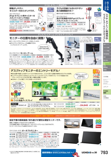 GIGAスクール対応スマホ・タブレット関連用品・ディスプレイアーム・デジタルディスプレイ学習ペーパークラフト・素材イベント用品学習支援用品保育安全・安心OA・サプライ用品文具・事務用品日用品OA用紙用紙トナー・トナー・インクカーインクカートリッジメディアィアPC周辺機器家具・具・共用備品用アームの3つの関節を動かして、ディスプレイの傾き・左右の向き・角度を細かく調整でき、画面の縦向き設置も可能です。スマホ・タブレット関連用品子どもの目線にも合わせやすい高さ調整機能付き!!重めの台座で安定感があります。845〜1385mm[サンワサプライ]高さ可変機能付きiPad・タブレットスタンド(4.5〜11インチ)お申込番号8-628-7161M価税抜¥14,00税抜価格¥11,199税込価格¥12,318単位1台〈対応タブレット〉4.5〜11インチ135〜180mm170〜219mm9〜13インチ240〜320mm厚さ:10mmまで〈対応タブレット〉商品種別型式/MR-TABST20ホルダーには鍵が付いており、セキュリティ対策ができます。●寸法/外寸:282径)×1440(高)mm、支柱:22(径)mm、タブレットホルダー:135〜180mm●質量/5.5kg●総耐荷重/1.5kg●お客様組立商品●包装数:1任意の高さに調節可能。移動がしやすいキャスター付きスタンドです。[サンワサプライ]iPad・タブレット用キャスター付スタンド(13インチ対応)お申込番号M価税抜税抜価格税込価格8-628-7229¥33,00¥24,564¥27,0201060〜1460mm任意の高さに調節可能。単位1台商品種別型式/CR-LASTTAB34W●寸法/320幅)×360奥)×1460高)mm●質量/3.6kg●総耐荷重/1kg●付属品/鍵×2個(1種類)●お客様組立商品●包装数:1360°回転できます。P.355三脚を掲載しております。0mm63320mmディスプレイアーム・デジタルディスプレイモニターの位置を自由に調整!●13〜32インチサイズのモニターに対応しています。●ガススプリング式でスムーズな調整ができるシングルモニターアームです。[サンワサプライ]モニターアーム商品種別型式/CR-LAC1405BKお申込番号8-626-3009M価税抜¥6,000VESA75×75、100×100に対応。〈2種類の取り付け方法〉税抜価格税込価格¥5,300¥5,830単位1台●材質/クランプ:スチール・ABS樹脂、アーム:スチール・アルミ・ABS樹脂、ブラケット:スチール●取り付け方法/クランプ式(可能厚10〜50mm)、グロメット式(可能厚10〜80mm)●耐荷重/8kg●VESAブラケット/厚:1.8mm、幅:114mm●アーム構造/ガススプリング式●可動範囲/液晶モニター:パン(画面左右)左90°、右90°、チルト(画面上下):上90°、下45°、スウィング(全体左右)360°、ローテーション(画面回転)360°●お客様組立商品●包装数:1クランプ式天板を挟んで固定。グロメット式デスクに穴をあけて固定。デスクトップモニターのエントリーモデル!●見る位置や角度による色やコントラストの変化が少なく、どこから見ても映像が鮮明なADSパネルを採用。●バックライトのちらつきをなくした「フリッカーレス」やディスプレイ本体でブルーライトを低減させる「ブルーリダクション2」など目に優しい機能も搭載しています。●HDMIケーブル付属で、すぐにお使いいただけます。3辺フレームレスで広視野角のモニターです!沖縄・離島はサービス対象外ブラックホワイト●●へ!Vol.20793使用例単位お申込番号M価税抜税抜価格8-626-3113オープン¥23,751¥26,126¥29,748¥32,7228-626-3114税込価格1台●●入力端子/USBType-C×2、MiniHDMI×1●出力端子/AUDIOOUT×1●スピーカー出力/❶1W+1W、❷1.5W+1.5W●解像度/1920×1080●アスペクト比/16:9●視野角(H/V)(CR10:1)/❶170/170、❷178/178●最大輝度/❶230cd/㎡、❷250cd/㎡●最大コントラスト比/❶800:1、❷1000:1●リフレッシュレート/60Hz●応答速度(GtG,typ)/❶20ms、❷14ms●最大消費電力/❶<15W、❷<20W●定格電圧/定格電流/5V-3A、9V-3A、12V-2.5A、15V-2A、20V-1.5A●スタンバイ消費電力/<0.5W●マウント取付用穴/75×75mm(❷のみ)●付属品/USBtype-Cケーブル、HDMIーMiniHDMIケーブル、スタンドカバー、取扱説明書●包装数:1商品種別寸法/357幅)×16奥)×217(高)mm、質量/1.1kg、型式/DP-EF164S-B寸法/426幅)×16奥)×259(高)mm、質量/1.8kg、型式/DP-EF184S-B15.6V型18.5V型●[アイリスオーヤマ]ポータブルモニター※カタログに掲載の商品情報(仕様・価格・税率など)は変更になる場合がございます。最新情報はUCHIDASww.uchidas.netw※メーカー直送品です。返品はご容赦ください。上記商品は受注日から8営業日以内のお届けになります。設定不要の簡単接続!持ち運びが便利な薄型モニターです。接続して電源を入れるだけですぐに使えます。大きな画面で細かい文字が見やすく、セカンドディスプレイとしておすすめです。モニタースタンドとしても使用できるカバー付き。商品種別お申込番号M価税抜税抜価格税込価格単位23.8インチ寸法/スタンドあり:約540(幅)×215奥)×382高)mm、スタンドなし:約540(幅)×41(奥)×325(高)mm、質量/スタンドあり:約3.5kg、スタンドなし:約3.2kgブラックホワイト●入力端子/HDMI×1/アナログRGB×1●パネル表面処理/非光沢●最大表示解像度/1920×1080●最大表示色/1677万色●視野角度/上下:178°、左右:178°●最大輝度(標準値)/250cd/㎡●コントラスト比(標準値)/1000:1●応答速度/5msGTG](75Hz/