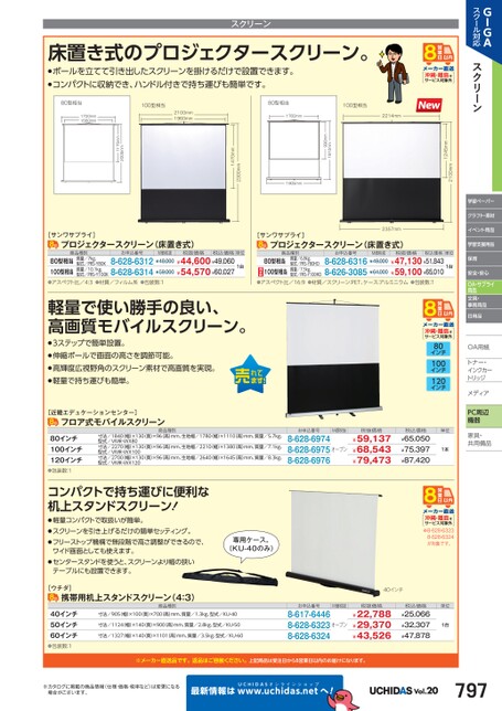 GIGAスクール対応スクリーン学習ペーパークラフト・素材イベント用品学習支援用品保育安全・安心OA・サプライ用品文具・事務用品日用品OA用紙用紙トナー・トナー・インクカーインクカートリッジメディアィアPC周辺機器家具・具・共用備品用沖縄・離島はサービス対象外2100mm1245mmスクリーン床置き式のプロジェクタースクリーン。●ポールを立てて引き出したスクリーンを掛けるだけで設置できます。●コンパクトに収納でき、ハンドル付きで持ち運びも簡単です。80型相当1700mm1560mm100型相当2100mm1960mm80型相当1760mm100型相当2214mm1910mm990mm1905mm2300mm1470mm2005mm1170mm[サンワサプライ]プロジェクタースクリーン(床置き式)商品種別お申込番号M価税抜税抜価格税込価格単位質量/7kg、型式/PRS-Y80K質量/10.1kg、80型相当100型相当●アスペクト比/4:3●材質/フィルム系●包装数:18-628-6312¥48,000型式/PRS-Y100K8-628-6314¥59,000¥44,600¥49,060¥54,570¥60,0271台2357mm[サンワサプライ]プロジェクタースクリーン(床置き式)商品種別80型相当100型相当質量/6.8kg、型式/PRS-Y80HD質量/7.5kg、型式/PRS-Y100HDお申込番号M価税抜税抜価格税込価格単位8-628-6316¥49,0008-626-3085¥64,000¥47,130¥51,843¥59,100¥65,0101台●アスペクト比/16:9●材質/スクリーン:PET、ケース:アルミニウム●包装数:1軽量で使い勝手の良い、高画質モバイルスクリーン。●3ステップで簡単設置。●伸縮ポールで画面の高さを調節可能。●高輝度広視野角のスクリーン素材で高画質を実現。●軽量で持ち運びも簡単。[近畿エデュケーションセンター]フロア式モバイルスクリーン商品種別80インチ100インチ120インチ●包装数:1寸法/1840(幅)×130(奥)×96(高)mm、生地幅/1780幅)×1110(高)mm、質量/5.7kg、型式/VMR-WX80寸法/2270(幅)×130(奥)×96(高)mm、生地幅/2210幅)×1380(高)mm、質量/7.1kg、型式/VMR-WX100寸法/2700(幅)×130(奥)×96(高)mm、生地幅/2640幅)×1645(高)mm、質量/8.3kg、型式/VMR-WX120沖縄・離島はサービス対象外80インチ100インチ120インチお申込番号8-628-69748-628-69758-628-6976M価税抜オープン税抜価格¥59,137¥68,543¥79,473税込価格¥65,050¥75,397¥87,420単位1本コンパクトで持ち運びに便利な机上スタンドスクリーン!●軽量コンパクトで取扱いが簡単。●スクリーンを引き上げるだけの簡単セッティング。●フリーストップ機構で無段階で高さ調整ができるので、ワイド画面としても使えます。●センタースタンドを使うと、スクリーンより幅の狭いテーブルにも設置できます。専用ケース。(KU-40のみ)沖縄・離島はサービス対象外※8-628-63238-628-6324が対象です。[ウチダ]40インチ50インチ60インチ●包装数:1携帯用机上スタンドスクリーン(4:3)商品種別寸法/905幅)×100奥)×700(高)mm、質量/1.3kg、型式/KU-40寸法/1124(幅)×140(奥)×900(高)mm、質量/2.8kg、型式/KU-50寸法/1327(幅)×140(奥)×1101(高)mm、質量/3.5kg、型式/KU-6040インチお申込番号8-617-64468-628-63238-628-6324M価税抜オープン税抜価格¥22,788¥29,370¥43,526税込価格¥25,066¥32,307¥47,878単位1台※メーカー直送品です。返品はご容赦ください。上記商品は受注日から8営業日以内のお届けになります。※カタログに掲載の商品情報(仕様・価格・税率など)は変更になる場合がございます。最新情報はUCHIDASww.uchidas.netwへ!Vol.20797