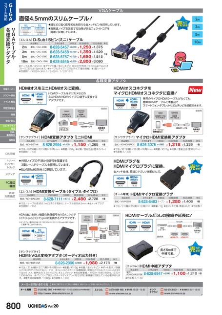 VGAケーブル直径4.5mmのスリムケーブル!ミニD-sub15pinミニD-sub15pin(オス)(オス)●などに強く信号劣化を抑える金メッキピンを採用しています。●高周波ノイズを吸収する効果があるフェライトコアを両端に採用しています。[エレコム]D-Sub15ピン(ミニ)ケーブル2m3m5m10m商品種別型式/CAC-20BK型式/CAC-30BK型式/CAC-50BK型式/CAC-L10BKお申込番号M価税抜税抜価格税込価格8-628-5457¥2,6608-628-5458¥3,1908-628-5767¥3,7308-628-5545¥6,260¥1,250¥1,375¥1,390¥1,529¥1,650¥1,815¥2,800¥3,080単位1本●ケーブル径/4.5mm●プラグ仕様/金メッキピン●コネクタ形状/ミニD-sub15pin(オス)ーミニD-sub15pinオス)●ケーブルタイプ/スリムタイプ(複合同軸)●2重シールド●包装数:1/402m・3m)、1/24(5m)、1/20(10m)各種変換アダプタ2m3m5m10mHDMIオスコネクタをマイクロHDMIオスコネクタに変換!HDMIHDMI-micro(メス)(オス)専用のマイクロHDMIケーブルがなくても、標準HDMIケーブルと本製品でスマートフォン・タブレットなどとテレビを接続できます。HDMIオスをミニHDMIオスに変換。HDMIHDMI-mini(メス)(オス)HDMIケーブルをデジカメなどのミニHDMI(HDMIタイプC)端子に変換するアダプタです。[サンワサプライ]HDMI変換アダプタミニHDMI商品種別型式/AD-HD07MKお申込番号8-626-2994M価税抜¥1,400税抜価格¥1,150税込価格¥1,265接続例単位1個接続例単位1個[サンワサプライ]マイクロHDMI変換用アダプタ商品種別型式/AD-HD09MCKお申込番号8-626-3075M価税抜¥1,980税抜価格¥1,218税込価格¥1,339●寸法/約19(幅)×32.3奥)×9(高)mm●質量/約9g●材質/亜鉛合金(筐体カバー)●包装数:1/300●寸法/約19(幅)×39(奥)×9(高)mm●質量/約11g●材質/亜鉛合金(筐体カバー)●包装数:1/300●外部ノイズの干渉から信号を保護する3重シールドケーブルを採用しています。●EUの「RoHS指令」に準拠しています。HDMIHDMI-micro(メス)(オス)HDMIプラグをHDMIマイクロプラグに変換。金メッキ仕様、環境にやさしい無鉛はんだ。HDMIHDMI-micro(メス)(オス)[エレコム]HDMI変換ケーブル(タイプA-タイプD)商品種別型式/AD-HDAD2BKお申込番号M価税抜8-628-7111¥4,710税抜価格¥2,480税込価格¥2,728単位1個●寸法/ケーブル長:約0.1m(コネクタを除く)、ケーブル径:約4.5mm●金メッキプラグ●包装数:1/160HDMI出力を持つ機器の映像信号をVGAコネクタ(ミニD-subHD)15pin)に変換するアダプタです。※ディスプレイ側のHDMIコネクタをVGAコネクタ(ミニD-subHD)15pin)に変換することはできません。HDMIミニD-sub15pin(オス)(メス)[サンワサプライ]HDMI-VGA変換アダプタ(オーディオ出力付き)商品種別型式/AD-HD25VGAお申込番号M価税抜8-626-2996¥2,500税抜価格¥1,980税込価格¥2,178単位1個●寸法/21.6(幅)×37.7(奥)×14(高)mm●質量/約10g●材質/金メッキピン●ポート形状/映像入力:HDMIタイプA(19pin)オス※microUSBポート(給電専用)、映像出力:VGA(ミニD-subHD)15pin)メス、音声出力:3.5mmステレオミニジャック●対応解像度/1920×1080/60Hz、1920×1200/60Hz※パソコン・プロジェクターやディスプレイ両方が同じ解像度に対応している必要があります。●最大対応解像度/1080p●包装数:1/200メーカーお問い合わせ先製品に関するさらに詳しい情報は、各メーカーにお問い合わせください。[オーム電機]HDMIマイクロ変換プラグ商品種別型式/VIS-P0308お申込番号M価税抜8-628-6483オープン税抜価格¥1,280税込価格¥1,408単位1個●寸法/21(幅)×35(奥)×12(高)mm●質量/7g●金メッキ仕様、無鉛はんだ●包装数:1接続例HDMIケーブルどうしの接続や延長に!HDMIHDMI(メス)(メス)接続例長さ5mまで中継可能。[エレコム]HDMI中継アダプタ商品種別型式/AD-HDAAS01BK●包装数:1/160お申込番号M価税抜税抜価格税込価格8-628-6947¥2,090¥1,100¥1,210単位1個オーム電機0120-963-006▲受付時間9:00〜17:00(土日祝日および年末年始を除く)http://www.ohm-electric.co.jpエレコム0570-084-465▲受付時間10:00〜19:00www.elecom.co.jpサンワサプライ03-5763-0011▲受付時間9:00〜18:00www.sanwa.co.jp800Vol.20GIGAスクール対応VGAケーブル・各種変換アダプタ学習ペーパークラフト・素材イベント用品学習支援用品保育安全・安心OA・サプライ用品文具・事務用品日用品OA用紙OA用紙トナー・トナー・インクカーインクカートリッジメディアメディPC周辺機器家具・家具共用備品共用備