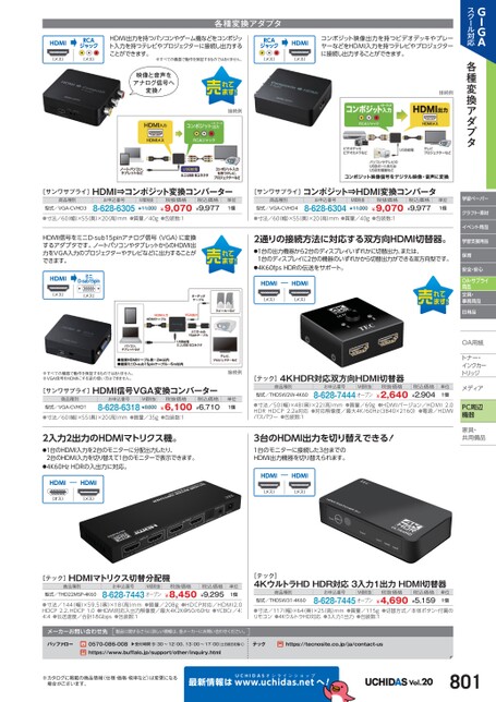 GIGAスクール対応各種変換アダプタ学習ペーパークラフト・素材イベント用品学習支援用品保育安全・安心OA・サプライ用品文具・事務用品日用品OA用紙用紙トナー・トナー・インクカーインクカートリッジメディアィアPC周辺機器家具・具・共用備品用HDMIRCAジャック(メス)(メス)HDMI出力を持つパソコンやゲーム機などをコンポジット入力を持つテレビやプロジェクターに接続し出力することができます。※すべての機器で動作を保証するものではありません。RCAジャックHDMI(メス)(メス)コンポジット映像出力を持つビデオデッキやプレーヤーなどをHDMI入力を持つテレビやプロジェクターに接続し出力することができます。各種変換アダプタ映像と音声をアナログ信号へ変換!接続例[サンワサプライ]HDMI⇒コンポジット変換コンバーター商品種別型式/VGA-CVHD3お申込番号8-628-6305M価税抜¥11,000税抜価格¥9,070税込価格¥9,977単位1個接続例単位1個[サンワサプライ]コンポジット⇒HDMI変換コンバータ商品種別型式/VGA-CVHD4お申込番号8-628-6304M価税抜¥11,000税抜価格¥9,070税込価格¥9,977●寸法/60(幅)×55(奥)×20(高)mm●質量/40g●包装数:1●寸法/60(幅)×55(奥)×20(高)mm●質量/40g●包装数:1HDMI信号をミニD-sub15pinアナログ信号(VGA)に変換するアダプタです。ノートパソコンやタブレットからのHDMI出力をVGA入力のプロジェクターやテレビなどに出力することができます。HDMI(メス)ミニD-sub15pin(メス)※すべての機器で動作を保証するものではありません。※VGA信号をHDMIにする逆の使い方はできません。[サンワサプライ]HDMI信号VGA変換コンバーター商品種別型式/VGA-CVHD1お申込番号M価税抜8-628-6318¥8,600税抜価格¥6,100税込価格¥6,710●寸法/60幅)×55奥)×20高)mm●質量/35g●包装数:12入力2出力のHDMIマトリクス機。●1台のHDMI入力を2台のモニターに分配出力したり、2台のHDMI入力を切り替えて1台のモニターで表示できます。●4K60HzHDRの入出力に対応。HDMIHDMI(オス)(メス)接続例単位1個[テック]HDMIマトリクス切替分配機商品種別型式/THD22MSP-4K60お申込番号M価税抜8-628-7443オープン税抜価格¥8,450税込価格¥9,295単位1個●寸法/144(幅)×59.5(奥)×18(高)mm●質量/208g●HDCP対応/HDMI2.0HDCP2.2、HDCP1.0●HDMI対応入出力解像度/最大4K2K@50/60Hz●YCBCr/4:4:4●伝送速度/合計18Gbps●包装数:1メーカーお問い合わせ先製品に関するさらに詳しい情報は、各メーカーにお問い合わせください。バッファロー0570-086-008https://www.buffalo.jp/support/other/inquiry.html▲受付時間9:30〜12:00、13:00〜17:00(土日祝日を除く)2通りの接続方法に対応する双方向HDMI切替器。●1台の出力機器から2台のディスプレイいずれかに切替出力、または、1台のディスプレイに2台の機器のいずれかから切替出力ができる双方向型です。●4K60fpsHDRの伝送をサポート。HDMIHDMI(メス)(メス)[テック]4KHDR対応双方向HDMI切替器商品種別型式/THDSW2W-4K60お申込番号M価税抜8-628-7444オープン税抜価格¥2,640税込価格¥2,904単位1個●寸法/50(幅)×48(奥)×22(高)mm●質量/69g●HDMIバージョン/HDMI2.0HDRHDCP2.2a対応●対応解像度/最大4K/60Hz3840×2160)●電源/HDMIバスパワー●包装数:13台のHDMI出力を切り替えできる!1台のモニターに接続した3台までのHDMI出力機器を切り替えられます。HDMIHDMI(メス)(メス)[テック]4KウルトラHDHDR対応3入力1出力HDMI切替器商品種別型式/THDSW31-4K60お申込番号M価税抜8-628-7445オープン税抜価格¥4,690税込価格¥5,159単位1個●寸法/117幅)×64(奥)×25(高)mm●質量/115g●切替方式/本体ボタン・付属のリモコン●4KウルトラHD対応●3入力1出力●包装数:1テックhttps://tecnosite.co.jp/ja/contact-us※カタログに掲載の商品情報(仕様・価格・税率など)は変更になる場合がございます。最新情報はUCHIDASww.uchidas.netwへ!Vol.20