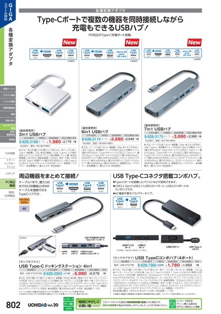 各種変換アダプタType-Cポートで複数の機器を同時接続しながら充電もできるUSBハブ!PD対応のType-C充電ポート搭載。USBTypeCHDMIUSBTypeA(オス)(メス)(メス)USBTypeC(メス)※※給電用USBTypeCHDMIUSBTypeA(オス)(メス)(メス)×2microSDSDcardcard/USBTypeC(メス)※※給電用USBTypeCHDMIUSBTypeAUSBTypeC(オス)(メス)(メス)×2(メス)microSDSDcardcard/USBTypeC(メス)※※給電用[磁気研究所]3in1USBハブお申込番号M価税抜税抜価格8-626-3166オープン¥1,980¥2,178税込価格単位1個商品種別型式/HD-3IN1HBSV●寸法/約58幅)×58(奥)×11高)mm●ケーブル長/10cm●質量/37g●対応機器/USBType-C入力端子を持ったパソコンおよびパソコン周辺機器、ゲーム機●対応解像度/4K30Hz●転送速度/5Gbps●ポート数/PD対応USBType-C充電ポート(最大90W対応)×1、USBType-A(USB3.2Gen1)ポート×1、HDMIポート×1●電源/バスパワー●消費電力/最大2.5W●包装数:1[磁気研究所]6in1USBハブお申込番号M価税抜税抜価格8-626-3174オープン¥2,680¥2,948税込価格単位1個商品種別型式/HD-6IN1HBSV●寸法/ケーブル長:15cm●質量/40g●コネクタ形状/USBType-C●搭載ポート/PD対応Type-C充電ポート×1(最大90W出力)、Type-Aポート×1(USB3.2Gen1×1、最大5Gbps)、Type-Aポート×1(USB2.0、最大480mbps)、HDMIポート×1(最大4K@30Hz対応)、microSDカードスロット×1(最大480Mbps/最大60MB/s)、SDカードスロット×1(最大480Mbps/最大60MB/s)●電源方式/バスパワー●消費電力/最大2.5W●包装数:1[磁気研究所]7in1USBハブお申込番号M価税抜税抜価格8-626-3175オープン¥3,080¥3,388税込価格単位1個商品種別型式/HD-7IN1HBSV●寸法/ケーブル長:15cm●質量/44g●コネクタ形状/USBType-C●搭載ポート/PD対応Type-C充電ポート×1(最大90W出力)、Type-Aポート×1USB3.2Gen1×1、最大5Gbps)、Type-Aポート×1(USB2.0、最大480mbps)、Type-Cポート×1USB2.0、最大480mbps)、HDMIポート×1(最大4K@30Hz対応)、microSDカードスロット×1(最大480Mbps/最大60MB/s)、SDカードスロット×1(最大480Mbps/最大60MB/s)●電源方式/バスパワー●消費電力/最大2.5W●包装数:1周辺機器をまとめて接続!USBTypeCHDMIUSBTypeAUSBTypeC(オス)(メス)(メス)×2(メス)ケーブル1本で、最大3台までのUSB機器とHDMIケーブルを接続できるTypeCハブです。PowerDelivery60W4K使用例[サンワサプライ]USBType-Cドッキングステーション4in1商品種別型式/USB-3TCH37GMお申込番号8-626-2993M価税抜¥7,100税抜価格¥5,980税込価格¥6,578単位1個●寸法/約95(幅)×25奥)×13(高)mm●質量/約44g●材質/筐体:アルミ●インターフェイス/USB仕様Ver3.2Gen1(USB3.1/3.0)準拠(USBVer2.0/1.1上位互換)●ポート数/ダウンストリーム:USB3.2Gen1USB3.1/3.0)Aコネクタメス×1、USB2.0Aコネクタメス×1、USBType-Cポートメス(PD60W対応)×1、アップストリーム:USB3.2Gen13.1/3.0)Type-Cコネクタオス×1●電源/セルフパワー/バスパワー両対応●供給電流/最大900mA(全ポート合計)●包装数:1/100※パソコン本体に付属のPD対応ACアダプタを使用しセルフパワーとしても使用できます。※45W以下のACアダプタを使用する場合はパソコンが充電モードに入らない場合があります。USBType-Cコネクタ搭載コンボハブ。●Type-Cポートを搭載したパソコンなどで使用できます。●USB3.2Gen1USB3.1/USB3.0)×1ポート、USB2.0×3ポートのコンボハブです。●AC電源不要のバスパワータイプ。USBTypeCUSBTypeA(オス)(メス)※USB3.1Gen2には対応していません。[サンワサプライ]USBTypeCコンボハブ(4ポート)商品種別型式/USB-3TCH7BKお申込番号M価税抜8-628-7360¥2,200税抜価格¥1,780税込価格¥1,958単位1個●寸法/90.8(幅)×30(奥)×10.8(高)mm●ケーブル長/約15cm●質量/39.2g●インターフェイス/USB仕様Ver.3.2Gen1(USB3.1Gen1/USB3.0)準拠(USBVer.2.0/1.1上位互換)●対応OS/Windows11・10・8.1・8・7、macOSVentura)13、macOSMonterey)12、macOSBigSur)11、macOS10.12〜10.15、MacOSX10.10〜10.11、iPadOS13〜15、ChromeOS●通信速度/5GbpsUSB3.2Gen1)/480Mbps/12Mbps/1.5Mbps理論値)●ポート数/USB3.2Gen1(USB3.1/USB3.0)Aコネクタメス×1ダウンストリーム)、USB2.0Aコネクタメス×3(ダウンストリーム)、USBType-Cコネクタオス×1アップストリーム)●電源/バスパワー●供給電流最大/850mA(全4ポート合計)●包装数:1/100※接続する機器の消費電流が本製品の供給電流を超える場合、バスパワーで正常に動作しないことがあります。GIGAスクール対応各種変換アダプタ学習ペーパークラフト・素材イベント用品学習支援用品保育安全・安心OA・サプライ用品文具・事務用品日用品OA用紙OA用紙トナー・トナー・インクカーインクカートリッジメディアメディPC周辺機器家具・家具共用備品共用備802Vol.20地球にやさしくお買い物このマークのついた商品は地球環境保護に配慮された商品です。グリーンの文字で商品の判別をしやすくしました。どうぞご利用ください。エコマーク認定品グリーン購入法適合品GPNエコ商品ねっと掲載