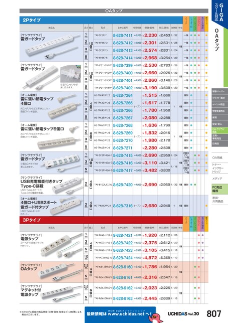 OA用紙用紙インクカートナー・トナー・インクカートリッジPC周辺機器メディアィア学習ペーパークラフト・素材イベント用品学習支援用品保育安全・安心文具・用品OA・サプライ事務用品日用品家具・共用備品具・用スクール対応GIGAVol.20最新情報はへ!wUCHIDASww.uchidas.net※カタログに掲載の商品情報(仕様・価格・税率など)は変更になる場合がございます。OAタップOAタップ2Pタイプスイッチシャッター付スイングプラグマグネット抜け止め機能雷ガード商品名長さ個口型式お申込番号M価税抜税抜価格税込価格包装数単位[サンワサプライ]雷ガードタップ1m10個口TAP-SP217-18-628-7411¥3,700¥2,230¥2,4531/321個一括●●●●2mTAP-SP217-28-628-7412¥3,900¥2,301¥2,5311/28一括●●●●3mTAP-SP217-38-628-7413¥4,100¥2,574¥2,8311/24一括●●●●5mTAP-SP217-58-628-7414¥5,200¥2,968¥3,2641/20一括●●●●[サンワサプライ]雷ガードタップ1m10個口TAP-SP2110N-1W8-628-7399¥3,800¥2,530¥2,7831/361個一括●●●●2mTAP-SP2110N-2W8-628-7400¥4,000¥2,660¥2,9261/32一括●●●●3mTAP-SP2110N-3W8-628-7401¥4,300¥2,860¥3,1461/28一括●●●●5mTAP-SP2110N-5W8-628-7402¥4,800¥3,190¥3,5091/20一括●●●●雷に強い節電タップ[オーム電機]4個口1m4個口HS-TPK41W-228-628-7264オープン¥1,515¥1,66611個個別●●2mHS-TPK42W-228-628-7265¥1,617¥1,778個別●●3mHS-TPK43W-228-628-7266¥1,780¥1,958個別●●5mHS-TPK45W-228-628-7267¥2,080¥2,288個別●●雷に強い節電タップ6個口[オーム電機]1m6個口HS-TPK61W-228-628-7268オープン¥1,636¥1,79911個個別●●2mHS-TPK62W-228-628-7269¥1,832¥2,015個別●●3mHS-TPK63W-228-628-7270¥1,980¥2,178個別●●5mHS-TPK65W-228-628-7271¥2,280¥2,508個別●●[サンワサプライ]雷ガードタップ1m10個口TAP-SP2110SW-18-628-7415¥4,500¥2,690¥2,9591/241個2個口2個口/一括2個口ごとごと/一括ごと/一括●●●3mTAP-SP2110SW-38-628-7416¥5,200¥3,110¥3,4211/16●●●5mTAP-SP2110SW-58-628-7417¥5,800¥3,482¥3,830●●●USB充電機能付きタップ[サンワサプライ]Type-C搭載2m4個口TAP-B102UC-2W8-628-7420¥4,800¥2,690¥2,9591/321個個別●●4個口+USB2ポート雷ガード付タップ[オーム電機]2m4個口HS-TPKU42W-228-628-7316オープン¥2,680¥2,94811個個別●3Pタイプスイッチシャッター付スイングプラグマグネット抜け止め機能雷ガード商品名長さ個口型式お申込番号M価税抜税抜価格税込価格包装数単位[サンワサプライ]電源タップ1m4個口TAP-MG341N2-18-628-7421¥3,700¥1,920¥2,1121/251個●●3mTAP-MG341N2-38-628-7422¥4,500¥2,375¥2,6121/20●●5mTAP-MG341N2-58-628-7423¥5,300¥3,105¥3,4151/15●●10mTAP-MG341N2-108-628-7424¥7,800¥4,872¥5,3591/10●●[サンワサプライ]OAタップ2.5m4個口TAP-N3425MGN8-628-6160¥3,100¥1,786¥1,9641/201個●●5mTAP-N3450MGN8-628-6161¥4,000¥2,316¥2,5471/15●●[サンワサプライ]マグネット付電源タップ2.5m6個口TAP-N3625MGN8-628-6162¥3,400¥2,023¥2,2251/201個●●5mTAP-N3650MGN8-628-6163¥4,300¥2,445¥2,6891/15●●ACアダプタなどと干渉しにくい段差スイッチ設計。小型ACアダプタが差し込めます。段差スイッチ設計。ACアダプタなどと干渉しにくい小型ACアダプタが差し込めます。3P→2Pの変換アダプタ付きです。USBType-AポートとType-Cの2種類を搭載。USBType-A(メス)2ポート。