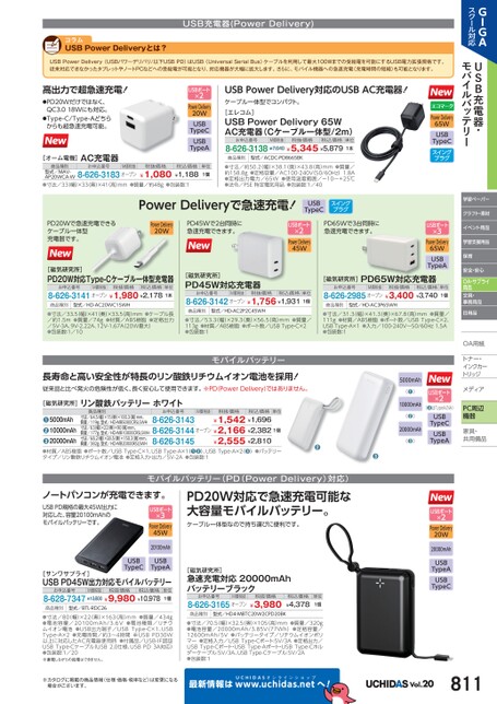 GIGAスクール対応USB充電器・モバイルバッテリー学習ペーパークラフト・素材イベント用品学習支援用品保育安全・安心OA・サプライ用品文具・事務用品日用品OA用紙用紙トナー・トナー・インクカーインクカートリッジメディアィアPC周辺機器家具・具・共用備品用USBポート×2(❸はTypeAのみ)USBTypeCUSBTypeAUSBポート×2PowerDelivery20W20000mAhUSBTypeAUSBTypeCUSB充電器(PowerDelivery)USBPowerDeliveryとは?USBPowerDelivery(USBパワーデリバリ/以下USBPD)はUSB(UniversalSerialBus)ケーブルを利用して最大100Wまでの受給電を可能にするUSB電力拡張規格です。従来対応できなかったタブレットやノートPCなどへの受給電が可能となり、対応機器が大幅に拡大します。さらに、モバイル機器への急速充電(充電時間の短縮)も可能となります。高出力で超急速充電!●PD20Wだけではなく、QC3.018Wにも対応。●Type-C/Type-Aどちらからも超急速充電可能。USBポート×2PowerDeliery20WUSBTypeCUSBTypeAUSBPowerDelivery対応のUSBAC充電器!ケーブル一体型でコンパクト。[エレコム]USBPowerDelivery65WAC充電器(Cケーブル一体型/2m)お申込番号M価税抜税抜価格税込価格8-626-3138¥7,640¥5,345¥5,879単位1本PowerDelivery65WUSBTypeCスイングプラグ[オーム電機]AC充電器商品種別型式/MAV-AP20WCA-Wお申込番号M価税抜税抜価格税込価格8-626-3183オープン¥1,080¥1,188●寸法/33(幅)×33(奥)×41(高)mm●質量/約48g●包装数:1商品種別型式/ACDC-PD8665BK単位1個●寸法/約50.2(幅)×38.1(奥)×43.8(高)mm●質量/約158.8g●定格容量/AC100-240V(50/60Hz)1.8A●定格出力電力/65W●使用温度範囲/-10〜+25℃●法令/PSE特定電気用品●包装数:1/40PowerDeliveryで急速充電!USBTypeCスイングプラグPD65Wで3台同時に急速充電できます。USBポート×3PowerDelivery65WUSBTypeA[磁気研究所]PD65W対応充電器お申込番号M価税抜税抜価格8-626-2985オープン¥3,400¥3,740税込価格単位1個商品種別型式/HD-AC3P65WH●寸法/31.3(幅)×41.3(奥)×67.8(高)mm●質量/111g●材質/ABS樹脂●ポート数/USBType-C×2、USBType-A×1●入力/100-240V〜50/60Hz1.5A●包装数:15000mAh(❶)10000mAh(❷)20000mAh(❸)●●PD20Wで急速充電できるケーブル一体型充電器です。PowerDelivery20WPD45Wで2台同時に急速充電できます。USBポート×2PowerDelivery45W[磁気研究所]PD20W対応Type-Cケーブル一体型充電器お申込番号M価税抜税抜価格税込価格単位8-626-3141オープン¥1,980¥2,1781本商品種別型式/HD-AC20WC15WH●寸法/33.5幅)×41(奥)×33.5(高)mm●ケーブル長/約1.5m●質量/74g●材質/ABS樹脂●定格出力/5V-3A、9V-2.22A、12V-1.67A(20W最大)●包装数:1/10[磁気研究所]PD45W対応充電器お申込番号M価税抜税抜価格税込価格単位8-626-3142オープン¥1,756¥1,9311個商品種別型式/HD-AC2P2C45WH●寸法/53.3(幅)×29.3(奥)×56.5(高)mm●質量/113g●材質/ABS樹脂●ポート数/USBType-C×2●包装数:1モバイルバッテリー長寿命と高い安全性が特長のリン酸鉄リチウムイオン電池を採用!従来品と比べ発火の危険性が低く、長く安心して使用できます。※PD(PowerDelivery)ではありません。商品種別M価税抜税抜価格税込価格単位お申込番号8-626-31438-626-31448-626-3145¥1,542¥1,696¥2,166¥2,382¥2,555¥2,810●●●材質/ABS樹脂●ポート数/USBType-C×1、USBType-A×1(❶❷)、USBType-A×2❸)●バッテリータイプ/リン酸鉄リチウムイオン電池●定格入力・出力/5V-2A●包装数:1オープン1個寸法/64.5(幅)×15(奥)×100.3(高)mm、質量/119g、型式/HD-MB5000CRSLSWH寸法/63(幅)×22(奥)×90(高)mm、質量/177g、型式/HD-MB10000CRSLSWH寸法/68.2(幅)×28.5奥)×150.3(高)mm、質量/382g、型式/HD-MB20000RSLSWH5000mAh10000mAh20000mAh●[磁気研究所]リン酸鉄バッテリーホワイトモバイルバッテリー(PD(PowerDelivery)対応)ノートパソコンが充電できます。USBPD規格の最大45W出力に対応した、容量20100mAhのモバイルバッテリーです。USBポート×3PowerDelivery45W20100mAhPD20W対応で急速充電可能な大容量モバイルバッテリー。ケーブル一体型なので持ち運びに便利です。USBUSBTypeA[サンワサプライ]USBPD45W出力対応モバイルバッテリーTypeCお申込番号M価税抜税抜価格税込価格8-628-7347¥13,800¥9,980¥10,978単位1個商品種別型式/BTL-RDC26●寸法/80(幅)×22(奥)×163(高)mm●質量/434g●電池容量/20100mAh/3.6V●電池種類/リチウムイオン電池●USB出力端子/USBType-C×1、USBType-A×2●充電時間/約3〜4時間※USBPD30W以上に対応したAC充電器使用時●付属品/USB-IF認証USBType-Cケーブル(USB2.0仕様、USBPD3A対応)●包装数:1/20※蓄電しながらの給電はできません。[磁気研究所]急速充電対応20000mAhバッテリーブラックお申込番号M価税抜8-626-3165オープン税抜価格¥3,980税込価格¥4,378単位1個商品種別型式/HD4-MBTC20W2CPD20BK●寸法/70.5幅)×32.5(奥)×105(高)mm●質量/320g●電池容量/20000mAh/3.85V(77Wh)●定格容量/12600mAh/5V●バッテリータイプ/リチウムイオンポリマー●定格入力/USBType-Cポート:5V/3A●定格出力/USBType-Cポート・USBType-Aポート・USBType-Cホルダーケーブル:5V/3A、USBType-Cケーブル:5V/2A●包装数:1※カタログに掲載の商品情報(仕様・価格・税率など)は変更になる場合がございます。最新情報はUCHIDASww.uchidas.netwへ!Vol.20811