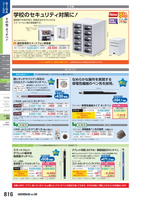 沖縄・離島はサービス対象外432mmその他学校のセキュリティ対策に!透明扉で中身が見え、保管状況がすぐにわかるスマートフォン用の保管庫です。使用例※ACアダプタ、ケーブル、電源タップは付属していません。[サンワサプライ]個別管理用スマートフォン保管庫商品種別型式/CAI-CABSP71お申込番号M価税抜8-625-8571¥63,000税抜価格¥48,500税込価格¥53,350単位1台●寸法/340(幅)×340(奥)×432(高)mm●質量/11.5kg●材質/スチール(エポキシ樹脂粉体塗装)●収納部有効内寸/105(幅)×200(奥)×65高)mm●背面タップ収納スペース内寸/265(幅)×88(奥)×418(高)mm●総耐荷重/30kg各収納部:2kg)●付属品/背面パネル用鍵×2個(1種類)、番号検索キー×1個、ネームプレート用カード×10枚、傷防止用PPシート×10枚、連結用ネジ、アジャスター×4本●お客様取付商品●包装数:1340mmmm043背面※メーカー直送品です。返品はご容赦ください。上記商品は受注日から8営業日以内のお届けになります。導電性繊維タイプペン先の滑りが良く、サラサラとした書き心地です。タッチペン軽いタッチでバツグン反応のGIGAスクール向けタッチペン。ペン先キャップ内に予備の「替ペン先」が付いています。●鉛筆型ユニ色のタッチペン。●「Agファイバーペン先」採用で、軽いタッチで抜群の反応をします。147.2mm特殊繊維を植毛なめらかな操作を実現する導電性繊維のペン先を採用。120mm10本セット1本あたり¥430(税抜)税込価格¥528単位1本[三菱鉛筆]uni(ユニ)タッチペン商品種別お申込番号あずき色¥480[三菱鉛筆]uni(ユニ)タッチペン10本セット8-628-7180型式/TP82-6001PM価税抜¥600税抜価格商品種別お申込番号M価税抜税抜価格税込価格8-628-7182オープンあずき色●寸法/9.8幅)×16.6奥)×147.2高)mm●質量/8.3g●キャップに予備替ペン先1個セット●包装数:1/10※タッチペンの反応が悪くなったり、タッチペン先の色が茶褐色に変化したときが交換時期です。別売の「替ペン先」もございます。¥4,300¥4,730(10本入)単位1セット[エレコム]導電性繊維タイプタッチペン商品種別ブラック型式/P-TPS03BK「まとめ買いパック」は、「1組」単位でお申し込みください。1本8-628-6800M価税抜¥2,170税抜価格¥1,280¥1,408税込価格●寸法/約8(径)×120(長)mm●包装数:1/2401本あたり¥584.7(税抜)まとめ買いパック1組(12本入)8-628-6801ー¥7,016¥7,717取り替え用替ペン先取り替え用替ペン先[三菱鉛筆]uni(ユニ)タッチペン替ペン先5個入×3箱セットお申込番号M価税抜税抜価格税込価格8-628-7183オープン¥1,700¥1,870単位1セット(5個×3箱入)商品種別型式/STT1605P●寸法/8.2幅)×8.2(奥)×7高)mm●質量/0.1g●包装数:1/10替ペン先[エレコム]導電繊維ペン先交換用12個セットお申込番号M価税抜税抜価格税込価格8-628-7250¥1,880¥1,880¥2,068単位1セット(12個入)商品種別型式/P-TIPS03/12●寸法/ペン先:約6mm●包装数:1/25ラバータイプシンプルな静電式画面対応のタッチペンで、高感度です。タブレット学習におすすめ!静電容量式のタッチペン。●約7mmと5mmの2サイズのペン先だから、1本あれば多機種に対応。●持ちやすい安心設計!鉛筆サイズなので1本あたりペンケースに入れて持ち運べます。¥471.2(税抜)130mmまとめ買いパック1組(5本入)8-628-7144オープン¥2,356¥2,591[ソニック]スクールタッチペンシフトプラス商品種別型式/LS-5244-K「まとめ買いパック」は、「1組」単位でお申し込みください。1本8-628-7143¥550M価税抜税抜価格¥507¥557税込価格112mm●寸法/8(径)×130(長)mm●質量/17g●包装数:1/5スマートフォン・タブレット端末用高感度タッチペン。1本あたり¥508(税抜)まとめ買いパック1組(10本入)8-628-6825ー[オーム電機]高感度シンプルタッチペン商品種別型式/ブラックSMP-TPLW1K「まとめ買いパック」は、1本8-628-6680オープンM価税抜「1組」単位で¥5,080¥5,588●寸法/12(幅)×9(奥)×112高)mm●質量/11g●包装数:1税抜価格¥612¥673お申し込みください。税込価格GIGAスクール対応その他・タッチペン学習ペーパークラフト・素材イベント用品学習支援用品保育安全・安心OA・サプライ用品文具・事務用品日用品OA用紙OA用紙トナー・トナー・インクカーインクカートリッジメディアメディPC周辺機器家具・家具共用備品共用備お使いのPC、アプリ、貼っているフィルム等によってタッチペンの反応が違ってきます。まずはお試しで購入されることをお勧めします。Vol.20