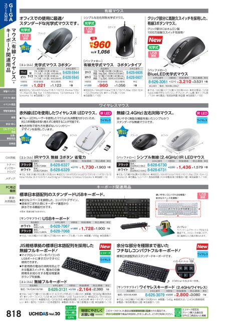 有線マウスシンプルな左右対称光学式マウス。光学式USB接続Sサイズクリック部分に高耐久スイッチを採用した、有線3ボタンマウス。クリック部分にはオムロン製1000万回耐久スイッチを採用!54mm[バッファロー]有線光学式マウス3ボタンタイプ商品種別SサイズMサイズM価税抜¥1,500寸法/54幅)×94奥)×36高)mm、質量/66g、型式/BSMOU050SBKZ寸法/61幅)×100奥)×40高)mm、質量/71g、型式/BSMOU050MBKZ税込価格¥1,056¥960税抜価格お申込番号8-628-66068-628-6607単位1個mm31166mm[バッファロー]BlueLED光学式マウスお申込番号8-626-3061M価税抜税抜価格税込価格単位¥3,210¥3,210¥3,5311個商品種別型式/BSMBU2BKZ光学式USB接続94mm1個税抜¥960税込¥1,056オフィスでの使用に最適!スタンダードな光学式マウスです。光学式USB接続ブラック105mmmm60[エレコム]光学式マウス3ボタン商品種別ブラックホワイトM価税抜¥1,500Mサイズ寸法/60(幅)×105奥)×40高)mm、ケーブル長/1.5m、型式/M-K6URBK/RS寸法/60(幅)×105奥)×40高)mm、ケーブル長/1.5m、型式/M-K6URWH/RS税抜価格税込価格¥1,123¥1,021お申込番号8-628-59448-628-5945単位1個●対応OS/WinXP/Vista/7/8.1/10/10Home/10S/11、macOSBigSur11/Monterey12/Ventura13/Sonoma14●包装数:1/20●対応OS/WinXP/Vista/7/8.1/10/11、MacOSX10.4〜12、ChromeOS●ケーブル長/1.5m●包装数:1/100●寸法/66幅)×113奥)×39高)mm●対応製品/USBType-A端子をもつパソコン、タブレット、ゲーム機●ケーブル長/1.5m●付属品/取扱説明書、保証書●包装数:1/100ワイヤレスマウス赤外線LEDを使用したワイヤレスIRLEDマウス。●ブルーLEDやレーザーを使用したマウスよりも消費電力が小さいため、約2.5年間電池を取り替えずに使用することが可能です。●左右対称で持ち方を選ばないシンメトリーデザインを採用しています。IRLEDワイヤレス無線(2.4GHz)左右対称マウス。使いやすく無駄な機能を省いたシンプルかつスタンダードな無線マウスです。IRLEDワイヤレスブラックホワイトブラックホワイト99.8mm59mm57mmmm69[エレコム]IRマウス無線3ボタン省電力お申込番号商品種別型式/M-IR07DRBK型式/M-IR07DRWHブラックホワイト●寸法/本体:59幅)×99.8奥)×39(高)mm●対応OS/WinXP(SP3)/Vista(SP2)/7SP1)/8.1/11/RT8.1/10/10Home/10S、MacOSX10.10/10.11、macOSBigSur11/Monterey12/Ventura13/Sonoma14●包装数:1/50¥1,730¥1,9038-628-63278-628-6329¥2,7701個税込価格税抜価格M価税抜単位[バッファロー]シンプル無線(2.4GHz)IRLEDマウスお申込番号M価税抜税抜価格税込価格単位商品種別型式/BSMRW21BKZ型式/8-628-6730BSMRW21WHZ8-628-6731ブラックホワイト●寸法/57幅)×96奥)×35(高)mm●対応OS/WinXP/Vista/7/8/8.1/10/11、MacOSX10.4〜12、ChromeOS●付属品/レシーバー、取扱説明書、テスト用電池(単三乾電池×1個)●包装数:1/100¥1,436¥1,579¥2,2801個キーボード関連用品標準日本語配列のスタンダードUSBキーボード。●余分なスペースを排除した、コンパクトデザイン。●液体がこぼれた時にキーボード裏面から排水できる機能付きです。※防水・防滴仕様ではありません。[サンワサプライ]USBキーボードお申込番号商品種別型式/SKB-L1UN型式/SKB-L1UBKNホワイトブラック●寸法/443(幅)×141奥)×27高)mm●ケーブル長/1.4m●質量/490g●包装数:1¥1,980¥1,728¥1,9008-628-70678-628-70681台M価税抜税抜価格税込価格単位使いやすいコンパクトさを実現!余分なスペースを排除!USB接続メンブレンラバードームでキートップを支える構造です。ストロークが長いので、深く確実な入力感が得られます。GIGAスクール対応マウス(有線・ワイヤレス)・キーボード関連用品学習ペーパークラフト・素材イベント用品学習支援用品保育安全・安心OA・サプライ用品文具・事務用品日用品OA用紙OA用紙トナー・トナー・インクカーインクカートリッジメディアメディPC周辺機器家具・家具共用備品共用備JIS規格準拠の標準日本語配列を採用した無線フルキーボード!●マイクロレシーバーをパソコンのUSBポートに挿すだけですぐに使用できます。●不使用時の電池の消耗を防止できる電源スイッチや、電池の交換時期をお知らせする電池残量表示ランプを装備。[エレコム]無線フルキーボード余分な部分を極限まで省いたフチなしコンパクトフルキーボード!標準日本語配列のスタンダードキーボードです。インターネットメールワイヤレスミュート(消音)ワイヤレス3つのショートカットキー付き。商品種別型式/TK-FDM106TBKお申込番号8-626-3131M価税抜税抜価格税込価格¥3,769¥2,164¥2,380単位1台●寸法/447.7(幅)×136(奥)×31.6(スタンド時:40.1)高)mm●質量/約568g電池含まず)●インターフェイス/USB●コネクタ形状/USBType-A(オス)●対応OS/WindowsXP/7/8.1/10/11●通信方式/GFSK方式●電波周波数/2.4GHz帯●キータイプ/メンブレン●キー配列/109キー(日本語配列)●電源(本体)/単三乾電池×1個●包装数:1/10[サンワサプライ]ワイヤレスキーボード(2.4GHzワイヤレス)商品種別型式/SKB-WL40BKお申込番号8-626-3079M価税抜税抜価格税込価格¥3,500¥2,800¥3,080単位1台●寸法/442幅)×140奥)×39高)mm●質量/540g●接続方法/2.4GHz無線接続●電源/単四乾電池×2個●包装数:1/20Vol.20地球にやさしくお買い物このマークのついた商品は地球環境保護に配慮された商品です。グリ