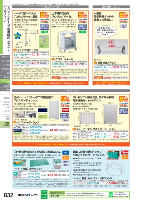 e-黒板、電子情報ボードの授業での板書に。身長差を解消し、児童・生徒の積極性もフォローし、発表の場を広げます。沖縄・離島はサービス対象外アルミニウム製[ウチダ]板書補助ステップお申込番号M価税抜税抜価格税込価格単位8-617-6198オープン¥29,800¥32,7801台商品種別型式/B-1S●寸法/1000(幅)×300奥)×220(高)mm●質量/5.25kg●材質/アルミニウム●包装数:1ノートPC用テーブルやプロジェクター台に最適。●天板は片手で楽に無段階調整することができます。●最下まで下げればデスク下にも収まります。上下昇降可能なプロジェクター台。リモコンなどが置けるホルダー付きで、A4サイズのマニュアルやケーブル、OAタップなど必要な機材をコンパクトに収納できます。沖縄・離島はサービス対象外沖縄・離島はサービス対象外[サンワサプライ]プロジェクター台お申込番号M価税抜税抜価格税込価格単位8-628-6505¥48,000¥43,150¥47,4651台商品種別型式/PR-5●寸法/550(幅)×400(奥)×692〜902(高)mm●質量/18.5kg●材質/スチール(エポキシ粉体塗装)●耐荷重(天板)/30kg(中心荷重15kg)●総耐荷重/60kg●お客様組立商品●包装数:10mm55m400m692〜902mm[ナカキン]UT-45レバーをつまむと上下できます。マルチ昇降テーブルお申込番号M価税抜税抜価格税込価格単位8-617-6302¥29,500¥22,150¥24,3651台商品種別型式/UT-45お申込番号M価税抜税抜価格税込価格単位8-617-6303¥32,000¥24,171¥26,5881台商品種別型式/UT-60●寸法/UT-45:380(幅)×450(奥)×610〜930(高)mm、UT-60:600(幅)×400(奥)×610〜930(高)mm●天板寸法/UT-45:380幅)×450奥)×20厚)mm、UT-60:600(幅)×400(奥)×20(厚)mm●質量/UT-45:6.5kg、UT-60:8.1kg●耐荷重/15kg●材質/本体:スチール角パイプ、天板:低圧メラミン化粧板、キャスター(ストッパー2個付)φ50PA樹脂●お客様組立商品●包装数:1P.795プロジェクターを掲載しております。P.1047踏み台を掲載しております。※メーカー直送品です。返品はご容赦ください。上記商品は受注日から5・8営業日以内のお届けになります。※メーカー直送品です。返品はご容赦ください。上記商品は受注日から8営業日以内のお届けになります。パーティション1500mmフレキシブル間仕切り。気になる視線、飛沫感染をシャットアウト。900mm北海道・沖縄・離島はサービス対象外●自由な形で間仕切り可能。●さりげない半透明タイプ。●軽量で使いやすく、持ち運び可能。900mm沖縄・離島はサービス対象外600mmホワイト防炎約46cm〜180cmまで伸縮自在のクロスパーティション。●薄くて軽くて扱いやすいです。●レイアウト変更にも柔軟に対応が可能です。●クロスは柔らかく透けます。連結パーツインディゴブルー使用例[ライオン事務器]グリーンクロスパーティション商品種別お申込番号M価税抜税抜価格税込価格単位型式/CPA-15W型式/CPA-15DB型式/CPA-15G8-625-85068-625-85308-625-8531ホワイトインディゴブルーグリーン●寸法/462〜1800(幅)×404(奥)×1529(高)mm●質量/7kg●材質/クロス:ポリエステル、支柱:アルミ押出材・アルマイト仕上、ベース:スチール・メラミン焼付塗装●連結パーツ1個付●2方向連結、4方向連結可能●1本の支柱から2方向に連結が可能●(公財)日本防炎協会認定商品●お客様組立商品●包装数:1¥48,980¥53,878¥71,6001台315mm420mmSMALLBIG[フルネス]ニューノーマルパネルパーテーション商品種別お申込番号M価税抜税抜価格SMALL寸法/900幅)×315(奥)×600高)mm、BIG●材質/ポリ塩化ビニル●色/半透明ホワイトウッド●スタンド付●お客様組立商品●包装数:18-617-7123オープン8-617-7124質量/2.8kg、型式/L7300寸法/900幅)×420(奥)×1500(高)mm、質量/5.2kg、型式/L7301¥11,670¥18,230税込価格単位¥12,837¥20,0531台※メーカー直送品につきましては、沖縄および離島はサービス対象外となります。一部商品については、北海道もサービス対象外になります。プロジェクター台板書補助ステッププロジェクター台・板書補助ステップ・パーティション学習ペーパークラフト・素材イベント用品学習支援用品保育安全・安心OA・サプライ用品文具・事務用品日用品OA用紙OA用紙トナー・トナーインクカーインクカートリッジトリッジメディアメディPC周辺PC周辺機器機器家具・共用備品※メーカー直送品です。返品はご容赦ください。上記商品は受注日から8・10営業日以内のお届けになります。パタパタと折りたためて持ち運びも簡単なスノコ。軽量で持ち運びも設置も簡単。マット同士を付属のジョイントで固定ができるのでズレを防ぎ、キレイに敷き詰められます。使用例[テラモト]軽量パタパタマット緑灰お申込番号M価税抜税抜価格税込価格単位商品種別型式/MR-075-020-1型式/MR-075-020-58-611-20738-611-2072¥31,000¥23,763¥26,139緑灰●寸法/2000×900mm●厚さ/13mm●質量/3.2kg●材質/本体:EVA樹脂・ポリエチレン、ジョイント:SPVC、ベルト:ポリエステル・POM樹脂●付属品/ジョイント、ベルト各2個●屋外・屋内用●防炎加工●包装数:1※ジョイントは縦方向もしくは横方向のどちらか一方向にしかできません。※ジョイント、ベルトを紛失された場合は有償での提供となります。あらかじめご了承ください。※