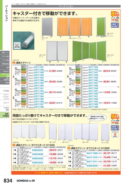 沖縄・離島はサービス対象外4連H1500グリーン(折りたたみ時)4連H1800グリーンM価税抜税抜価格税込価格単位¥86,911¥85,916¥94,507¥81,896¥80,901¥88,9911台¥113,53¥112,658¥123,923¥106,67¥105,972¥116,5691連H1500グレー3連H1500ナチュラル2連H1800ホワイト※メーカー直送品につきましては、沖縄および離島はサービス対象外となります。パーティションキャスター付きで移動ができます。付属のコーナーパーツの交換で、単体でも連結でも使用できます。パーティション学習ペーパークラフト・素材イベント用品学習支援用品保育安全・安心OA・サプライ用品文具・事務用品日用品OA用紙OA用紙トナー・トナー・インクカーインクカートリッジメディアメディPC周辺PC周辺機器機器家具・共用備品●材質/表面材:ポリエチレンクロス(グレー、グリーン)・プリント化粧板(ナチュラル、ホワイト)、枠:アルミ、コーナー・キャスター:ナイロン●お客様組立商品●包装数:1両面たっぷり書けてキャスター付きで移動ができます。●タテ型の両面ホワイトボードです。●連結もでき、キャスター付きで楽に移動できます。連結部は360°回転。収納も省スペースです。沖縄・離島はサービス対象外高さ1800mm寸法/2700(幅)×350奥)mm、質量/15kg高さ1500mm寸法/2700(幅)×350奥)mm、質量/10.5kg高さ1800mm寸法/3600(幅)×350奥)mm、質量/20kg高さ1500mm寸法/3600(幅)×350奥)mm、質量/14kg型式/型式/型式/型式/型式/型式/お申込番号商品種別グレーグリーンナチュラル型式/ホワイトグレーグリーンナチュラル型式/ホワイトグレーグリーンナチュラル型式/ホワイトグレーグリーンナチュラル型式/ホワイトTP3-1809BN-FFYY8-617-7445TP3-1809BN-FFEE8-617-7446TP3-1809BN-NNWW8-617-7447TP3-1809BN-EEWW8-617-7448TP3-1509BN-FFYY8-617-7459TP3-1509BN-FFEE8-617-7460TP3-1509BN-NNWW8-617-7461TP3-1509BN-EEWW8-617-7462TP4-1809BN-FFYY8-617-7449TP4-1809BN-FFEE8-617-7467TP4-1809BN-NNWW8-617-7450TP4-1809BN-EEWW8-617-7451TP4-1509BN-FFYY8-617-7463TP4-1509BN-FFEE8-617-7464TP4-1509BN-NNWW8-617-7465TP4-1509BN-EEWW8-617-7466型式/型式/型式/型式/型式/型式/3連4連M価税抜税抜価格税込価格単位¥31,756¥31,093¥34,202¥30,085¥29,422¥32,3641台¥60,169¥59,174¥65,091¥56,826¥55,831¥61,414高さ1800mm寸法/900幅)×350奥)mm、質量/5kg高さ1500mm寸法/900幅)×350奥)mm、質量/3.5kg高さ1800mm寸法/1800(幅)×350奥)mm、質量/10kg高さ1500mm寸法/1800(幅)×350奥)mm、質量/7kg型式/型式/型式/型式/型式/お申込番号TP1-1509BN-NNWW型式/商品種別グレーグリーンナチュラル型式/ホワイトグレーグリーンナチュラル型式/ホワイトグレーグリーンナチュラル型式/ホワイトグレーグリーンナチュラル型式/ホワイトTP1-1809BN-FFYY8-617-7437TP1-1809BN-FFEE8-617-7438TP1-809BN-NWW8-617-7439TP1-1809BN-EEWW8-617-7440TP1-1509BN-FFYY8-617-7452TP1-1509BN-FFEE8-617-74688-617-7453TP1-1509BN-EEWW8-617-7454TP2-1809BN-FFYY8-617-7441TP2-1809BN-FFEE8-617-7442TP2-809BN-NWW8-617-7443TP2-1809BN-EEWW8-617-7444TP2-1509BN-FFYY8-617-7455TP2-1509BN-FFEE8-617-7456TP2-509BN-NWW8-617-7457TP2-1509BN-EEWW8-617-7458型式/型式/型式/型式/型式/型式/1連2連[コマイ]連結スクリーン[コマイ]4連H15001連H18002連H18003連H1800折りたたみ時連結スクリーンホワイトボードH1500商品種別寸法/900幅)×350奥)×1500(高)mm、質量/7㎏、型式/TP1-1509BN-SSWW寸法/1800(幅)×350奥)×1500(高)mm、質量/14.5㎏、型式/TP2-1509BN-SSWW寸法/2700(幅)×350奥)×1500(高)mm、質量/22㎏、型式/TP3-1509BN-SSWW寸法/3600(幅)×350奥)×1500(高)mm、質量/29.5㎏、型式/TP4-1509BN-SSWW1連2連3連4連お申込番号M価税抜税抜価格税込価格単位8-625-84318-625-84328-625-84338-625-8434オープン¥38,610¥42,471¥75,680¥83,248¥112,740¥124,014¥149,800¥164,7801台●材質/表面材:スチールホワイト(段ボール芯)、枠:アルミ、コーナー・ベースキャップ:PA樹脂、連結部:強化PA樹脂、キャスターベース:アルミ、キャスター:PA樹脂(ストッパー付)●お客様組立商品●包装数:1/21連)、1/3(2連)、1/43連)、1/5(4連)[コマイ]連結スクリーンホワイトボードH1800商品種別寸法/900幅)×350奥)×1800(高)mm、質量/10kg、型式/TP1-1809BN-SSWW寸法/1800(幅)×350奥)×1800(高)mm、質量/20kg、型式/TP2-1809BN-SSWW寸法/2700(幅)×350奥)×1800(高)mm、質量/30kg、型式/TP3-1809BN-SSWW寸法/3600(幅)×350奥)×1800(高)mm、質量/38㎏、型式/TP4-1809BN-SSWW1連2連3連4連お申込番号M価税抜税抜価格税込価格単位8-617-7469¥36,770¥36,107¥39,717¥70,408¥77,4488-617-7470¥71,7018-617-7471¥106,633¥104,709¥115,1798-625-8435オープン¥131,500¥144,6501台●材質/表面材:鋼板、枠:アルミ、コーナー・キャスター:ナイロン●お客様組立商品●包装数:1※メーカー直送品です。返品はご容赦ください。上記商品は受注日から8・15営業日以内のお届けになります。834Vol.20