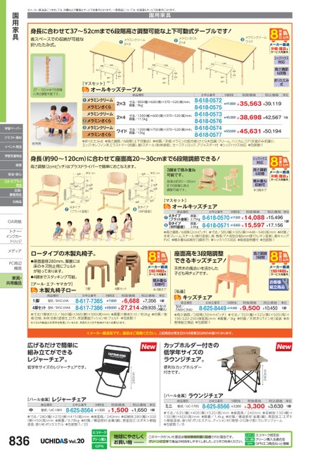 ※メーカー直送品につきましては、沖縄および離島はサービス対象外となります。一部商品については、北海道もサービス対象外になります。園用家具身長に合わせて37〜52cmまで6段階高さ調整可能な上下可動式テーブルです!省スペースでの収納が可能な折りたたみ式。❶メラミンクリーム❷メラミンさくら2×32×460090020520〜37028φ600120020520〜37028φ25φ750120020520〜37028φ25φ37〜52cmまで6段階に高さ調整可能です。[マスセット]25φオールキッズテーブル商品種別❸メラミンクリームワイド沖縄・離島はサービス対象外シックハウス対応高さ調節6段階折りたたみ式お申込番号8-618-05728-618-05758-618-05738-618-05768-618-05748-618-0577M価税抜税抜価格税込価格単位¥41,800¥35,563¥39,119¥45.300¥38,698¥42,5671台¥53,500¥45,631¥50,1942×3寸法/900幅)×600奥)×370〜520(高)mm、質量/9kg2×4寸法/1200(幅)×600(奥)×370〜520高)mm、質量/11.5kgワイド寸法/1200(幅)×750(奥)×370〜520高)mm、質量/13kgメラミンクリームメラミンさくらメラミンクリームメラミンさくらメラミンクリームメラミンさくら●●●使用例●折りたたみ式●高さ調節/6段階(上下可動式)●材質/天板:メラミン化粧合板(さくら木目調・クリーム、ハニカムコア(天面のみ抗菌))、エッジ:オレフィン系エラストマー(抗菌)、脚:スチール(粉体塗装)、セーフティロック、アジャスター付●シックハウス対応●包装数:1身長(約90〜120cm)に合わせて座面高20〜30cmまで6段階調節できる!高さ調整(2cmピッチ)はプラスドライバーで簡単におこなえます。単位:cm単位:cm3脚まで積み重ね可能です。座面は約20〜30cmまで6段階に高さ調整可能です。シックハウス対応高さ調節6段階積み重ね収納可※3脚まで沖縄・離島はサービス対象外お申込番号M価税抜税抜価格税込価格8-618-0570¥17,200¥14,088¥15,4968-618-0571¥18,900¥15,597¥17,156単位1脚商品種別質量/2.75kg質量/2.8kgAタイプ(フラット座板)Bタイプ(WR座板)●●●高さ調節/6段階(2cmピッチ)●寸法/385幅)×305(奥)×448〜548高)mm●材質/本体フレーム:スチール(焼付塗装)、座・背板:ブナ成型合板6mm厚(ウレタン塗装)、脚キャップ:PVC●積み重ね収納可(3脚まで)●シックハウス対応●取扱説明書付●包装数:1[マスセット]オールキッズチェア座面高を3段階調整できるキッズチェア!天然木の風合いを活かした子ども用チェアです。高さ調節3段階北海道・沖縄・離島はサービス対象外[弘益]キッズチェア商品種別型式/FAM-C(NA)お申込番号M価税抜8-625-8449¥14,400税抜価格¥9,500税込価格¥10,450単位1脚●高さ調節/3段階(30mmピッチ)●寸法/350(幅)×325(奥)×500(高)×190・220・250(座面高)mm●質量/3㎏●材質/天然木(パイン材)塗装●お客様組立商品●包装数:1●Aタイプ(フラット座板)●Bタイプ(WR座板)ロータイプの木製丸椅子。●座面直径280mm、脚裏には床のキズ防止用にフェルトが貼ってあります。●4脚までスタッキング可能。[アール・エフ・ヤマカワ]木製丸椅子ロー1脚4脚セット北海道・沖縄・離島はサービス対象外積み重ね収納可※4脚まで商品種別型式/SHSC-LNAお申込番号税抜価格1脚4脚セット(4脚入)●寸法(1脚あたり)/360(幅)×360(奥)×300(高)mm●質量(1脚あたり)/約2kg●材質/座板:合板、本体:合板(塗装仕上げ)、床設置面クッション材:フェルト●包装数:1※こちらの商品は天然木を使用しているため、木目の入り方や色味が1点1点異なります。¥28,600¥27,214¥29,9351セット8-617-73858-617-7386型式/SHSC-LNA4¥6,688税込価格¥7,356単位1脚M価税抜¥7,600※メーカー直送品です。返品はご容赦ください。上記商品は受注日から8営業日以内のお届けになります。240mmカップホルダー付きの低学年サイズのラウンジチェア。便利なカップホルダー付きです。240mm広げるだけで簡単に組み立てができるレジャーチェア。低学年サイズのレジャーチェアです。[パール金属]商品種別型式/UC-1801レジャーチェアお申込番号中●寸法/280幅)×270(奥)×415(高)mm●座面高/240mm●収納時:280幅)×330(奥)×50(高)mm●質量/0.78kg●材質/構造部材:金属(鋼)、表面加工:エポキシ樹脂8-625-8564¥1,500M価税抜¥1,500税抜価格税込価格¥1,650単位1脚塗装、張り材:ポリエステル●包装数:1/20[パール金属]商品種別型式/UC-1705ラウンジチェアお申込番号8-625-8566ミニ●寸法/635(幅)×400(奥)×520(高)mm●座面高/240mm●収納時:130(幅)×130(奥)×600高)mm●質量/1.4kg●材質/構造部材:金属(鋼)、表面加工:エポキシ樹脂塗装、張り材:ポリエステル、クッション材(背部・ひじ掛け部):ウレタンフォーム●包装数:1/8¥3,300M価税抜¥3,300税抜価格税込価格¥3,630単位1脚Vol.20地球にやさしくお買い物このマークのついた商品は地球環境保護に配慮された商品です。グリーンの文字で商品の判別をしやすくしました。どうぞご利用ください。エコマーク認定品グリーン購入法適合品GPNエコ商品ねっと掲載園用家具学習ペーパークラフト・素材イベント用品学習支援用品保育安全・安心OA・サプライ用品文具・事務用品日用品OA用紙OA用紙トナー・トナー・インクカーインクカートリッジメディアメディPC周辺PC周辺機器機器家具・共用備品