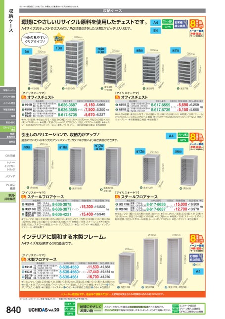 沖縄・離島はサービス対象外604mm320mm●浅型7段390mm中身の見やすいクリアタイプ!6段320mm10段320mm浅4段中3段320mm浅8段320mm浅7段※メーカー直送品につきましては、沖縄および離島はサービス対象外となります。収納ケース環境にやさしいリサイクル原料を使用したチェストです。A4サイズのチェストでは入らない角2封筒(封をした状態)がピッタリ入ります。A4B4収納ケース681mm0mm93●浅型8段680mm390mm[アイリスオーヤマ]オフィスチェスト1084mm●中型10段mm390●浅型4段・中型3段680mm●中型6段390mm[アイリスオーヤマ]オフィスチェスト●A4/B4収納●引出し内寸/260(幅)×365奥)×55高)mm●材質/天板・フレーム:ポリプロピレン、引出し:スチロール樹脂●キャスター(50(高)mm)付(ストッパーなし)●色/ライトグレー●お客様組立商品●包装数:1商品種別お申込番号M価税抜税抜価格税込価格単位¥5,690¥6,259¥5,150¥5,6651台浅型8段寸法/320(幅)×390(奥)×681(高)mm、浅型7段寸法/320(幅)×390(奥)×604(高)mm、質量/4.509kg、型式/OCE-S800R質量/4kg、型式/OCE-S700R8-617-6555オープン8-617-6736●●1台商品種別お申込番号M価税抜税抜価格税込価格単位オープン¥5,150¥5,665¥7,500¥8,250¥5,670¥6,237寸法/320(幅)×390(奥)×680(高)mm、質量/4kg、型式/OCE-600R寸法/320(幅)×390(奥)×1084(高)mm、質量/6.5kg、型式/OCE-1000R寸法/320(幅)×390(奥)×680(高)mm、質量/4.3kg、型式/OCE-S403AR8-636-36878-636-36858-617-6735中型6段中型10段浅型4段・中型3段●●●●A4/B4収納●引出し内寸/浅型:260幅)×365奥)×55(高)mm、中型:260幅)×365(奥)×77(高)mm●材質/天板・フレーム:ポリプロピレン、引出し:スチロール樹脂●キャスター(50高)mm)付(ストッパーなし)●色/ライトグレー●お客様組立商品●包装数:1引出しのバリエーションで、収納力がアップ!底面に付いているネジ式のアジャスターで、ガタツキが無いよう高さ調節ができます。291mm深9段浅18段浅12段深3段浅12段291mm深6段沖縄・離島はサービス対象外A4●深型6段605mmmm033●浅型12段874mmmm033●深型9段単位1台お申込番号M価税抜税抜価格税込価格浅型12段質量/7.8kg、深型6段型式/SFE-61208-617-6636オープン¥15,000¥16,500¥12,700¥13,970型式/SFE-60068-617-6637質量/7.3kg、●●商品種別●寸法/291(幅)×330(奥)×605(高)mm●引出し内寸/浅型:239(幅)×312(奥)×38(高)mm、深型:234(幅)×310(奥)×82(高)mm●材質/本体:スチール・エポキシ粉体塗装、引出し:スチロール樹脂、レール:ポリプロピレン●色/ホワイト●包装数:1[アイリスオーヤマ]スチールフロアケース●浅型18段●浅型12段・深型3段お申込番号8-636-38788-636-38778-636-4231M価税抜税抜価格税込価格単位オープン¥15,300¥16,830¥15,400¥16,9401台商品種別深型9段浅型18段浅型12段・深型3段質量/10.4kg、型式/SFE-8009質量/11.5kg、型式/SFE-8180質量/11.2kg、型式/SFE-8123●●●●寸法/291(幅)×330(奥)×874(高)mm●引出し内寸/浅型:239(幅)×312(奥)×38(高)mm、深型:234(幅)×310(奥)×82(高)mm●材質/本体:スチール・エポキシ粉体塗装、引出し:スチロール樹脂、レール:ポリプロピレン●色/ホワイト●付属品/インデックスシール●包装数:1[アイリスオーヤマ]スチールフロアケース沖縄・離島はサービス対象外(●のみ)A41100mm0mm53浅型17段・深型3段1100mm0mm53●●浅型23段289mm700mm0mm53●浅型13段お申込番号8-636-45598-636-45608-636-4561M価税抜オープン税抜価格税込価格単位¥11,530¥12,683¥17,440¥19,184¥16,700¥18,3701台商品種別寸法/289幅)×350(奥)×700(高)mm、質量/10kg、型式/MFE-7130寸法/289幅)×350(奥)×1100高)mm、質量/15.7kg、型式/MFE-1230寸法/289幅)×350(奥)×1100高)mm、質量/15.7kg、型式/MFE-1173浅型13段浅型23段浅型17段・深型3段●●●[アイリスオーヤマ]木製フロアケース●引出し内寸/浅型:239(幅)×312(奥)×38高)mm、深型:234(幅)×310(奥)×82(高)mm●材質/本体:プリント化粧紙パーティクルボード、引出し:スチロール樹脂、キャスター(●⓫のみ)ポリプロピレン樹脂●付属品/キャスター(●⓫のみ)●お客様組立商品(●⓫のみ)●包装数:1インテリアに調和する木製フレーム。A4サイズを収納するのに最適です。289mm289mm※キャスターは付いていない状態で納品されます。一度取り付けると取り外しが不可能です。※メーカー直送品です。返品はご容赦ください。上記商品は受注日から8営業日以内のお届けになります。840Vol.20地球にやさしくお買い物このマークのついた商品は地球環境保護に配慮された商品です。グリーンの文字で商品の判別をしやすくしました。どうぞご利用ください。エコマーク認定品グリーン購入法適合品GPNエコ商品ねっと掲載学習ペーパークラフト・素材イベント用品学習支援用品保育安全・安心OA・サプライ用品文具・事務用品日用品OA用紙OA用紙トナー・トナー・インクカーインクカートリッジメディアメディPC周辺PC周辺機器機器家具・共用備品