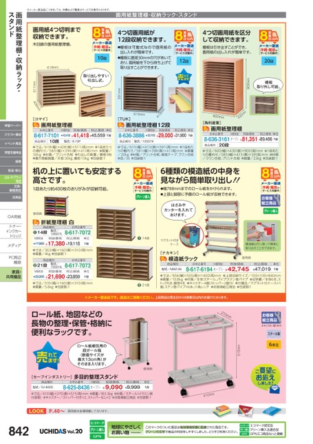 4つ切画用紙が12段収納できます。●棚板は可動式なので画用紙の出し入れが簡単です。●棚板に直径30mmの穴があいており、画用紙を下から持ち上げて取り出すことができます。4つ切画用紙を区分して収納できます。棚板は引き出すことができ、画用紙の出し入れが簡単です。沖縄・離島はサービス対象外20段沖縄・離島はサービス対象外12段591mm沖縄・離島はサービス対象外10段取り出しやすい引出し式。画用紙4つ切判まで収納できます。木目調の画用紙整理棚。618mm511mm428mm棚板取り外し可能。900mm430mm615mm413mm[TUK]画用紙整理棚12段600mm[角利産業]画用紙整理棚[コマイ]画用紙整理棚お申込番号8-617-710110段商品種別M価税抜税抜価格税込価格単位¥43,435¥41,418¥45,5591台お申込番号M価税抜税抜価格税込価格8-636-3886¥33,00¥29,000¥31,900単位1台型式/K-10P商品種別型式/105074●寸法/618(幅)×428(奥)×511(高)mm●1段あたりの棚内寸/580(幅)×396(奥)×41(高)mm●質量/30kg●材質/プリント合板●引出しの数量/棚板9枚●最大積載質量/天板:30kg、棚板:10kg●包装数:1●寸法/615(幅)×413奥)×591(高)mm●1段あたりの棚内寸/581(幅)×398(奥)×41(高)mm●質量/20kg●材質/プリント合板、樹脂テープ、ラワン合板●色/白●包装数:1お申込番号M価税抜税抜価格税込価格単位8-636-3161オープン¥81,351¥89,4861台商品種別20段●寸法/600(幅)×430(奥)×900高)mm●1段あたりの棚内寸/585幅)×415(奥)×39(高)mm●材質/ラワン合板、プリント合板●質量/23kg●包装数:1机の上に置いても安定する高さです。1段あたり約400枚のおりがみが収納可能。6種類の模造紙の中身を見ながら簡単取り出し!!●幅788mmまでのロール紙をかけられます。●上部と脚部に予備のロール紙が収納できます。沖縄・離島はサービス対象外沖縄・離島はサービス対象外※メーカー直送品につきましては、沖縄および離島はサービス対象外となります。画用紙整理棚・収納ラック・スタンド使用例折紙整理棚白商品種別14段●M価税抜型式/105015税抜価格お申込番号8-617-7072税込価格¥17,900¥17,380¥19,118単位1台●寸法/363幅)×160奥)×310高)mm●質量/4kg●包装数:1商品種別21段●M価税抜型式/105016税抜価格お申込番号8-617-7073税込価格¥22,200¥21,690¥23,859単位1台●寸法/535幅)×160奥)×310高)mm●質量/5.6kg●包装数:1はさみやカッターを入れておけます。●14段マグネット付きケース[ナカキン]模造紙ラック模造紙は引っ張って簡単に取り出すことができます。使用例商品種別型式/NMZ-06お申込番号M価税抜税抜価格8-617-6194オープン¥42,745税込価格¥47,019単位1台●21段●寸法/856幅)×505奥)×1400高)mm●上部収納サイズ/100×100×840mm●質量/10.8kg●材質/本体:スチール、パイプ:ステン巻パイプ●収容量/本体6本、ストック6本、脚部4本●キャスター4個(ストッパー2個付)●付属品/マグネット付ケース×1個、ステン巻パイプ×6本、六角レンチ●お客様組立商品●包装数:1※メーカー直送品です。返品はご容赦ください。上記商品は受注日から8営業日以内のお届けになります。270mm※キャスター取り付けスチール製6本立515mm使用例税込価格¥9,999単位1台ロール紙、地図などの長物の整理・保管・格納に便利なラックです。ロール紙梱包用の段ボール箱(断面サイズが最大13cm角)がそのまま入ります。[セーブインダストリー]多目的整理スタンド商品種別型式/SV-8005お申込番号M価税抜8-625-8436オープン税抜価格¥9,090●寸法/410(幅)×270(奥)×515高)mm●質量/約3.3kg●材質/スチール(メラミン焼付塗装)●キャスター/ストッパー付き×2、ストッパーなし×2●お客様組立商品●包装数:1m0m14LOOKP.40〜画用紙を各種掲載しております。842Vol.20地球にやさしくお買い物このマークのついた商品は地球環境保護に配慮された商品です。グリーンの文字で商品の判別をしやすくしました。どうぞご利用ください。エコマーク認定品グリーン購入法適合品GPNエコ商品ねっと掲載画用紙整理棚・収納ラック・スタンド学習ペーパークラフト・素材イベント用品学習支援用品保育安全・安心OA・サプライ用品文具・事務用品日用品OA用紙OA用紙トナー・トナー・インクカーインクカートリッジメディアメディPC周辺PC周辺機器機器家具・共用備品