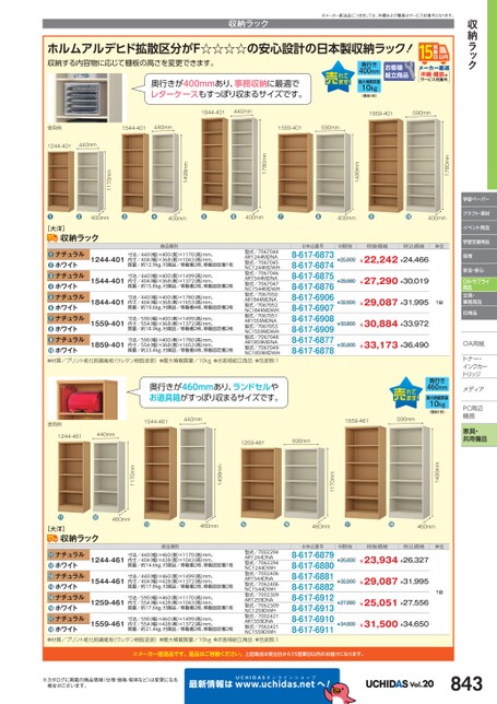 収納ラック学習ペーパークラフト・素材イベント用品学習支援用品保育安全・安心OA・サプライ用品文具・事務用品日用品OA用紙用紙トナー・トナー・インクカーインクカートリッジメディアィアPC周辺辺機器器家具・共用備品収納ラック※メーカー直送品につきましては、沖縄および離島はサービス対象外となります。ホルムアルデヒド拡散区分がF☆☆☆☆の安心設計の日本製収納ラック!収納する内容物に応じて棚板の高さを変更できます。奥行きが400mmあり、事務収納に最適でレターケースもすっぽり収まるサイズです。奥行き400mm最大積載質量10kg(棚板1枚)沖縄・離島はサービス対象外1780mm1499mm1780mm1499mm1170mm1244-401440mm使用例1544-401440mm1559-401590mm1844-401440mm1859-401590mm●●400mm●●400mm●●400mm●●400mm●●400mmお申込番号8-617-68738-617-68748-617-68758-617-68768-617-69068-617-69078-617-69088-617-69098-617-68778-617-6878M価税抜税抜価格税込価格単位¥25,800¥22,242¥24,466¥29,980¥27,290¥30,019¥32,800¥29,087¥31,9951台¥33,800¥30,884¥33,972¥35,800¥33,173¥36,490商品種別1544-4011844-4011244-401寸法/440幅)×400(奥)×1170高)mm、内寸/404幅)×368(奥)×1043高)mm、質量/約12.9kg、付属品/移動棚2枚、移動固定棚1枚寸法/440幅)×400(奥)×1499高)mm、内寸/404幅)×368(奥)×1372高)mm、質量/約15.8kg、付属品/移動棚2枚、移動固定棚2枚ナチュラルホワイトナチュラルホワイトナチュラルホワイトナチュラルホワイトナチュラルホワイト型式/7067044AR1244MDNA型式/7067045NC1244MDWH型式/7067046AR1544MDNA型式/7067047NC1544MDWH型式/7067050AR1844MDNA型式/7067052NC1844MDWH型式/7067051AR1559MDNA型式/7067053NC1559MDWH型式/7067048AR1859MDNA型式/7067049NC1859MDWH●材質/プリント紙化粧繊維板(ウレタン樹脂塗装)●最大積載質量/10kg●お客様組立商品●包装数:1寸法/440幅)×400(奥)×1780高)mm、内寸/404幅)×368(奥)×1653高)mm、質量/約19.6kg、付属品/移動棚4枚、移動固定棚2枚寸法/590幅)×400(奥)×1499高)mm、内寸/554幅)×368(奥)×1372高)mm、質量/約18.9kg、付属品/移動棚2枚、移動固定棚2枚寸法/590幅)×400(奥)×1780高)mm、内寸/554幅)×368(奥)×1653高)mm、質量/約23.4kg、付属品/移動棚4枚、移動固定棚2枚1559-4011859-401●●●●●●●●●●[大洋]収納ラック奥行き460mm最大積載質量10kg(棚板1枚)1499mm奥行きが460mmあり、ランドセルやお道具箱がすっぽり収まるサイズです。使用例1244-461440mm1544-461440mm1559-461590mm1259-461590mm1170mm1499mm1170mm●材質/プリント紙化粧繊維板(ウレタン樹脂塗装)●最大積載質量/10kg●お客様組立商品●包装数:1※メーカー直送品です。返品はご容赦ください。上記商品は受注日から15営業日以内のお届けになります。※カタログに掲載の商品情報(仕様・価格・税率など)は変更になる場合がございます。最新情報はUCHIDASww.uchidas.netwへ!Vol.20843型式/7002294AR1244DNA型式/7062294NC1244DWH型式/7002406AR1544DNA型式/7062406NC1544DWH型式/7002309AR1259DNA型式/7062309NC1259DWH型式/7002421AR1559DNA型式/7062421NC1559DWHお申込番号8-617-68798-617-68808-617-68818-617-68828-617-69128-617-69138-617-69108-617-6911M価税抜税抜価格税込価格単位¥26,800¥23,934¥26,327¥32,800¥29,087¥31,995¥27,980¥25,051¥27,5561台¥34,800¥31,500¥34,650商品種別1244-461寸法/440幅)×460(奥)×1170高)mm、内寸/404幅)×428(奥)×1043高)mm、質量/約14.6kg、付属品/移動棚2枚、移動固定棚1枚1544-461寸法/440幅)×460(奥)×1499高)mm、内寸/404幅)×428(奥)×1372高)mm、質量/約17.8kg、付属品/移動棚2枚、移動固定棚2枚1259-461寸法/590幅)×460(奥)×1170高)mm、内寸/554幅)×428(奥)×1043高)mm、質量/約17.6kg、付属品/移動棚2枚、移動固定棚1枚1559-461寸法/590幅)×460(奥)×1499高)mm、内寸/554幅)×428(奥)×1372高)mm、質量/約21.4kg、付属品/移動棚2枚、移動固定棚2枚ナチュラルホワイトナチュラルホワイトナチュラルホワイトナチュラルホワイト●●●●●●●●●●460mm[大洋]収納ラック●●460mm●●460mm●●460mm