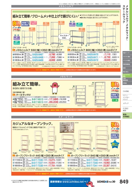 メタルシェルフ・メタルラック・スチールラック学習ペーパークラフト・素材イベント用品学習支援用品保育安全・安心OA・サプライ用品文具・事務用品日用品OA用紙用紙トナー・トナー・インクカーインクカートリッジメディアィアPC周辺辺機器器家具・共用備品※メーカー直送品につきましては、沖縄および離島はサービス対象外となります。一部商品については、北海道もサービス対象外になります。メタルシェルフポール直径19mm組み立て簡単!クロームメッキ仕上げでびにくい!●クギやネジを使わずに簡単に組み立てることができます。●棚の高さを自由に変えることができます。ポール直径19mm高さ830mm沖縄・離島はサービス対象外高さ1260mm高さ1490mm●●〜❸幅550mmキャスター付き。奥行350mm●●●●●〜幅800mm高さ1260mm高さ1490mm奥行350mm高さ830mm※キャスター4個のうち2個は、ストッパー付きです。[アイリスオーヤマ]●●※キャスター4個のうち2個は、ストッパー付きです。●メタルシェルフ800(幅)×350(奥)mmタイプM価税抜税抜価格税込価格単位¥7,110¥7,821¥8,750¥9,625¥9,640¥10,6041台オープンお申込番号8-625-84708-625-84718-625-8472商品種別質量/6.3kg、型式/SEM-8008質量/8.8kg、型式/SEM-8012質量/9.3kg、型式/SEM-8015830(高)mm、3段1260(高)mm、4段1490(高)mm、4段●●●メタルシェルフ550(幅)×350(奥)mmタイプお申込番号8-625-84678-625-84688-625-8469M価税抜オープン税抜価格¥5,780¥7,260¥8,000税込価格単位¥6,358¥7,986¥8,8001台商品種別質量/5.4kg、型式/SEM-5508質量/7.6kg、型式/SEM-5512質量/8.1kg、型式/SEM-5515830(高)mm、3段1260(高)mm、4段1490(高)mm、4段●●●●ポール直径/19mm●材質/板・ポール:スチール(クロームメッキ仕上げ)、キャスター:ナイロン樹脂、棚板固定部品:ABS樹脂●最大積載質量/全体(静止時)約150kg、棚板1枚あたり:約50kg●お客様組立商品●包装数:1※上記商品本体サイズ高さはキャスターを含みます。●ポール直径/19mm●材質/棚板・ポール:スチール(クロームメッキ仕上げ)、キャスター:ナイロン樹脂、棚板固定部品:ABS樹脂●最大積載質量/全体(静止時)約150kg、棚板1枚あたり:約50kg●お客様組立商品●包装数:1※上記商品本体サイズ高さはキャスターを含みます。[アイリスオーヤマ]※メーカー直送品です。返品はご容赦ください。上記商品は受注日から8営業日以内のお届けになります。メタルラック沖縄・離島はサービス対象外800mm260mm800mm260mm1800mm●高さ1800mm●高さ1500mm1500mm単位1台お申込番号M価税抜税抜価格8-617-6512¥19,300¥17,580¥19,3388-617-6513¥22,900¥20,230¥22,253税込価格●寸法/800(幅)×260(奥)mm●色/アイボリー●棚可動/45mmピッチ●材質/冷間圧縮鋼板●均等荷重/15kg(段)●お客様組立商品●包装数:1クールラックIV型式/0003-0330型式/0003-0430商品種別高さ1500mm、質量/16.6kg高さ1800mm、質量/19.2kg●●[東洋事務器工業]組み立て簡単。多目的に使用できる棚。※メーカー直送品です。返品はご容赦ください。上記商品は受注日から8営業日以内のお届けになります。スチールラック北海道・沖縄・離島はサービス対象外1800mm1455mm使用例1110mm●350mm840mm●350mm840mm350mm840mm[弘益]1800mm1455mm1110mm●440mm350mm●440mm350mm●440mm350mm●[弘益]カジュアルなオープンラック。棚板は115mmピッチで高さ調節が可能です。※天板と底板は固定となります。●材質/フレーム:スチール(粉体塗装)、棚板:MDFPVC貼り)●最大積載質量/40kg(商品全体)●棚可動/115mmピッチ●お客様組立商品●包装数:1●材質/フレーム:スチール(粉体塗装)、棚板:MDFPVC貼り)●最大積載質量/40kg(商品全体)●棚可動/115mmピッチ●お客様組立商品●包装数:1※メーカー直送品です。返品はご容赦ください。上記商品は受注日から15営業日以内のお届けになります。※カタログに掲載の商品情報(仕様・価格・税率など)は変更になる場合がございます。最新情報はUCHIDASww.uchidas.netwへ!Vol.208491台オープンフリーラック840(幅)×350(奥)mmタイプ商品種別お申込番号M価税抜税抜価格税込価格単位1110(高)mm質量/22kg、1455(高)mm質量/27kg、1800(高)mm質量/29kg、型式/VKR-4NA)8-617-7339¥24,200¥16,661¥18,327型式/VKR-5NA)8-617-7340¥28,000¥18,982¥20,880型式/VKR-6NA)8-617-7341¥33,000¥22,287¥24,515●●●1台オープンフリーラック440(幅)×350(奥)mmタイプ商品種別お申込番号M価税抜税抜価格税込価格単位1110(高)mm質量/13kg、1455(高)mm質量/16kg、1800(高)mm質量/18.5kg、型式/VKR-S4(NA)8-617-7336¥19,000¥13,274¥14,601型式/VKR-S5(NA)8-617-7337¥22,600¥15,504¥17,054型式/VKR-S6(NA)8-617-7338¥26,400¥17,754¥19,529●●●
