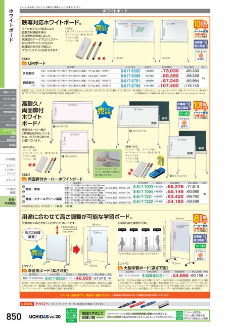 沖縄・離島はサービス対象外1210mm910mm1810mm910mmホワイトボード※メーカー直送品につきましては、沖縄および離島はサービス対象外となります。映写対応ホワイトボード。マイカセラミック製法により拡散反射機能を高め、広視野角を実現しました。高輝度のデータプロジェクターからOHPやスライドなどの低輝度のものまで幅広いプロジェクターに対応できます。〈付属品〉・UMメラミンフォームイレーザー・ボードマーカー(黒・赤)各1本・マグネット2個・ペントレー1個[馬印]UMボード商品種別片面脚付両面脚付(※)寸法/1326(幅)×610奥)×1840(高)mm、質量/19.1kg、型式/UM34T寸法/1926(幅)×610奥)×1840(高)mm、質量/24kg、型式/UM36T寸法/1326(幅)×610奥)×1840(高)mm、質量/19.1kg、型式/UM34TD寸法/1926(幅)×610奥)×1840(高)mm、質量/25.7kg、型式/UM36TDUM36TUM34Tお申込番号8-617-65858-617-65868-617-67918-617-6790M価税抜¥80,600¥97,800¥98,900¥121,800税抜価格¥73,030¥89,390¥87,240¥107,400単位1台税込価格¥80,333¥98,329¥95,964¥118,140●板面寸法/UM34T・UM34TD:1210幅)×910高)mm、UM36T・UM36TD:1810(幅)×910高)mm●付属品/UMメラミンフォームイレーザー×1個、ボードマーカー(黒・赤)×各1本、マグネット×2個●お客様組立商品●包装数:1/2(※)両面脚付タイプは表面:映写対応ホワイトボード/裏面:ホーローホワイトボードになります。ホワイトボード学習ペーパークラフト・素材イベント用品学習支援用品保育安全・安心OA・サプライ用品文具・事務用品日用品OA用紙OA用紙トナー・トナー・インクカーインクカートリッジメディアメディPC周辺PC周辺機器機器家具・共用備品お申込番号8-617-70938-617-70948-617-72218-617-7222M価税抜¥91,000¥78,400¥90,600¥77,400税抜価格¥65,376¥55,146¥63,420¥54,180税込価格¥71,913¥60,660¥69,762¥59,598単位1台沖縄・離島はサービス対象外1210mm910mm●MSH34TDN〈●●付属品〉・イレーザー1個・ラーフル1個・ホワイトボードマーカー(黒・赤)各1本・チョーク10本・マグネット2個・ペントレー1個●MSH36TDN1810mm910mmワンタッチストッパーのプッシュ部を押すと板面が軽く回転できます。寸法/1926(幅)×610(奥)×1840(高)mm、板面寸法/1810(幅)×910高)mm、質量/26.2kg、型式/MH36TDN寸法/1326(幅)×610(奥)×1840(高)mm、板面寸法/1210(幅)×910高)mm、質量/19.9kg、型式/MH34TDN寸法/1926(幅)×610(奥)×1840(高)mm、板面寸法/1810(幅)×910高)mm、質量/24.6kg、型式/MSH36TDN寸法/1326(幅)×610(奥)×1840(高)mm、板面寸法/1210(幅)×910高)mm、質量/19.4kg、型式/MSH34TDN無地/無地無地/スチールグリーン黒板❷●●●●お客様組立商品●包装数:1/2(●●)、1●●)用途に合わせて高さ調整が可能な学習ボード。[馬印]両面脚付ホーローホワイトボード商品種別1210mm910mm●MH34TDN1810mm●MH36TDN910mm高耐久!両面脚付ホワイトボード!表面のホーロー層が2層構造を形成しているため、さびに強く耐久性に優れています。〈●●付属品〉・イレーザー1個・ホワイトボードマーカー(黒・赤)各1本・マグネット2個・ペントレー1個沖縄・離島はサービス対象外864mm766mm1056mm400mm1300・1400・1500・1600mm子どもの背丈に合わせた使い方ができます!4段階の高さ調整が可能。[コマイ]大型学習ボード(高さ可変)864mm766mm866mm400mm1400mm1100mm※高さは1100mmと1400mmの2段階仕様となります。高さ2段階調整!児童向けに高さを低くしたホワイトボードです。[コマイ]学習用ボード(高さ可変)商品種別型式/ST-809SSWWお申込番号M価税抜税抜価格8-617-6828オープン¥46,920¥51,612税込価格単位1台●寸法/外寸:864(幅)×400奥)×1100〜1400(高)mm(2段階調整)、板面:866(縦)×766(横)mm●質量/8kg●材質/板面・脚部:スチール、枠:アルミニウム●付属品/マーカー・イレーザー●お客様組立商品●包装数:1商品種別型式/ST-812SSWWお申込番号M価税抜税抜価格8-625-8430オープン¥54,690¥60,1591台税込価格単位●寸法/外寸:864(幅)×400奥)×1300〜1600(高)mm(4段階調整)、板面:1056縦)×766(横)mm●質量/9kg●材質/板面・脚部:スチール、芯材:ペーパーハニカム、枠:アルミニウム、フレームコーナー・脚部支柱キャップ:ABS樹脂●キャスター/40(径)mm(ストッパー付・ナシ)●付属品/マーカー・イレーザー●お客様組立商品●包装数:1※メーカー直送品です。返品はご容赦ください。上記商品は受注日から8・10営業日以内のお届けになります。LOOKP.912〜ホワイトボードマーカー他、関連商品を掲載しております。850Vol.20地球にやさしくお買い物このマークのついた商品は地球環境保護に配慮された商品です。グリーンの文字で商品の判別をしやすくしました。どうぞご利用ください。エコマーク認定品グリーン購入法適合品GPNエコ商品ねっと掲載