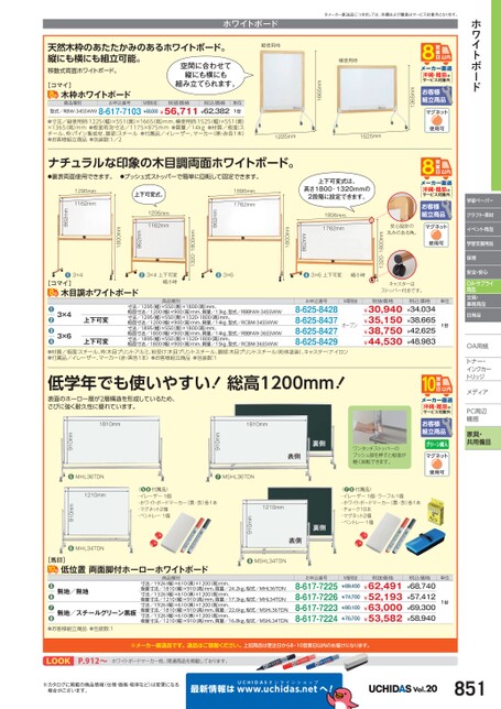 ホワイトボード学習ペーパークラフト・素材イベント用品学習支援用品保育安全・安心OA・サプライ用品文具・事務用品日用品OA用紙用紙トナー・トナー・インクカーインクカートリッジメディアィアPC周辺辺機器器家具・共用備品ホワイトボード※メーカー直送品につきましては、沖縄および離島はサービス対象外となります。沖縄・離島はサービス対象外1365mm横使用時1665mm縦使用時天然木枠のあたたかみのあるホワイトボード。縦にも横にも組立可能。空間に合わせて縦にも横にも組み立てられます。移動式両面ホワイトボード。[コマイ]木枠ホワイトボード商品種別型式/RBW-34SSWW8-617-7103¥58,000¥56,711¥62,382お申込番号M価税抜税抜価格税込価格単位1台●寸法/縦使用時:1225(幅)×551(奥)×1665高)mm、横使用時:1525(幅)×551(奥)×1365高)mm●板面有効寸法/1175×875mm●質量/14kg●材質/板面:スチール、枠:パイン集成材、脚部:スチール●付属品/イレーザー、マーカー(黒・赤各1本)●お客様組立商品●包装数:1/21225mm1525mm上下可変式は、高さ1800・1320mmの2段階に設定できます。沖縄・離島はサービス対象外安心設計の丸みのある角。1320・1800mm1895mm1762mm862mm1800mm上下可変式。1895mm1762mm1320・1800mm862mm1295mm1162mm862mm1800mm1295mm1162mm862mmナチュラルな印象の木目調両面ホワイトボード。●裏表両面使用できます。●プッシュ式ストッパーで簡単に回転して固定できます。●3×6●3×6上下可変縮小時●3×4[コマイ]木目調ホワイトボード❷3×4上下可変縮小時商品種別3×4上下可変●●●●●材質/板面:スチール、枠:木目プリントアルミ、粉受け:木目プリントスチール、脚部:木目プリントスチール(粉体塗装)、キャスター:ナイロン●付属品/イレーザー、マーカー(赤・黒各1本)●お客様組立商品●包装数:1寸法/1295幅)×550(奥)×1800高)mm、板面寸法/1200(幅)×900(高)mm、質量/13㎏、型式/RBBNW-34SSWW寸法/1295幅)×550(奥)×1320・1800(高)mm、板面寸法/1200(幅)×900(高)mm、質量/14㎏、型式/RCBM-34SSWW寸法/1895幅)×550(奥)×1800高)mm、板面寸法/1800(幅)×900(高)mm、質量/14㎏、型式/RBBNW-36SSWW寸法/1895幅)×550(奥)×1320・1800(高)mm、板面寸法/1800(幅)×900(高)mm、質量/15㎏、型式/RCBM-36SSWW8-625-84288-625-84378-625-84278-625-8429上下可変3×6オープンお申込番号M価税抜キャスターはストッパー付きです。税抜価格¥30,940¥35,150¥38,750¥44,530税込価格¥34,034¥38,665¥42,625¥48,983単位1台低学年でも使いやすい!総高1200mm!表面のホーロー層が2層構造を形成しているため、さびに強く耐久性に優れています。1810mm1810mm沖縄・離島はサービス対象外ワンタッチストッパーのプッシュ部を押すと板面が軽く回転できます。〈●❽付属品〉・イレーザー1個・ラーフル1個・ホワイトボードマーカー(黒・赤)各1本・チョーク10本・マグネット2個・ペントレー1個お申込番号8-617-72258-617-72268-617-72238-617-7224M価税抜¥89,400¥74,700¥90,100¥76,700税抜価格¥62,491¥52,193¥63,000¥53,582税込価格¥68,740¥57,412¥69,300¥58,940単位1台1210mm910mm●MSHL34TDN●MSHL36TDN910mm〈●❻付属品〉・イレーザー1個・ホワイトボードマーカー(黒・赤)各1本・マグネット2個・ペントレー1個●MHL36TDN1210mm910mm●MHL34TDN910mm※メーカー直送品です。返品はご容赦ください。上記商品は受注日から8・10営業日以内のお届けになります。LOOKP.912〜ホワイトボードマーカー他、関連商品を掲載しております。※カタログに掲載の商品情報(仕様・価格・税率など)は変更になる場合がございます。最新情報はUCHIDASww.uchidas.netwへ!Vol.20851商品種別寸法/1926(幅)×610(奥)×1200(高)mm、板面寸法/1810(幅)×910高)mm、質量/24.2kg、型式/MHL36TDN寸法/1326(幅)×610(奥)×1200(高)mm、板面寸法/1210(幅)×910高)mm、質量/17.3kg、型式/MHL34TDN寸法/1926(幅)×610(奥)×1200(高)mm、板面寸法/1810(幅)×910高)mm、質量/22.6kg、型式/MSHL36TDN寸法/1326(幅)×610(奥)×1200(高)mm、板面寸法/1210(幅)×910高)mm、質量/16.8kg、型式/MSHL34TDN無地/無地無地/スチールグリーン黒板●●●●●お客様組立商品●包装数:1[馬印]低位置両面脚付ホーローホワイトボード