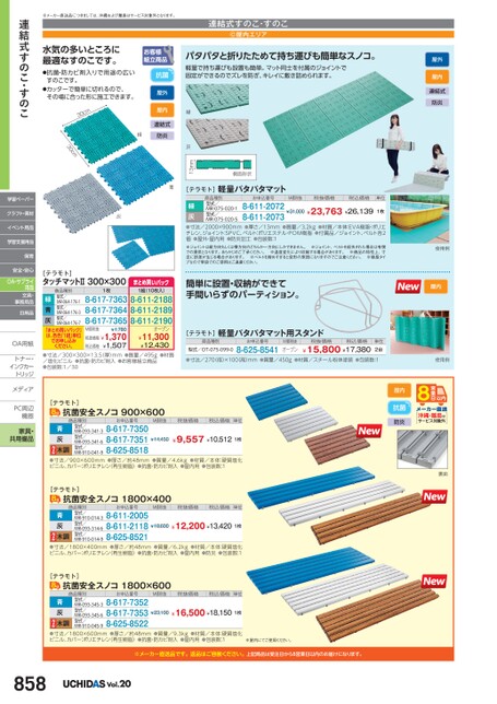 屋外屋内連結式防炎使用例屋内[テラモト]商品種別型式/OT-075-099-0軽量パタパタマット用スタンドお申込番号8-625-8541M価税抜オープン税抜価格税込価格¥15,800¥17,380単位2台●寸法/270径)×100高)mm●質量/450g●材質/スチール粉体塗装●入数/2台●包装数:1使用例[テラモト]抗菌安全スノコ900×600商品種別型式/MR-093-341-3型式/MR-093-341-6型式/MR-910-041-9青灰木調8-617-73508-617-73518-625-8518お申込番号M価税抜税抜価格税込価格単位¥14,450¥9,557¥10,5121枚●寸法/900×600mm●厚さ/約48mm●質量/4.6kg●材質/本体:硬質塩化ビニル、カバー:ポリエチレン(再生樹脂)●抗菌・防カビ剤入●屋内用●包装数:1[テラモト]抗菌安全スノコ1800×400商品種別型式/MR-910-014-3型式/MR-093-314-6型式/MR-910-014-9青灰木調8-611-20058-611-21188-625-8521お申込番号M価税抜税抜価格税込価格単位¥18,600¥12,200¥13,4201枚●寸法/1800×400mm●厚さ/約48mm●質量/6.2kg●材質/本体:硬質塩化ビニル、カバー:ポリエチレン(再生樹脂)●抗菌・防カビ剤入●屋内用●防炎●包装数:1屋内抗菌防炎沖縄・離島はサービス対象外裏面[テラモト]抗菌安全スノコ1800×600商品種別型式/MR-093-345-3型式/MR-093-345-6型式/MR-910-045-9青灰木調8-617-73528-617-73538-625-8522お申込番号M価税抜税抜価格税込価格単位¥23,100¥16,500¥18,1501枚●寸法/1800×600mm●厚さ/約48mm●質量/9.3kg●材質/本体:硬質塩化ビニル、カバー:ポリエチレン(再生樹脂)●抗菌・防カビ剤入●屋内用●包装数:1※屋内にてご使用ください。※メーカー直送品です。返品はご容赦ください。上記商品は受注日から8営業日以内のお届けになります。858Vol.20パタパタと折りたためて持ち運びも簡単なスノコ。軽量で持ち運びも設置も簡単。マット同士を付属のジョイントで固定ができるのでズレを防ぎ、キレイに敷き詰められます。側面形状緑灰13mm抗菌屋外屋内連結式防炎緑水気の多いところに最適なすのこです。●抗菌・防カビ剤入りで用途の広いすのこです。●カッターで簡単に切れるので、その場に合った形に施工できます。mc03m30c※メーカー直送品につきましては、沖縄および離島はサービス対象外となります。連結式すのこ・すのこⒸ屋内エリア[テラモト]軽量パタパタマットお申込番号M価税抜税抜価格税込価格単位商品種別型式/MR-075-020-1型式/MR-075-020-58-611-20738-611-2072¥31,000¥23,763¥26,139緑灰●寸法/2000×900mm●厚さ/13mm●質量/3.2kg●材質/本体:EVA樹脂・ポリエチレン、ジョイント:SPVC、ベルト:ポリエステル・POM樹脂●付属品/ジョイント、ベルト各2個●屋外・屋内用●防炎加工●包装数:1※ジョイントは縦方向もしくは横方向のどちらか一方向にしかできません。※ジョイント、ベルトを紛失された場合は有償での提供となります。あらかじめご了承ください。※温度変化により収縮する場合があります。※商品の特性上、寸法に誤差が生じる場合があります。※ベルトを締めすぎると変形の原因になりますのでご注意ください。※簡易タイプなので常設でのご使用はご遠慮ください。1枚簡単に設置・収納ができて手間いらずのパーティション。青灰[テラモト]タッチマットⅡ300×300商品種別1枚型式/MR-064-176-1型式/MR-064-176-3型式/MR-064-176-7緑青灰「まとめ買いパック」は、各色「1組」単位でお申し込みください。8-617-73638-617-73648-617-7365M価税抜¥1,780税抜価格¥1,370¥1,507税込価格まとめ買いパック1組(10枚入)8-611-21888-611-21898-611-2190オープン¥11,300¥12,430●寸法/300×300×13.5(厚)mm●質量/495g●材質/塩化ビニル●抗菌・防カビ剤入●お客様組立商品●包装数:1/30連結式すのこ・すのこ学習ペーパークラフト・素材イベント用品学習支援用品保育安全・安心OA・サプライ用品文具・事務用品日用品OA用紙OA用紙トナー・トナーインクカーインクカートリッジトリッジメディアメディPC周辺PC周辺機器機器家具・共用備品