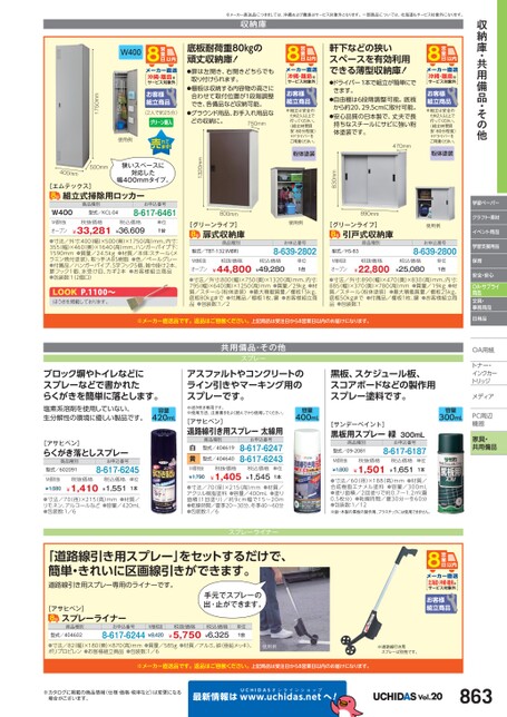収納庫・共用備品・その他学習ペーパークラフト・素材イベント用品学習支援用品保育安全・安心OA・サプライ用品文具・事務用品日用品OA用紙用紙トナー・トナー・インクカーインクカートリッジメディアィアPC周辺辺機器器家具・共用備品沖縄・離島はサービス対象外※組立は安全のため2人以上で行ってください。(組立時間目安:60分程度)+ドライバーをご用意ください。粉体塗装使用例お申込番号8-639-2800※メーカー直送品につきましては、沖縄および離島はサービス対象外となります。一部商品については、北海道もサービス対象外になります。収納庫軒下などの狭いスペースを有効利用できる薄型収納庫!●ドライバー1本で組立が簡単にできます。●自由棚は6段階調整可能。底板から約20、29.5cmに取付可能。●安心品質の日本製で、丈夫で長持ちなスチールにサビに強い粉体塗装です。470mm沖縄・離島はサービス対象外※組立は安全のため2人以上で行ってください。(組立時間目安:60分程度)+ドライバーをご用意ください。W400底板耐荷重80㎏の頑丈収納庫!●扉は左開き、右開きどちらでも取り付けられます。●棚板は収納する内容物の高さに合わせて取付位置が1段階調整でき、各備品など収納可能。●グラウンド用品、お手入れ用品などの収納に。750mm沖縄・離島はサービス対象外(2人で約25分)使用例1640mm1750mm830mm粉体塗装1320mm500mm400mm狭いスペースに対応した幅400mmタイプ。[エムテックス]組立式掃除用ロッカーW400商品種別型式/KCL-04お申込番号8-617-6461単位1台税込価格税抜価格¥36,609¥33,281M価税抜オープン●寸法/外寸:400幅)×500(奥)×1750(高)mm、内寸:355(幅)×460奥)×1640高)mm、ハンガーパイプ下:1590mm●質量/24.5kg●材質/本体:スチール(メラミン焼付塗装)、取っ手:ABS樹脂●色/ペールグレー●付属品/ハンガーパイプ、S字フック5個、雑巾掛け2本、扉フック1個、水受け皿、カギ2本●お客様組立商品●包装数:1(2個口)P.1100〜ほうきを掲載しております。ブロック塀やトイレなどにスプレーなどで書かれたらくがきを簡単に落とします。塩素系溶剤を使用していない、生分解性の環境に優しい製品です。容量420mL[アサヒペン]らくがき落としスプレー商品種別型式/602091お申込番号8-617-6245M価税抜¥1,580税抜価格¥1,410税込価格¥1,551単位1本●寸法/70径)×215(高)mm●材質/リモネン、アルコールなど●容量/420mL●包装数:1/6800mm[グリーンライフ]扉式収納庫商品種別型式/TBT-132(MBR)使用例お申込番号8-639-2802890mm[グリーンライフ]引戸式収納庫商品種別型式/HS-83税込価格税抜価格¥49,280¥44,800M価税抜オープン●寸法/外寸:800(幅)×750(奥)×1320(高)mm、内寸:795(幅)×640(奥)×1250(高)mm●質量/29kg●材質/スチール(粉体塗装)●最大積載質量/棚板15kg、底板80kgまで●付属品/棚板1枚、鍵●お客様組立商品●包装数:1/2単位1台税込価格税抜価格¥25,080¥22,800M価税抜オープン●寸法/外寸:890(幅)×470(奥)×830(高)mm、内寸:885幅)×370奥)×780(高)mm●質量/19kg●材質/スチール(粉体塗装)●最大積載質量/棚板25kg、底板50kgまで●付属品/棚板1枚、鍵●お客様組立商品●包装数:1単位1台※メーカー直送品です。返品はご容赦ください。上記商品は受注日から8営業日以内のお届けになります。共用備品・その他スプレーアスファルトやコンクリートのライン引きやマーキング用のスプレーです。黒板、スケジュール板、スコアボードなどの製作用スプレー塗料です。容量400mL※逆さ吹き専用です。※使用方法、注意書きをよく読んでから使用してください。[アサヒペン]道路線引き用スプレー太線用商品種別型式/404619型式/404640お申込番号8-617-62478-617-6243白黄M価税抜¥1,790税抜価格¥1,405税込価格¥1,545単位1本●寸法/70(径)×215(高)mm●材質/アクリル樹脂塗料●容量/400mL●塗り面積(1回塗り)/約9cm幅で15〜20m●乾燥時間/夏季20〜30分、冬季40〜60分●包装数:1/6スプレーライナー容量300mL[サンデーペイント]黒板用スプレー緑300mL商品種別型式/09-2081お申込番号8-617-6187M価税抜¥1,800税抜価格¥1,501税込価格¥1,651単位1本●寸法/60(径)×188(高)mm●材質/合成樹脂エナメル塗料●容量/300mL●塗り面積/2回塗りで約0.7〜1.2㎡(畳0.5枚分)●乾燥時間/夏30分〜冬60分●包装数:1/12※鉄・木製の黒板の製作用、プラスチックには使用できません。北海道・沖縄・離島はサービス対象外「道路線引き用スプレー」をセットするだけで、簡単・きれいに区画線引きができます。道路線引き用スプレー専用のライナーです。[アサヒペン]スプレーライナー商品種別型式/404602お申込番号8-617-6244M価税抜¥8,420税抜価格¥5,750税込価格¥6,325単位1台手元でスプレーの出・止ができます。●寸法/82(幅)×180(奥)×870(高)mm●質量/585g●材質/アルミ、鉄(亜鉛メッキ)、ポリプロピレン●お客様組立商品●包装数:1/6使用例※道路線引き用スプレーは別売です。※メーカー直送品です。返品はご容赦ください。上記商品は受注日から8営業日以内のお届けになります。※カタログに掲載の商品情報(仕様・価格・税率など)は変更になる場合がございます。最新情報はUCHIDASww.uchidas.netwへ
