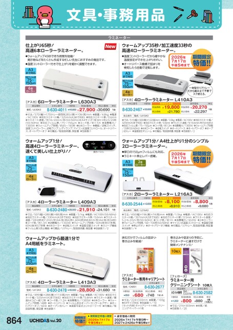 文具・事務用品仕上がり65秒!高速6本ローラーラミネーター。ウォームアップ35秒!加工速度33秒の高速4ローラーラミネーター。ラミネーター●ウォームアップ45秒で待ち時間を短縮!掲示物などをたくさん作成する忙しい先生におすすめの商品です。●温度コントローラー付きで仕上がりを細かく調整できます。A3まで対応対応フィルム厚75〜150μm6本ローラー[アスカ]6ローラーラミネーターL630A3商品種別型式/L630A3お申込番号M価税抜税抜価格8-630-4011¥40,000¥27,900¥30,690税込価格単位1台●寸法/570(幅)×170(トレー使用時285)(奥)×106高)mm●質量/4.8kg●電源/AC100V●対応ラミネート幅/325mm(A3まで対応)●対応ラミネート厚/0.6mm●ラミネート速度/約16/20mm/秒(50/60Hz)※A4サイズ1枚当たり約23/20秒(50/60Hz)●対応フィルム厚/75〜150μm●コード長/約1.5m●消費電力/1300W●ウォームアップ時間/約45〜165秒●6本ローラー●機能/逆転スイッチ、温度コントローラー、逆転ランプ、レディランプ、マイコン式温度コントロール、オートリバース、オートパワーオフ●付属品/取扱説明書、保証書●包装数:1●温度コントローラーだから細やかな温度設定ができ仕上がりきれい。●オートリバース機構で詰まりを検知したら自動で逆転します。A3まで対応対応フィルム厚75〜150μm4本ローラー2026年7月17日午後5時一体型のリアトレーだから組み立て不要でスグ使える。[アスカ]4ローラーラミネーターL410A3お申込番号M価税抜8-630-2467¥33,000税抜価格税込価格商品種別型式/L410A3期間限定特価通常価格単位¥19,800税抜価格¥20,2701台¥21,780税込価格¥22,297●寸法/515幅)×300奥)×122高)mm●質量/3.9kg●電源/AC100V●対応ラミネート幅/325mm(A3まで対応)●対応ラミネート厚/0.6mm●ラミネート速度/9/10.6mm/秒(50/60Hz)●対応フィルム厚/75〜150μm●コード長/約1.2m●消費電力/1300W●ウォームアップ時間/35秒(50/60Hz)●4本ローラー●逆転スイッチ●オートリバース●オートパワーオフ●オープン式トレー●温度設定ボリューム●付属品/取扱説明書、保証書●包装数:1/2ウォームアップ1分!A4仕上がり1分のシンプル2ローラーラミネーター。ウォームアップ1分!高速4ローラーラミネーター、速くて美しい仕上がり!!A3まで対応対応フィルム厚75〜150μm4本ローラー操作パネル●厚口の150μmフィルムにも対応。●ラミネート停止レバー搭載。2本ローラーA3まで対応対応フィルム厚75〜150μm2026年7月17日午後5時[アスカ]4ローラーラミネーターL409A3商品種別型式/L409A3お申込番号M価税抜税抜価格8-630-2480¥28,000¥21,910¥24,101税込価格8-630-2544¥13,000税抜価格税込価格商品種別型式/L216A3単位1台[アスカ]2ローラーラミネーターL216A3お申込番号M価税抜期間限定特価¥8,100¥8,910通常価格単位¥8,8001台¥9,680税抜価格税込価格●寸法/507(幅)×280(奥)×88(高)mm●質量/3.1kg●電源/AC100V(50/60Hz)●対応ラミネート幅/330mm(A3まで対応)●対応ラミネート厚/0.6mm●ラミネート速度/50Hz時:約7.2mm/秒(A4/枚/約42秒)、60Hz時:約8.8mm/秒(A4/枚/約34秒)●コード長/約1.3m●消費電力/1350W●ウォームアップ時間/50Hz時:約51秒間、60Hz時:約57秒間●4本ローラー●逆転スイッチ●温度切替スイッチ●スリープ機能●フィルム挿入防止機能●付属品/リアトレー、取扱説明書、保証書●包装数:1/2●寸法/450幅)×196(奥)×74高)mm●質量/1.5kg●電源/AC100V●対応ラミネート幅/307mm(A3まで対応)●対応ラミネート厚/0.5mm●ラミネート速度/5.2/6.2mm/秒(50/60Hz)●コード長/約1m●消費電力/650W●2本ローラー●ウォームアップ時間/60〜100秒(50/60Hz)●マイコン式温度コントロール●温度切替スイッチ●停止ボタン●オートパワーオフ機能●付属品/リアトレー、取扱説明書、保証書●包装数:1/4ウォームアップから最速1分でA4用紙をラミネート。A3まで対応対応フィルム厚75〜250μm4本ローラー[アスカ]4ローラーラミネーターL413A3商品種別型式/L413A3お申込番号M価税抜税抜価格8-630-2478¥40,000¥28,800¥31,680税込価格単位1台●寸法/499(幅)×288(奥)×113(高)mm●質量/5kg●電源/AC100V●対応ラミネート幅/325mm(A3まで対応)●対応ラミネート厚/0.8mm●ラミネート速度/最速A4コピー紙12秒●コード長/1.2m●消費電力/1300W●4本ローラー●ウォームアップ時間/48秒●オートリバース●フィルム余白オーバーセンサー&ブザー●オートパワーオフ/60分●オープン式トレー●速度可変式コントローラー付●付属品/取扱説明書、保証書●包装数:1挟むだけでフィルムの詰まり・巻き込みを軽減!巻き込みや詰まりの予防に。ラミネーターに通すだけで簡単メンテナンス!10枚入[アスカ]ラミネーター専用キャリアシート商品種別型式/CAR01お申込番号8-630-2677M価税抜¥850税抜価格¥680税込価格¥748単位1セット●寸法/224×330mm●質量/100g●A4サイズ対応●包装数:1/10〈セット内容キャリアシート×4枚、クリーニングペーパー×1枚[フェローズ]ラミネーター用クリーニングシート10枚入商品種別お申込番号A3/A4兼用型式/53207048-630-2582M価税抜¥1,350税抜価格¥800税込価格¥880単位1冊(10枚入)●寸法/216×303mm●材質/紙●包装数:1/20通常価格の期間2026年7月17日午後5時〜2027年2月26日午後5時期間限定特