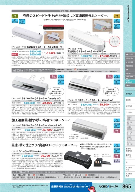 ラミネーター学習ペーパークラフト・素材イベント用品学習支援用品保育安全・安心OA・サプライ用品文具・事務用品日用品電子文具筆記具筆記具修正用具正ファイルファイル穴をあけて穴をあけてとじるポケットにポケットに入れるとじ具でとじ具ではさみ込むボックス・ボックス・ケースス用途別用途別ファイルファイルサポート用品事務用務接着用品着事務用務ペーパーペーパー鞄机上事務上用品品机上整理上用品用品ラミネーター究極のスピードと仕上がりを追求した高速起動ラミネーター。ウォームアップ時間約35秒の高速起動ラミネーターです。レッド使用例対応フィルム厚75〜150μm2本ローラーA3まで対応ホワイト4本ローラーA3まで対応対応フィルム厚75〜150μm[アイリスオーヤマ]高速起動ラミネーターA32本ローラー商品種別お申込番号M価税抜税抜価格税込価格単位型式/HSL-A322-R8-630-2667型式/HSL-A322-W8-630-2666オープン¥11,800¥12,980ホワイトレッド●寸法/490(幅)×154(奥)×80(高)mm●質量/2.4kg●対応ラミネート幅/320mm●対応ラミネート厚/0.6mm●対応フィルム厚/75〜150μm●ラミネート速度/410mm/分(50Hz)、500mm/分(60Hz)●コード長/約1.2m●2本ローラー●消費電力/1320W●電源/AC100V●ウォームアップ時間/約35秒●加工方式/ホットラミネート●付属品/ワイヤートレー×2個、キャリアシート、クリーニングペーパー●包装数:1/41台[アイリスオーヤマ]高速起動ラミネーターA34本ローラー商品種別型式/HSL-A343-Wお申込番号8-630-2709M価税抜オープン税抜価格税込価格¥17,900¥19,690単位1台●寸法/530幅)×132(奥)×89(高)mm●質量/3.1kg●対応ラミネート幅/320mm●対応ラミネート厚/0.6mm●ラミネート速度/580mm/分(50Hz)、680mm/分(60Hz)●コード長/約1.3m●4本ローラー●消費電力/1400W●電源/AC100V●ウォームアップ時間/約35秒●付属品/ワイヤートレー×2個、キャリアシート、クリーニングペーパー●包装数:1/4メーカーお問い合わせ先製品に関するさらに詳しい情報、修理・故障に関しては、各メーカーにお問い合わせください。電気用品専用アイリスコール▲受付時間9:00〜17:00(年末年始・夏季休業期間・会社都合による休日、土・日・祝日の12:00〜13:00は除きます。)0120-311-5646本ローラーA3まで対応対応フィルム厚75〜175μm6本ローラーA3まで対応対応フィルム厚75〜250μm加工速度最速約23秒の高速ラミネーター!加工速度最速約13秒の高速ラミネーター![フェローズ]6本ローラーラミネーターAmarisA3商品種別型式/8058401お申込番号M価税抜8-630-4007¥46,000税抜価格¥34,000税込価格¥37,400単位1台●寸法/本体:475(幅)×155(奥)×105(高)mm、サポートアーム使用時:310(奥)mm●質量/3kg●対応ラミネート幅/324mm●対応ラミネート厚/0.6mm●対応フィルム厚/75〜175μm●6本ローラー●消費電力/1000W●電源/AC100V(50/60Hz)●ウォームアップ時間/最短60秒●加工方式/ホット/コールド●PTSフィルム詰まり対策)●マニュアルリバース●オートパワーオフ機能/約30分●包装数:1●ラミネート速度/最速780mm/分●コード長/1.5m[フェローズ]6本ローラーラミネーターZeus3A3商品種別型式/5748701お申込番号M価税抜税抜価格8-630-2567¥62,500¥38,500¥42,350税込価格単位1台●寸法/本体:530(幅)×210(奥)×140(高)mm、サポートアーム使用時:420(奥)mm●質量/7kg●対応ラミネート幅/317mm●対応ラミネート厚/0.75mm●対応フィルム厚/75〜250μm●ラミネート速度/最速1400mm/分●コード長/1.5m●6本ローラー●消費電力/1300W●電源/AC100V(50/60Hz)●ウォームアップ時間/最短60秒●加工方式/ホット/コールド●オートパワーオフ/約30分●包装数:1加工速度最速約9秒の高速ラミネーター![フェローズ]6本ローラーラミネーターVenus4A3商品種別型式/5748201お申込番号M価税抜税抜価格8-630-2568¥82,000¥57,900¥63,690税込価格単位1台●寸法/本体:530(幅)×215(奥)×140(高)mm、サポートアーム使用時:470(奥)mm●質量/7kg●対応ラミネート幅/317mm●対応ラミネート厚/0.75mm●対応フィルム厚/75〜250μm●ラミネート速度/最速2030mm/分●コード長/1.5m●6本ローラー●消費電力/1300W●電源/AC100V(50/60Hz)●ウォームアップ時間/最短30秒●加工方式/ホット/コールド●包装数:1フィルム厚を検知し、最適な加工速度に自動調整する「オートセンス」搭載。最速9秒で仕上がり!高速6ローラーラミネーター。●細やかな温度設定ができ美しい仕上がりです。●詰まりを検知したら自動で逆転するオートリバース機能を搭載。単位1台熱でプレス気泡を防ぐ冷ましてプレス反り・波打ちを防ぐ[アスカ]6ローラーラミネーター商品種別型式/L620A3お申込番号M価税抜税抜価格8-630-2565¥60,000¥36,700¥40,370税込価格●寸法/本体:522幅)×363奥)×128高)mm●質量/4.3kg●対応ラミネート幅/307mm(A3まで対応)●対応ラミネート厚/1mm●対応フィルム厚/75〜250μm●ラミネート速度/33.3mm/秒●コード長/約1.3m●6本ローラー●消費電力/1400W●電源/AC100V●ウォームアップ時間/60秒(50/60Hz)●逆転スイッチ●フィルム厚スイッチ●紙厚スイッチ●ラミネート厚センサー●フィルム余白センサー●フィルム挿入防止機構●オートリバース機能●オートパワーオフ機能●付属品/リアト