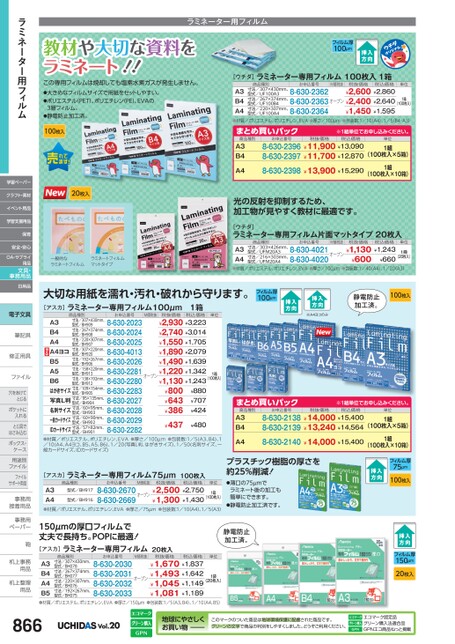 ラミネーター用フィルム教材や大切な資料をラミネート!!この専用フィルムは焼却しても塩素水素ガスが発生しません。●大きめなフィルムサイズで用紙をセットしやすい。●ポリエステル(PET)、ポリエチレン(PE)、EVAの3層フィルム。●静電防止加工済。100枚入20枚入一般的なラミネートフィルムラミネートフィルムマットタイプフィルム厚100μm挿入方向[ウチダ]ラミネーター専用フィルム100枚入1箱商品種別お申込番号M価税抜税抜価格税込価格単位寸法/307×430mm、型式/UF100A3寸法/267×374mm、型式/UF100B4寸法/220×307mm、型式/UF100A4A3B4A4●材質/ポリエステル、ポリエチレン、EVA●厚さ/100μm●包装数:1/10A4)、1/5(B4・A3)¥2,600¥2,860¥2,400¥2,640¥1,450¥1,5958-630-23628-630-23638-630-2364(100枚入)オープン1箱商品種別まとめ買いパック8-630-2396A38-630-2397B4お申込番号A48-630-2398※1組単位申込。税抜価格税込価格¥11,900¥13,090¥11,700¥12,870¥13,900¥15,290単位1組(100枚入×5箱)1組(100枚入×10箱)光の反射を抑制するため、加工物が見やすく教材に最適です。[ウチダ]ラミネーター専用フィルム片面マットタイプ20枚入商品種別お申込番号M価税抜税抜価格税込価格単位寸法/303×426mm、型式/UFM20A3寸法/216×303mm、型式/UFM20A4A3A4●材質/ポリエステル、ポリエチレン、EVA●厚さ/100μm●包装数:1/40A4)、1/20(A3)8-630-4021オープン¥1,130¥1,2438-630-4020¥600¥6601冊(20枚入)大切な用紙を濡れ・汚れ・破れから守ります。[アスカ]ラミネーター専用フィルム100μm1箱M価税抜税抜価格税込価格単位フィルム厚100μm挿入方向挿入方向※A4ヨコのみ静電防止加工済。100枚入商品種別寸法/307×430mm、型式/BH909寸法/267×374mm、型式/BH908寸法/220×307mm、型式/BH907型式/BH920寸法/192×267mm、型式/BH906寸法/158×220mm、型式/BH913寸法/138×192mm、型式/BH912A3B4A4A4ヨコ寸法/307×220mm、B5A5B6はがきサイズ寸法/109×154mm、写真L判寸法/95×135mm、名刺サイズ寸法/60×95mm、一般カードサイズ寸法/60×90mm、IDカードサイズ寸法/57×82mm、型式/BH903型式/BH902型式/BH904型式/BH905型式/BH901お申込番号8-630-20238-630-20248-630-20258-630-40138-630-20268-630-22818-630-22808-630-22838-630-20278-630-20288-630-20298-630-2282¥2,930¥3,223¥2,740¥3,014¥1,550¥1,705¥1,890¥2,079¥1,490¥1,639¥1,220¥1,342¥1,130¥1,243¥880¥707¥424¥800¥643¥386¥437¥480オープン1箱(100枚入)●材質/ポリエステル、ポリエチレン、EVA●厚さ/100μm●包装数:1/5(A3、B4)、1/10(A4、A4ヨコ、B5、A5、B6)、1/20(写真L判、はがきサイズ)、1/50(名刺サイズ、一般カードサイズ、IDカードサイズ)商品種別[アスカ]ラミネーター専用フィルム75μm100枚入8-630-2670オープン¥2,500¥2,750¥1,300¥1,4308-630-2669A3A4●材質/ポリエステル、ポリエチレン、EVA●厚さ/75μm●包装数:1/10A4)、1/5A3)型式/BH917型式/BH916お申込番号(100枚入)税抜価格税込価格M価税抜単位1箱プラスチック樹脂の厚さを約25%削減!●薄口の75μmでラミネート後の加工も簡単にできます。●静電防止加工済です。150μmの厚口フィルムで丈夫で長持ち。POPに最適![アスカ]ラミネーター専用フィルム20枚入商品種別お申込番号M価税抜税抜価格税込価格単位寸法/307×430mm、型式/BH078寸法/267×374mm、型式/BH077寸法/220×307mm、型式/BH076寸法/192×267mm、型式/BH075A3B4A4B5●材質/ポリエステル、ポリエチレン、EVA●厚さ/150μm●包装数:1/5(A3、B4)、1/10(A4、B5)¥1,670¥1,837¥1,493¥1,642¥1,045¥1,149¥1,081¥1,1898-630-20308-630-20318-630-20328-630-2033オープン(20枚入)1袋静電防止加工済。※1組単位申込。商品種別まとめ買いパック8-630-2138A38-630-2139B4お申込番号A48-630-2140税抜価格税込価格¥14,000¥15,400¥13,240¥14,564¥14,000¥15,400単位1組(100枚入×5箱)1組(100枚入×10箱)フィルム厚75μm100枚入挿入方向挿入方向フィルム厚150μm20枚入866Vol.20地球にやさしくお買い物このマークのついた商品は地球環境保護に配慮された商品です。グリーンの文字で商品の判別をしやすくしました。どうぞご利用ください。エコマーク認定品グリーン購入法適合品GPNエコ商品ねっと掲載ラミネーター用フィルム学習ペーパークラフト・素材イベント用品学習支援用品保育安全・安心OA・サプライ用品文具・事務用品日用品電子文具筆記具筆記具修正用具修正用ファイルファイル穴をあけて穴をあけてとじるポケットにポケットに入れるとじ具でとじ具ではさみ込むボックス・ボックス・ケース用途別用途別ファイルファイルサポート用品事務用事務接着用品接着用事務用事務用ペーパーペーパー鞄鞄机上事務机上事用品用品机上整理机上整用品用品