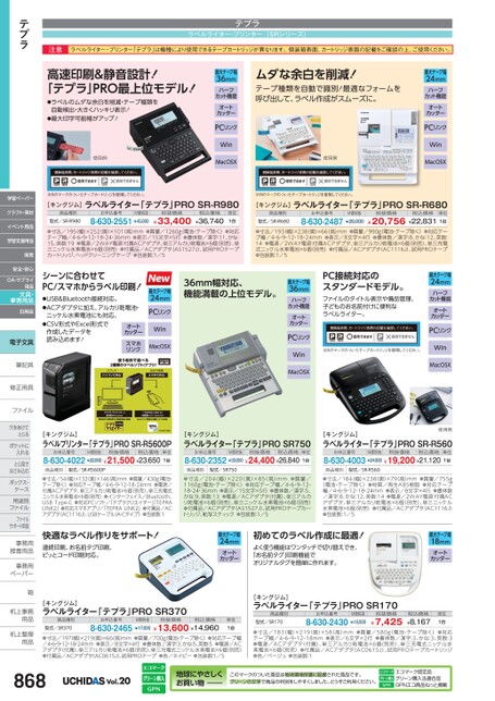 注意ラベルライター・プリンター「テプラ」は機種により使用できるテープカートリッジが異なります。個装箱表面、カートリッジ表面の記載をご確認の上、ご使用ください。テプララベルライター・プリンター(SRシリーズ)高速印刷&静音設計!「テプラ」PRO最上位モデル!●ラベルのムダな余白を削減・テープ種類を自動検出・大きくハッキリ表示!●最大印字可能幅がアップ!使用例最大テープ幅36mmハーフカット機能オートカッターPCリンクWinMacOSXムダな余白を削減!テープ種類を自動で識別!最適なフォームを呼び出して、ラベル作成がスムーズに。使用例最大テープ幅24mmハーフカット機能オートカッターPCリンクWinMacOSX※Rのマークのついたテープカートリッジを使用してください。※Rのマークのついたテープカートリッジを使用してください。[キングジム]ラベルライター「テプラ」PROSR-R980商品種別型式/SR-R980お申込番号M価税抜8-630-2551¥45,000税抜価格¥33,400税込価格¥36,740単位1台[キングジム]ラベルライター「テプラ」PROSR-R680商品種別型式/SR-R680お申込番号M価税抜税抜価格8-630-2487¥26,000¥20,756¥22,8311台税込価格単位●寸法/195(幅)×252(奥)×101(高)mm●質量/1260g(電池・テープ除く)●対応テープ幅/4・6・9・12・18・24・36mm●表示/15文字×5行●書体数/漢字:11、かな:15、英数:19●電源/2WAY電源:付属ACアダプタ、単三アルカリ乾電池×6個(別売)、単三ニッケル水素電池×6個(別売)●付属品/ACアダプタ(AS1527J)、試用PROテープカートリッジ、ヘッドクリーニングテープ●包装数:1/5●寸法/193幅)×238奥)×66高)mm●質量/990g電池・テープ除く)●対応テープ幅/4・6・9・12・18・24mm●表示/8文字×4行●書体数/漢字:8、かな:12、英数:14●電源/2WAY電源:付属ACアダプタ、単三アルカリ乾電池×6個(別売)、単三充電式ニッケル水素電池×6個(別売)●付属品/ACアダプタ(AC1116J)、試用PROテープ●包装数:1/5シーンに合わせてPC/スマホからラベル印刷!●USB&Bluetooth接続対応。●ACアダプタに加え、アルカリ乾電池・ニッケル水素電池にも対応。●CSV形式やExcel形式で作成したデータを読み込めます!オートカッタースマホリンク36mm幅対応、機能満載の上位モデル。最大テープ幅24mmPCリンクWinMacOSXPC接続対応のスタンダードモデル。ファイルのタイトル表示や備品管理、子どものお名前付けに便利なラベルライター。※Rのマークのついたテープカートリッジを使用してください。最大テープ幅24mmハーフカット機能オートカッターPCリンクWinMacOSX最大テープ幅36mmハーフカット機能オートカッターPCリンクWinMacOSX[キングジム]ラベルプリンター「テプラ」PROSR-R5600Pお申込番号M価税抜税抜価格税込価格8-630-4022¥22,000¥21,500¥23,650単位1台[キングジム]ラベルライター「テプラ」PROSR750お申込番号M価税抜税抜価格税込価格8-630-2352¥33,000¥24,400¥26,840単位1台[キングジム]ラベルライター「テプラ」PROSR-R560お申込番号M価税抜税抜価格税込価格8-630-4003¥24,000¥19,200¥21,120単位1台使用例商品種別型式/SR-R5600P商品種別型式/SR750商品種別型式/SR-R560●寸法/54幅)×132(奥)×146(高)mm●質量/430g(電池・テープ除く)●対応テープ幅/4・6・9・12・18・24mm●電源/付属ACアダプタ、単三アルカリ乾電池×6個(別売)、単三充電式ニッケル水素電池×6個(別売)●インターフェイス/Bluetooth、USBType-C●対応PCソフト/「テプラクリエイター」TEPRALINK2」●対応スマホアプリ/「TEPRALINK2」●付属品/ACアダプタ(AC1116J)、USBケーブル(A-Cタイプ)●包装数:1●寸法/204(幅)×220(奥)×85(高)mm●質量/1160g(電池・テープ除く)●対応テープ幅/4・6・9・12・18・24・36mm●表示/15文字×5行●書体数/漢字:5、かな:9、英数:13●電源/ACアダプタ(付属)、単三アルカリ乾電池×6個(別売)、単三ニッケル水素電池×6個(別売)●付属品/ACアダプタ(AS1527J)、試用PROテープカートリッジ、転写スティック●包装数:1/5●寸法/184(幅)×238(奥)×79(高)mm●質量/755g(電池・テープ除く)●材質/再生ABS樹脂●対応テープ幅/4・6・9・12・18・24mm●表示/8文字×4行●書体数/漢字:8、かな:12、英数:14●電源/2WAY電源:付属ACアダプタ、単三アルカリ乾電池×6個(別売)、単三ニッケル水素電池×6個(別売)●付属品/ACアダプタ(AC1116J)●包装数:1/5快適なラベル作りをサポート!連続印刷、お名前タグ印刷、ピッとコード印刷対応。最大テープ幅24mmオートカッター初めてのラベル作成に最適!よく使う機能はワンタッチで切り替えでき、「お名前タグ」印刷機能でオリジナルタグを簡単に作れます。最大テープ幅18mmオートカッター税込価格¥8,167単位1台[キングジム]ラベルライター「テプラ」PROSR370商品種別型式/SR370お申込番号8-630-2465¥17,000¥13,600¥14,960M価税抜税抜価格税込価格単位1台●寸法/197(幅)×219奥)×66(高)mm●質量/700g(電池・テープ除く)●対応テープ幅/4・6・9・12・18・24mm●表示/8文字×4行●書体数/漢字:3、かな:5、英数:5●電源/ACアダプタ(付属)、単三アルカリ乾電池×6個(別売)、単三充電式ニッケル水素電池×6個(別売)●付属品/ACアダプタ(AC0615J)、試用PROテープ●色/ネイビー●包装数:1/5[キングジム]ラベルライター「テプラ」PROSR