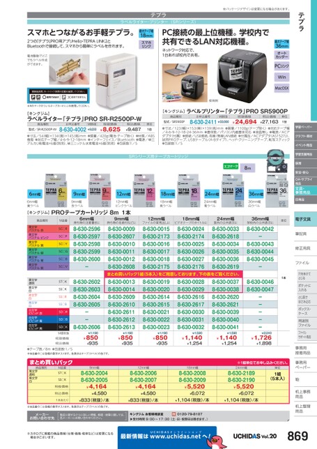 テプラ学習ペーパークラフト・素材イベント用品学習支援用品保育安全・安心OA・サプライ用品文具・事務用品日用品筆記具筆記具修正用具正ファイルファイル穴をあけて穴をあけてとじるポケットにポケットに入れるとじ具でとじ具ではさみ込むボックス・ボックス・ケースス用途別用途別ファイルファイルサポート用品事務用務接着用品着事務用務ペーパーペーパー鞄机上事務上用品品机上整理上用品用品黒文字パステル赤黒文字パステルピンク黒文字パステル黄黒文字パステル緑黒文字パステル青黒文字パステル紫黒文字透明黒文字白赤文字白青文字白白文字ビビッド赤白文字ビビッド青白文字ビビッド黒SC○RSC○PSC○YSC○GSC○BSC○VST○KSS○KSS○RSS○BSD○RSD○BSD○KM価税抜税抜価格税込価格持ち物の注意書きに8-630-25968-630-25978-630-25988-630-25998-630-2600-8-630-26028-630-26038-630-26048-630-2605--8-630-2606¥1,190¥850¥935単位電子文具12mm幅18mm幅24mm幅室内の公共表示に持ち物の名前付などにファイルの背見出しにビデオテープのタイトルに8-630-00158-630-21738-630-00168-630-00178-630-00188-630-21758-630-00248-630-21748-630-00258-630-00268-630-00278-630-21768-630-00338-630-26188-630-00348-630-00358-630-00368-630-26198-630-00098-630-26078-630-00108-630-00118-630-00128-630-2608まとめ買いパック1組(5本入)をご用意しております。下の表をご覧ください。8-630-00138-630-00148-630-26098-630-26108-630-26118-630-26128-630-26138-630-00378-630-00388-630-26208-630-26218-630-00398-630-00408-630-00418-630-00288-630-00298-630-26168-630-26178-630-00308-630-00318-630-00328-630-00198-630-00208-630-26148-630-26158-630-00218-630-00228-630-002336mm幅学校内の公共表示に8-630-0042-8-630-00438-630-00448-630-0045-8-630-00468-630-00471本-----¥1,190¥850¥935¥1,190¥850¥935¥1,590¥1,140¥1,254¥1,590¥1,140¥1,254¥2,240¥1,726¥1,898●テープ長/8m●包装数:1/5※M品番の○は各幅の数字が入ります。色表示はテープ(ラベル)の色です。まとめ買いパック商品種別黒文字透明黒文字白M品番ST○KSS○K税抜価格税込価格1本あたり9mm幅8-630-20048-630-2005¥4,164¥4,58012mm幅8-630-20068-630-2007¥4,164¥4,58018mm幅8-630-20088-630-2009¥5,520¥6,072※1組単位申込。単位1組(5本入)24mm幅8-630-21898-630-2190¥5,520¥6,072¥833(税抜)/本¥833(税抜)/本¥1,104(税抜)/本¥1,104(税抜)/本※M品番の○は各幅の数字が入ります。色表示はテープ(ラベル)の色です。メーカーお問い合わせ先製品に関するさらに詳しい情報、修理・故障に関しては、各メーカーにお問い合わせください。キングジムお客様相談室▶受付時間9:00〜17:30(土・日・祝祭日は除きます。)0120-79-8107※カタログに掲載の商品情報(仕様・価格・税率など)は変更になる場合がございます。最新情報はUCHIDASww.uchidas.netwへ!Vol.20869テプララベルライター・プリンター(SRシリーズ)※パッケージデザインは変更になる場合があります。スマホとつながるお手軽テプラ。2つの「テプラ」PRO用アプリHello・TEPRALINK2とBluetoothで接続して、スマホから簡単にラベルを作れます。最大テープ幅18mmスマホリンク電池駆動でどこでもラベル作成ができます。PC接続の最上位機種。学校内で共有できるLAN対応機種。ネットワーク対応で、1台あれば校内で共有。最大テープ幅36mmオートカッターPCリンクWinMacOSX使用例※Rのマークのついたテープカートリッジを使用してください。[キングジム]ラベルライター「テプラ」PROSR-R2500P-W商品種別型式/SR-R2500P-Wお申込番号M価税抜8-630-4002¥9,200税抜価格¥8,625税込価格¥9,487単位1台●寸法/54(幅)×134奥)×145(高)mm●質量/420g電池・テープ除く)●材質/ABS樹脂●対応テープ幅/4・6・9・12・18mm●インターフェイス/Bluetooth●電源/単三アルカリ乾電池×6個(別売)、単三ニッケル水素電池×6個(別売)●包装数:1/5[キングジム]ラベルプリンター「テプラ」PROSR5900P商品種別型式/SR5900Pお申込番号M価税抜8-630-2411¥33,000税抜価格¥24,694税込価格¥27,163単位1台●寸法/123(幅)×153奥)×139(高)mm●質量/1100gテープ除く)●対応テープ幅/4・6・9・12・18・24・36mm●書体数/パソコン内蔵書体対応●液晶無し●電源/ACアダプタ(付属)●接続/USB接続、有線/無線LAN接続●付属品/ACアダプタ(AS1527J)、試用PROテープ、USBケーブル(A-Bタイプ)、ヘッド・クリーニングテープ、転写スティック●包装数:1/5SRシリーズ用テープカートリッジ6mm幅9mm幅12mm幅6mm幅黄ラベル9mm幅赤ラベル12mm幅ピンクラベル[キングジム]PROテープカートリッジ8m1本9mm幅6mm幅商品種別M品番18mm幅18mm幅紫ラベル24mm幅24mm幅青ラベル8m36mm幅36mm幅白ラベル