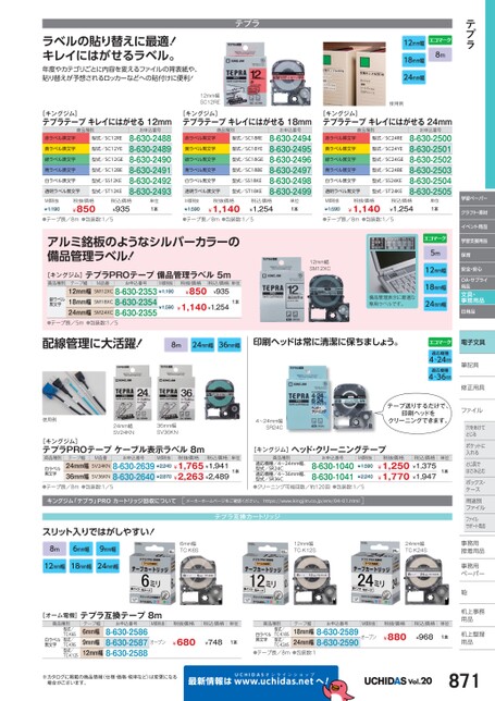 テプラ8m12mm幅18mm幅24mm幅使用例テプララベルの貼り替えに最適!キレイにはがせるラベル。年度やカテゴリごとに内容を変えるファイルの背表紙や、貼り替えが予想されるロッカーなどへの貼付けに便利!12mm幅SC12RE[キングジム]テプラテープキレイにはがせる12mm[キングジム]テプラテープキレイにはがせる18mm[キングジム]テプラテープキレイにはがせる24mm商品種別赤ラベル黒文字黄ラベル黒文字緑ラベル黒文字青ラベル黒文字白ラベル黒文字型式/SC12RE型式/SC12YE型式/SC12GE型式/SC12BE型式/SS12KE透明ラベル黒文字型式/ST12KEお申込番号8-630-24888-630-24898-630-24908-630-24918-630-24928-630-2493商品種別赤ラベル黒文字黄ラベル黒文字緑ラベル黒文字青ラベル黒文字白ラベル黒文字型式/SC18RE型式/SC18YE型式/SC18GE型式/SC18BE型式/SS18KE透明ラベル黒文字型式/ST18KEお申込番号8-630-24948-630-24958-630-24968-630-24978-630-24988-630-2499商品種別赤ラベル黒文字黄ラベル黒文字緑ラベル黒文字青ラベル黒文字白ラベル黒文字型式/SC24RE型式/SC24YE型式/SC24GE型式/SC24BE型式/SS24KE透明ラベル黒文字型式/ST24KEお申込番号8-630-25008-630-25018-630-25028-630-25038-630-25048-630-2505M価税抜¥1,190税抜価格¥850税込価格¥935●テープ長/8m●包装数:1/5単位1本M価税抜¥1,590税抜価格¥1,140税込価格¥1,254単位1本M価税抜¥1,590税抜価格¥1,140税込価格¥1,254単位1本●テープ長/8m●包装数:1/5●テープ長/8m●包装数:1/5アルミ銘板のようなシルバーカラーの備品管理ラベル![キングジム]テプラPROテープ備品管理ラベル5m商品種別銀ラベル黒文字テープ幅12mm幅18mm幅24mm幅M品番お申込番号M価税抜SM12XC8-630-2353¥1,190SM18XC8-630-2354SM24XC8-630-2355¥1,590税抜価格¥850税込価格単位¥935¥1,140¥1,2541本12mm幅SM12XC備品管理表示に最適な専用ラベルです。●テープ長/5m●包装数:1/5配線管理に大活躍!8m24mm幅36mm幅印刷ヘッドは常に清潔に保ちましょう。5m12mm幅18mm幅24mm幅適応機種4〜24mm適応機種4〜36mm使用例24mm幅SV24KN36mm幅SV36KN4〜24mm幅SR24Cテープ送りするだけで、印刷ヘッドをクリーニングできます。[キングジム]テプラPROテープケーブル表示ラベル8m商品種別白ラベル黒文字テープ幅24mm幅36mm幅M品番SV24KNSV36KNお申込番号M価税抜税抜価格税込価格8-630-2639¥2,240¥1,765¥1,9418-630-2640¥2,870¥2,263¥2,489単位1本[キングジム]ヘッド・クリーニングテープ商品種別適応機種/4〜24mm幅、型式/SR24C適応機種/4〜36mm幅、型式/SR36Cお申込番号8-630-10408-630-1041M価税抜¥1,590¥2,240税抜価格税込価格¥1,250¥1,375¥1,770¥1,947単位1本●テープ長/8m●包装数:1/5●クリーニング可能回数/約120回●包装数:1/5キングジム「テプラ」PROカートリッジ回収についてメーカーホームページをご確認ください。https://www.kingjim.co.jp/env/04-01.htmlテプラ互換カートリッジスリット入りではがしやすい!8m6mm幅9mm幅12mm幅18mm幅24mm幅6mm幅TC-K6S12mm幅TC-K12S24mm幅TC-K24S[オーム電機]テプラ互換テープ8m商品種別白ラベル黒文字テープ幅6mm幅9mm幅12mm幅お申込番号8-630-25868-630-25878-630-2588型式/TC-K6S型式/TC-K9S型式/TC-K12SM価税抜税抜価格税込価格単位オープン¥680¥7481本商品種別テープ幅白ラベル黒文字型式/TC-K18S型式/TC-K24S18mm幅24mm幅●テープ長/8m●包装数:1お申込番号M価税抜8-630-2589オープン8-630-2590税抜価格税込価格単位¥880¥9681本学習ペーパークラフト・素材イベント用品学習支援用品保育安全・安心OA・サプライ用品文具・事務用品日用品電子文具筆記具筆記具修正用具正ファイルファイル穴をあけて穴をあけてとじるポケットにポケットに入れるとじ具でとじ具ではさみ込むボックス・ボックス・ケースス用途別用途別ファイルファイルサポート用品事務用務接着用品着事務用務ペーパーペーパー鞄机上事務上用品品机上整理上用品用品※カタログに掲載の商品情報(仕様・価格・税率など)は変更になる場合がございます。最新情報はUCHIDASww.uchidas.netwへ!Vol.20871