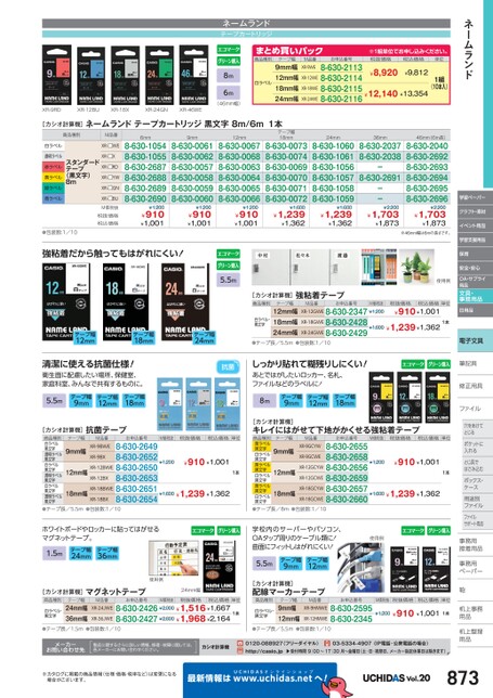 ネームランド学習ペーパークラフト・素材イベント用品学習支援用品保育安全・安心OA・サプライ用品文具・事務用品日用品電子文具筆記具筆記具修正用具正ファイルファイル穴をあけて穴をあけてとじるポケットにポケットに入れるとじ具でとじ具ではさみ込むボックス・ボックス・ケースス用途別用途別ファイルファイルサポート用品事務用務接着用品着事務用務ペーパーペーパー鞄机上事務上用品品机上整理上用品用品ホワイトボードやロッカーに貼ってはがせるマグネットテープ。1.5mテープ幅24mmテープ幅36mm学校内のサーバーやパソコン、OAタップ周りのケーブル類に!曲面にフィットしはがれにくい!5.5mテープ幅9mmテープ幅12mm使用例[カシオ計算機]マグネットテープ使用例24mm幅[カシオ計算機]配線マーカーテープ商品種別白ラベル・黒文字テープ幅24mm幅36mm幅M品番XR-24JWEXR-36JWEお申込番号M価税抜税抜価格税込価格単位8-630-2426¥2,000¥1,516¥1,6678-630-2427¥2,600¥1,968¥2,164商品種別1本白ラベル・黒文字テープ幅9mm幅12mm幅M品番XR-9HMWEXR-12HMWEお申込番号8-630-25958-630-2345M価税抜税抜価格税込価格単位¥1,200¥910¥1,0011本●テープ長/1.5m●包装数:1/10●テープ長/5.5m●包装数:1/10メーカーお問い合わせ先製品に関するさらに詳しい情報、修理・故障に関しては、各メーカーにお問い合わせください。カシオ計算機※カタログに掲載の商品情報(仕様・価格・税率など)は変更になる場合がございます。最新情報は0120-088927(フリーダイヤル)http://casio.jp▲受付時間9:00〜17:30月〜金曜日(土・日・祝祭日、メーカー指定休業日は除きます)03-5334-4907(IP電話・公衆電話の場合)UCHIDASww.uchidas.netwへ!Vol.20873ネームランドテープカートリッジXR-9RDXR-12BUXR-18XXR-24GNXR-46WE8m6m(46mm幅)白ラベルまとめ買いパック商品種別テープ幅9mm幅12mm幅18mm幅24mm幅M品番XR-9WEXR-12WEXR-18WEXR-24WEお申込番号8-630-21138-630-21148-630-21158-630-2116※1組単位申込。税抜価格税込価格単位¥8,920¥9,812¥12,140¥13,3541組(10本入)[カシオ計算機]ネームランドテープカートリッジ黒文字8m/6m1本白ラベル透明ラベル赤ラベル黄ラベル緑ラベル青ラベル商品種別M品番スタンダードテープ(黒文字)8mXR-XR-XR-XR-XR-WEXRDYWGNXR-BUM価税抜税抜価格税込価格●包装数:1/106mm8-630-10548-630-10558-630-26878-630-26888-630-26898-630-2690¥910¥1,001¥1,2009mm8-630-00618-630-00628-630-00578-630-00588-630-00598-630-0060¥910¥1,001¥1,20012mm8-630-00678-630-00688-630-00638-630-00648-630-00658-630-0066¥910¥1,001¥1,200テープ幅18mm8-630-00738-630-00748-630-00698-630-00708-630-00718-630-0072¥1,239¥1,362¥1,60024mm8-630-10608-630-10618-630-10568-630-10578-630-10588-630-1059¥1,239¥1,362¥1,60036mm8-630-20378-630-20388-630-2691---¥2,200¥1,703¥1,87346mm(6m長)8-630-20408-630-26928-630-26938-630-26948-630-26958-630-2696¥1,703¥1,873¥2,200※46mm幅は6mの長さです。使用例[カシオ計算機]強粘着テープ商品種別白ラベル・黒文字テープ幅12mm幅18mm幅24mm幅M品番お申込番号M価税抜税抜価格税込価格単位XR-12GWE8-630-2347¥1,200XR-18GWE8-630-2428XR-24GWE8-630-2429¥910¥1,001¥1,600¥1,239¥1,362●テープ長/5.5m●包装数:1/10しっかり貼れて糊残りしにくい!あとではがしたいロッカー、名札、ファイルなどのラベルに!8mテープ幅9mmテープ幅12mmテープ幅18mm[カシオ計算機]キレイにはがせて下地がかくせる強粘着テープ商品種別黄ラベル黒文字白ラベル黒文字黄ラベル黒文字白ラベル黒文字黄ラベル黒文字白ラベル黒文字テープ幅M品番9mm幅12mm幅18mm幅XR-9GCYWXR-9GCWEXR-12GCYWXR-12GCWEXR-18GCYWXR-18GCWEお申込番号8-630-26558-630-26588-630-26568-630-26598-630-26578-630-2660●テープ長/8m●包装数:1/10M価税抜税抜価格税込価格¥1,200¥910¥1,001¥1,600¥1,239¥1,3621本単位1本強粘着だから触ってもはがれにくい!5.5m抗菌テープ幅12mmテープ幅18mmテープ幅24mm清潔に使える抗菌仕様!衛生面に配慮したい場所、保健室、家庭科室、みんなで共有するものに。5.5mテープ幅9mmテープ幅12mmテープ幅18mm[カシオ計算機]抗菌テープ商品種別白ラベル黒文字透明ラベル黒文字白ラベル黒文字透明ラベル黒文字白ラベル黒文字透明ラベル黒文字テープ幅9mm幅M品番XR-9BWEXR-9BX12mm幅XR-12BWEXR-12BX18mm幅XR-18BWEXR-18BXお申込番号8-630-26498-630-26528-630-26508-630-26538-630-26518-630-2654●テープ長/5.5m●包装数:1/10M価税抜税抜価格税込価格単位¥1,200¥910¥1,0011本¥1,600¥1,239¥1,362