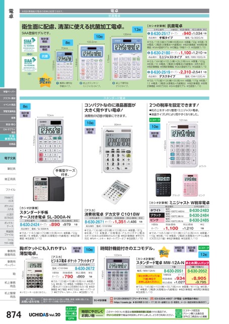 12桁[カシオ計算機]抗菌電卓お申込番号M価税抜税抜価格税込価格単位8-630-2517オープン¥940¥1,0341台手帳タイプ型式/SL-302CL-N●商品種別●寸法/118.5縦)×70横)×8高)mm●質量/50g●桁数/8●電源/2電源(太陽電池+内蔵電池)●税計算機能●時間計算機能●SIAA登録モデル●付属品/手帳ケース●包装数:1/108-630-2180オープン¥1,100¥1,2101台ミニジャストタイプ型式/MW-102CL-N●商品種別●寸法/144(縦)×105.5横)×26.2(高)mm●質量/100g●桁数/10●電源/2電源(太陽電池+内蔵電池)●特大表示●税計算機能●時間計算機能●SIAA登録モデル●包装数:1/108-630-2519オープン¥2,310¥2,5411台デスクタイプ型式/DW-122CL-N●商品種別10桁105.5mm126mm175mm144mm118.5mm税計算機能時間計算機能抗菌8桁70mm(●●)(●)SIAA登録モデルです。衛生面に配慮、清潔に使える抗菌加工電卓。電卓抗菌電卓※税計算機能付電卓の税率は変更できます。電卓●携帯に便利な手帳タイプ。●机上がスッキリ!ミニジャストタイプ。●卓上で便利なデスクタイプ。●寸法/175縦)×126(横)×35高)mm●質量/170g●桁数/12●電源/2電源(太陽電池+内蔵電池)●税計算機能●時間計算機能●早打ち対応●SIAA登録モデル●包装数:1/10ホワイトブラックピンク2つの税率を設定できます!●机の上をすっきり整理!ミニジャスト電卓。●液晶サイズUPにより見やすくなりました。101mm148.5mm10桁税計算機能スタンダード電卓コンパクトなのに液晶画面が大きく見やすい電卓!消費税の切替が簡単にできます。10桁税計算機能89mm136mm手帳型ケース付き。8桁税計算機能70mm118.5mm[カシオ計算機]スタンダード手帳ケース付き電卓SL-300A-Nお申込番号M価税抜8-630-2424オープン税抜価格¥890税込価格¥979単位1台商品種別型式/SL-300A-N●寸法/118.5(縦)×70(横)×8(高)mm●質量/50g●桁数/8●電源/2電源(太陽電池+内蔵電池)●税計算機能●包装数:1/10[アスカ]消費税電卓デカ文字C1018Wお申込番号M価税抜税抜価格税込価格8-630-2671オープン¥1,351¥1,486単位1台商品種別型式/C1018W●寸法/136(縦)×89(横)×10(高)mm●質量/87g●桁数/10●電源/太陽電池・アルカリボタン電池(LR1130または同規格のもの)1個●税計算機能●早打ち対応●%キー、±キー●オートパワーオフ●包装数:1/10[カシオ計算機]ミニジャストW税率電卓ホワイトブラックピンクM価税抜オープン商品種別型式/MW-100TC-WE-N型式/MW-100TC-BK-N型式/MW-100TC-PK-N税抜価格¥1,100お申込番号8-630-24838-630-24848-630-2485税込価格¥1,210単位1台●寸法/148.5(縦)×101(横)×27.6(高)mm●質量/110g●桁数/10●電源/2電源(太陽電池+リチウム電池(CR2032)1個)●税計算機能●包装数:1/10税計算機能10桁時間計機能付きのエコモデル。時間計算機能税計算機能●寸法/145(縦)×103(横)×30.7高)mm●質量/約110g●桁数/12●電源/2電源(太陽電池+内蔵電池)●税計算機能●時間計算機能●包装数:1/1012桁まとめ買いパック1組(10台入)8-630-2052ー¥8,905¥9,795[カシオ計算機]スタンダード電卓MW-12A-N商品種別型式/MW-12A-N「まとめ買いパック」は、「1組」単位でお申し込みください。1台8-630-2051M価税抜税抜価格税込価格オープン¥934¥1,027103mm145mm胸ポケットにも入れやすい薄型電卓。70mm[アスカ]ビジネス電卓ポケットフラットタイプ商品種別型式/C1019Wお申込番号8-630-2672単位1台税抜価格¥790税込価格¥869M価税抜オープン●寸法/120(縦)×70横)×9(高)mm●質量/52g●桁数/10●電源/太陽電池・アルカリボタン電池(LR1130または同規格のもの)1個●税計算機能●GT機能●早打ち対応●オートパワーオフ●桁下げキー、%キー、±キー●包装数:1/10※メモリーキーはありません。120mm学習ペーパークラフト・素材イベント用品学習支援用品保育安全・安心OA・サプライ用品文具・事務用品日用品電子文具筆記具筆記具修正用具修正用ファイルファイル穴をあけて穴をあけてとじるポケットにポケットに入れるとじ具でとじ具ではさみ込むボックス・ボックス・ケース用途別用途別ファイルファイルサポート用品事務用事務接着用品接着用事務用事務用ペーパーペーパー鞄鞄机上事務机上事用品用品机上整理机上整用品用品メーカーお問い合わせ先製品に関するさらに詳しい情報、修理・故障に関しては、各メーカーにお問い合わせください。カシオ計算機0120-088927(フリーダイヤル)http://casio.jp▲受付時間9:00〜17:30月〜金曜日(土・日・祝祭日、メーカー指定休業日は除きます)03-5334-4907(IP電話・公衆電話の場合)874Vol.20地球にやさしくお買い物このマークのついた商品は地球環境保護に配慮された商品です。グリーンの文字で商品の判別をしやすくしました。どうぞご利用ください。エコマーク認定品グリーン購入法適合品GPNエコ商品ねっと掲載