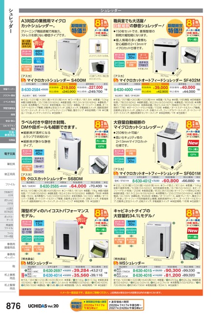 シュレッダー職員室でも大活躍!自動細断の静音シュレッダー!●150枚セットでき、書類整理の時間大幅短縮になります。沖縄・離島はサービス対象外沖縄・離島はサービス対象外357mm263mm[アスカ]お申込番号マイクロカットオートフィードシュレッダーSF402M税抜価格¥40,0001台期間限定特価税抜価格通常価格¥50,000M価税抜単位8-630-4000¥39,000¥42,900税込価格¥44,000税込価格商品種別型式/SF402M532mmオートフィードホチキス11号針以下※手差しのみ最大投入幅219mm2×13mmマイクロカット連続時間30分最大細断枚数8枚●個人情報の多い書類も安心細断の2×13mmマイクロカット仕様です。メンテナンスオイル付き。ゴミ捨てしやすい独立型ダストボックス。520mmmm583[アスカ]マイクロカットシュレッダーS400Mお申込番号M価税抜期間限定特価税抜価格¥219,000¥240,900税込価格通常価格税抜価格¥227,000税込価格¥249,700単位1台学習ペーパー8-630-2584¥305,000クラフト・素材商品種別型式/S400MA3対応の業務用マイクロカットシュレッダー。クリーニング機能搭載で高耐久、ストレスを感じない静音タイプです。935mm搬入・設置・動作確認込(本州・九州)最大投入幅310mm2×15mmマイクロカット最大細断枚数20枚連続時間60分ダストボックス90Lホチキス11号針以下シュレッダー●寸法/520(幅)×385(奥)×935(高)mm●コード長さ/約1.8m●質量/53kg●最大細断枚数/20/19枚(50/60Hz)●細断速度/約3.2m/分(50/60Hz)●運転音/54dB●消費電力/750W●使用電源/AC100V●機能/オートリバース機構、オートスタート&ストップ機構、自動停止安全スイッチ、逆転スイッチ、手動細断スイッチ、細断屑満杯センサースイッチ、オート・マニュアルクリーニング機能、警告ランプ●保証期間/1年●付属品/ゴミ袋、メンテナンスオイル●包装数:1●寸法/357(幅)×263(奥)×532(高)mm●質量/8.7kg●材質/ABS樹脂●定格細断枚数/7枚(50/60Hz)●細断速度/約2.0m/分(50/60Hz)●運転音/約50dB●消費電力/180W(50/60Hz)●屑箱容量/約21LA4コピー用紙約707枚/オートフィード時約177枚)●オートフィードセット枚数/150枚●機能/オートスタート&ストップ機構、自動停止安全スイッチ、逆転スイッチ、手動スイッチ、フィーダカバースイッチ、オートフィードスタートスイッチ、細断屑満杯センサースイッチ●保証期間/1年●包装数:1沖縄・離島はサービス対象外m最大投入幅225mm2×13mmマイクロカット最大細断枚数9枚連続時間30分[アスカ]439mm324mマイクロカットオートフィードシュレッダーSF601M商品種別型式/SF601Mお申込番号M価税抜8-630-4012¥76,000税抜価格¥60,800税込価格¥66,880単位1台●寸法/439(幅)×324(奥)×668(高)mm●コード長さ/約1.6m●質量/14kg●最大細断枚数/9/8枚(50/60Hz)●定格細断枚数/8/7枚(50/60Hz)●オートフィードセット枚数/250枚●屑箱容量/約30L約1050枚/オートフィード時約250枚)●細断速度/約1.9/2.2m/分(50/60Hz)●消費電力/250/270W(50/60Hz)●使用電源/AC100V●運転音/約48dB●機能/オートリバース、温度ブレーカー、警告ランプ、手差し/オートフィード同時細断防止機構、細断屑満杯センサー、オートスタート&ストップ、自動停止安全スイッチ、逆転スイッチ、手動細断スイッチ●保証期間/1年間●包装数:1410mmmm592クロスカットシュレッダーS68DM商品種別型式/S68DMお申込番号M価税抜8-630-2585¥90,000税抜価格¥64,000税込価格¥70,400単位1台●寸法/410(幅)×295(奥)×649(高)mm●コード長さ/約1.6m●質量/19kg●最大細断枚数/17/16枚(50/60Hz)●細断速度/約2.4/2.8m/分(50/60Hz)●運転音/58dB●屑箱容量/約33L●消費電力/320/330W(50/60Hz)●使用電源/AC100V●機能/オートリバース機構、オートスタート&ストップ機構、自動停止安全スイッチ、逆転スイッチ、手動細断スイッチ、細断屑満杯センサースイッチ、オートクリーニング●保証期間/1年●包装数:1649mm連続時間40分ホチキス11号針以下カードCD/DVD最大投入幅220mm4×40mmクロスカット最大細断枚数17枚[アスカ]668mmラベル付きや窓付き封筒、DMや段ボールも細断できます。●細断屑が満杯になるとランプでお知らせ!●細断音が静かな静音タイプ。沖縄・離島はサービス対象外大容量自動細断のマイクロカットシュレッダー!●250枚セット可能!●高いセキュリティ性の2×13mmマイクロカット仕様です。●沖縄・離島はサービス対象外640mm最大投入幅230mm約2×10mmクロスカット(●)最大細断枚数17枚(●)連続時間30分約4×40mmクロスカット(●)最大細断枚数25枚(●)●沖縄・離島はサービス対象外(●)600mm最大投入幅220mmホチキス10〜11号針2×12mmマイクロカット(●)最大細断枚数14枚(●)連続時間15分クリップ28mm以下約4×40mmクロスカット(●)最大細断枚数17枚(●)お申込番号M価税抜8-630-4015¥129,0008-630-4016¥116,000税抜価格税込価格¥90,300¥99,330¥81,200¥89,320単位1台商品種別型式/MSR-17MCM型式/MSR-25CM●●単位1台お申込番号M価税抜税抜価格8-630-2697¥56,800¥39,284¥43,2128-630-4014¥50,800¥35,560¥39,116税込価格商品種別型式/MSE-14MC型式/MSE-17C●●●寸法/384(幅)×256(奥)×600(高)mm●質量/●約14kg、●約13.5㎏●細断速度(50/60Hz)/●約1.8/2.1m/分、●約1.3/1.6m/分●消費電力(50/60Hz)/●約340/420W、●約290/350W●運転音/●55dB、●62dB●屑箱