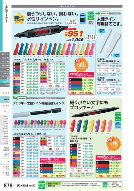 水性マーカー裏うつりしない。臭わない。水性サインペン。インク鮮やかな発色。耐水性・耐光性に優れています。詰替え可能!太6mm線幅細1.2〜1.8mm黒税抜1組(10本入)¥9511,046税込¥詰め替え用プロッキー替芯太細ツイン専用替芯です。詰替タイプ細字用3本入●蛍光色も3色ご用意!太字用2本入●M価税抜¥50[三菱鉛筆]プロッキー細字用替芯3本入商品種別型式/PMS54BMお申込番号8-631-1032税抜価格¥40税込価格¥44単位1パック(3本入)●寸法/80×40×4mm●質量/0.7g●材質/スライバー●包装数:1/10[三菱鉛筆]プロッキー太字用替芯2本入商品種別型式/PMS57FKお申込番号8-631-1033税抜価格¥40税込価格¥44単位1パック(2本入)●寸法/80×40×5mm●質量/0.8g●材質/フィラメント●包装数:1/10●M価税抜¥501本あたり95.1税込¥104.6税抜¥お得まとめ買いパック※1組単位申込。商品種別お申込番号8-631-29128-631-29138-631-29148-631-3204黒赤青緑税抜価格¥951税込価格単位¥1,0461組(10本入)[三菱鉛筆]プロッキー太細ツイン単色1本商品種別黒赤青緑ソフトピンク黄紫橙水色茶黄緑色番号/24色番号/15色番号/33色番号/6色番号/66色番号/2色番号/12色番号/4色番号/8色番号/21色番号/5お申込番号8-631-29008-631-29018-631-29028-631-29038-631-34248-631-29058-631-29068-631-29078-631-29088-631-29098-631-2910商品種別黄土色赤紫灰うすだいだい蛍光黄蛍光橙蛍光桃色番号/19色番号/11色番号/37色番号/54色番号/k.2色番号/k.4色番号/k.13M価税抜¥150税抜価格¥99お申込番号8-631-29118-631-30768-631-30778-631-30788-631-30798-631-30808-631-3081税込価格¥108単位1本●型式/PM150TR●線幅/細1.2〜1.8mm、太6mm●寸法/22径)×145(長)×23(厚)mm●質量/27.1g●詰替タイプ●包装数:1/10赤青緑ソフトピンク黄紫橙水色茶黄緑黄土色赤紫灰うすだいだい蛍光黄蛍光橙蛍光桃●781本あたり税込¥85.8税抜¥お得線幅極細0.4mm細0.9mm紫橙ソフトピンクまとめ買いパック※1組単位申込。商品種別お申込番号8-631-20108-631-20118-631-20128-631-3205黒赤青緑税抜価格¥780税込価格¥858単位1組(10本入)赤緑黄青[三菱鉛筆]プロッキー細・極細ツイン単色1本商品種別黒赤青緑黄紫橙ソフトピンク色番号/24色番号/15色番号/33色番号/6色番号/2色番号/12色番号/4色番号/66M価税抜¥120税抜価格¥84お申込番号8-631-00188-631-00198-631-00208-631-10478-631-10488-631-10498-631-10508-631-3425税込価格¥92単位1本●型式/PM120T●線幅/極細0.4mm、細0.9mm●寸法/13径)×145長)×17※細・極細ツインは詰め替えタイプではありません。(厚)mm●包装数:1/10赤青緑ソフトピンク黄紫橙水色茶黄緑黄土色赤紫うすだいだい蛍光黄蛍光橙蛍光桃[三菱鉛筆]詰替え用インク単色1本商品種別黒赤青緑ソフトピンク黄紫橙水色茶黄緑黄土色赤紫うすだいだい色番号/24色番号/15色番号/33色番号/6色番号/66色番号/2色番号/12色番号/4色番号/8色番号/21色番号/5色番号/19色番号/11色番号/54お申込番号8-631-10348-631-10358-631-10368-631-10378-631-34508-631-10388-631-10398-631-10408-631-10428-631-10438-631-10448-631-10458-631-30848-631-3086商品種別蛍光黄蛍光橙蛍光桃M価税抜¥70色番号/k.2色番号/k.4色番号/k.13税抜価格¥48お申込番号8-631-30878-631-30888-631-3089税込価格¥52単位1本●型式/PMR70●寸法/19(径)×87(長)×20(厚)mm●質量/14.7g●材質/ケース:再生ポリプロピレン●包装数:1/10まとめ買いパック※1組単位申込。商品種別お申込番号8-631-26418-631-26428-631-2643黒赤青税抜価格¥465税込価格¥511単位1組(10本入)詰め替え用プロッキー詰替え用インクプロッキー太細ツイン専用詰替えインク。黒細く小さい文字にもプロッキー!黒878Vol.20地球にやさしくお買い物このマークのついた商品は地球環境保護に配慮された商品です。グリーンの文字で商品の判別をしやすくしました。どうぞご利用ください。エコマーク認定品グリーン購入法適合品GPNエコ商品ねっと掲載水性マーカー学習ペーパークラフト・素材イベント用品学習支援用品保育安全・安心OA・サプライ用品文具・事務用品日用品電子文具電子文筆記具修正用具修正用ファイルファイル穴をあけて穴をあけてとじるポケットにポケットに入れるとじ具でとじ具ではさみ込むボックス・ボックス・ケース用途別用途別ファイルファイルサポート用品事務用事務接着用品接着用事務用事務用ペーパーペーパー鞄鞄机上事務机上事用品用品机上整理机上整用品用品