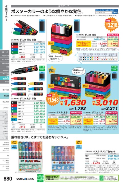 水性マーカーポスターカラーのような鮮やかな発色。ポスカのいろいろな使い方はこちらへ!アイラブポスカ●すぐ乾いて水に流れず、重ね書きもできます。●にじみや裏うつり、イヤな臭いもありません。●不透明インクなので金属・ガラス・プラスチックなどにも書けます。1箱あたり3,216税込¥3,537税抜¥お得線幅15mm[三菱鉛筆]ポスカ極太商品種別型式/PC17K8C1箱(8色入)8-631-1076まとめ買いパック1組(8色入×5箱)8-631-3206「まとめ買いパック」は、「1組」単位でお申し込みください。¥16,080¥17,688●線幅/15mm●寸法/パッケージ:161縦)×115横)×59厚)mm●質量/618g●色/8色入(黒、青、水色、緑、黄、桃、赤、白)●包装数:1/5¥3,360¥3,696M価税抜税抜価格税込価格¥24,000¥4,8008色入薄橙灰山吹黄緑緑黄桃赤白茶紫橙●●●●●●●●●●●●●●●●●水色●●黒青8色15色●●●●線幅15mmの極太タイプ。線幅8mmの太字タイプ。線幅8mm8色入15色入黒赤青緑線幅15mm[三菱鉛筆]ポスカ極太単色黒赤青緑M価税抜¥600商品種別色番号/24色番号/15色番号/33色番号/6税抜価格¥450お申込番号8-631-10728-631-10738-631-10748-631-1075税込価格¥495単位1本●型式/PC17K●線幅/15mm●寸法/28(径)×157(長)mm●質量/69.9g●包装数:1/5黒赤青緑線幅8mm黄水色税抜1箱(8色入)¥1,630税込¥1,793税抜1箱(15色入)¥3,010税込¥3,311[三菱鉛筆]ポスカ太字商品種別型式/PC8K8C「まとめ買いパック」は、「1組」単位でお申し込みください。1箱(8色入)8-631-0027M価税抜¥2,400税抜価格¥1,630¥1,793税込価格まとめ買いパック1組(8色入×10箱)8-631-3207¥24,000¥15,480¥17,028[三菱鉛筆]ポスカ太字商品種別型式/PC8K15C「まとめ買いパック」は、「1組」単位でお申し込みください。1箱(15色入)8-631-0028M価税抜¥4,500税抜価格¥3,010¥3,311税込価格まとめ買いパック1組(15色入×5箱)8-631-3208¥22,500¥14,280¥15,708●線幅/8mm●寸法/パッケージ:130(縦)×208(横)×27(厚)mm●質量/400g●色/8色入(黒、青、水色、緑、黄、桃、赤、白)●包装数:1/10●線幅/8mm●寸法/パッケージ:127縦)×124(横)×76(厚)mm●質量/689g●色/15色入(黒、青、水色、緑、黄、桃、赤、白、茶、紫、橙、黄緑、山吹、灰、うすだいだい)●包装数:1/51箱あたり1,548税込¥1,702税抜¥お得お申込番号8-631-10528-631-10538-631-10548-631-10558-631-10568-631-10578-631-10588-631-1059税抜価格¥210税込価格¥231単位1本●型式/PC8K●線幅/8mm●寸法/24(径)×123.3(長)mm●質量/44.7g●包装数:1/5桃白[三菱鉛筆]ポスカ太字単色商品種別色番号/24色番号/15色番号/33色番号/6色番号/13色番号/2色番号/8色番号/1黒赤青緑桃黄水色白M価税抜¥300重ね書きOK。こすっても落ちないラメ入。細字7色入線幅1.0mm極細7色入線幅0.7mm[三菱鉛筆]ポスカラメ入7色セット細字極細M価税抜¥1,750商品種別型式/PC3ML7C型式/PC1ML7Cお申込番号8-631-45328-631-4533税抜価格¥1,405税込価格¥1,545単位1組(7色入)●線幅/細字:1.0mm、極細:0.7mm●寸法/パッケージ:細字:145(縦)×110(横)×20(厚)mm、極細:124(縦)×110(横)×20(厚)mm●質量/細字:104g、極細:91.1g●色/7色入(グリーン、ライトブルー、ブルー、バイオレット、ピンク、レッド、オレンジ)●ラメ入●包装数:1/10極細Vol.20地球にやさしくお買い物このマークのついた商品は地球環境保護に配慮された商品です。グリーンの文字で商品の判別をしやすくしました。どうぞご利用ください。エコマーク認定品グリーン購入法適合品GPNエコ商品ねっと掲載細字880水性マーカー学習ペーパークラフト・素材イベント用品学習支援用品保育安全・安心OA・サプライ用品文具・事務用品日用品電子文具電子文筆記具修正用具修正用ファイルファイル穴をあけて穴をあけてとじるポケットにポケットに入れるとじ具でとじ具ではさみ込むボックス・ボックス・ケース用途別用途別ファイルファイルサポート用品事務用事務接着用品接着用事務用事務用ペーパーペーパー鞄鞄机上事務机上事用品用品机上整理机上整用品用品