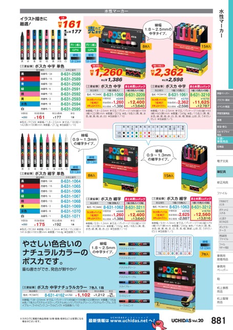 水性マーカー学習ペーパークラフト・素材イベント用品学習支援用品保育安全・安心OA・サプライ用品文具・事務用品日用品電子文具子筆記具修正用具正ファイルファイル穴をあけて穴をあけてとじるポケットにポケットに入れるとじ具でとじ具ではさみ込むボックス・ボックス・ケースス用途別用途別ファイルファイルサポート用品事務用務接着用品着事務用務ペーパーペーパー鞄机上事務上用品品机上整理上用品用品黒赤青緑桃黄水色[三菱鉛筆]ポスカ細字単色商品種別白線幅0.9〜1.3mmお申込番号8-631-10648-631-10658-631-10668-631-10678-631-10688-631-10698-631-10708-631-1071色番号/24色番号/15色番号/33色番号/6色番号/13色番号/2色番号/8色番号/1税抜価格¥175税込価格¥192単位1本●型式/PC3M●線幅/0.9〜1.3mm141.6長)×18.5厚)mm●質量/14.4g●寸法/15.3径)×●包装数:1/10線幅0.9〜1.3mm8色入線幅0.9〜1.3mmの細字タイプ。15色入[三菱鉛筆]ポスカ細字商品種別型式/PC3M8C1箱(8色入)8-631-1062まとめ買いパック1組(8色入×10箱)8-631-3211¥20,000M価税抜¥2,000「まとめ買いパック」は、「1組」単位で¥12,400¥13,640●線幅/0.9〜1.3mm●寸法/パッケージ:155縦)×131税抜価格¥1,260¥1,386お申し込みください。(横)×22(厚)mm●質量/150g●色/8色入(黒、青、税込価格水色、緑、黄、桃、赤、白)●包装数:1/10[三菱鉛筆]ポスカ細字商品種別型式/PC3M15C1箱(15色入)8-631-1063まとめ買いパック1組(15色入×5箱)8-631-3212¥18,750M価税抜¥3,750「まとめ買いパック」は、税込価格「1組」単位で¥12,560¥13,816●線幅/0.9〜1.3mm●寸法/パッケージ:146(縦)×79税抜価格¥2,625¥2,887お申し込みください。(横)×57(厚)mm●質量/240g●色/15色入(黒、青、水色、緑、黄、桃、赤、白、茶、紫、橙、黄緑、山吹、灰、うすだいだい)●包装数:1/5線幅1.8〜2.5mm7色入コーラルピンク●ライトピンクスカイブルー●●パステルパープル●パステルグリーン●パステルオレンジ●パステルイエロー●7色パステルイエローパステルオレンジパステルグリーンパステルパープルスカイブルーライトピンクコーラルピンクやさしい色合いのナチュラルカラーのポスカです。重ね書きができ、発色が鮮やか!!線幅1.8〜2.5mmの中字タイプ。[三菱鉛筆]ポスカ中字ナチュラルカラー7色入1箱商品種別型式/PC5M7Cお申込番号M価税抜8-631-4162¥1,750税抜価格¥1,102税込価格¥1,212(7色入)●線幅/1.8〜2.5mm●寸法/パッケージ:149(縦)×139横)×22厚)mm●質量/182g●色/7色入(パステルイエロー、パステルオレンジ、パステルグリーン、パステルパープル、スカイブルー、ライトピンク、コーラルピンク)●包装数:1/10単位1箱※カタログに掲載の商品情報(仕様・価格・税率など)は変更になる場合がございます。最新情報はUCHIDASww.uchidas.netwへ!Vol.20881黒赤青緑桃黄水色白[三菱鉛筆]ポスカ中字単色商品種別線幅線幅1.8〜2.5mm1.8〜2.5mm8色入15色入色番号/24色番号/15色番号/33色番号/6色番号/13色番号/2色番号/8色番号/1お申込番号8-631-25888-631-25898-631-25908-631-25918-631-25928-631-25938-631-25948-631-2595単位1本1箱(8色入)税抜¥1,2601,386[三菱鉛筆]ポスカ中字税込¥商品種別型式/PC5M8C1箱(8色入)8-631-1060まとめ買いパック1組(8色入×10箱)8-631-3209M価税抜¥2,000「まとめ買いパック」は、「1組」単位でお申し込みください。税抜価格¥1,260¥1,386¥12,400¥13,640●線幅/1.8〜2.5mm●寸法/パッケージ:149縦)×159(横)×22(厚)mm●質量/207g●色/8色入(黒、青、水税込価格¥20,000色、緑、黄、桃、赤、白)●包装数:1/101箱(15色入)税抜¥2,362税込¥2,598[三菱鉛筆]ポスカ中字商品種別型式/PC5M15C1箱(15色入)8-631-1061まとめ買いパック1組(15色入×5箱)8-631-3210¥18,750M価税抜¥3,750「まとめ買いパック」は、税込価格「1組」単位で¥11,625¥12,787●線幅/1.8〜2.5mm●寸法/パッケージ:146(縦)×93税抜価格¥2,362¥2,598お申し込みください。(横)×60(厚)mm●質量/349g●色/15色入(黒、青、水色、緑、黄、桃、赤、白、茶、紫、橙、黄緑、山吹、灰、うすだいだい)●包装数:1/5税抜価格¥161税込価格¥177●線幅/1.8〜2.5mm●型式/PC5M142(長)×18厚)mm●質量/21.3g●包装数:1/10●寸法/18(径)×薄橙灰山吹黄緑緑黄桃赤白茶紫橙●●●●●●●●●●●●●●●●●水色●●黒青8色15色●●●●線幅0.9〜1.3mmの細字タイプ。イラスト描きに最適!1本税抜¥161税込¥177水性マーカー線幅1.8〜2.5mmの中字タイプ。黒赤青緑桃黄水色白M価税抜¥250黒赤青緑桃黄水色白M価税抜¥250