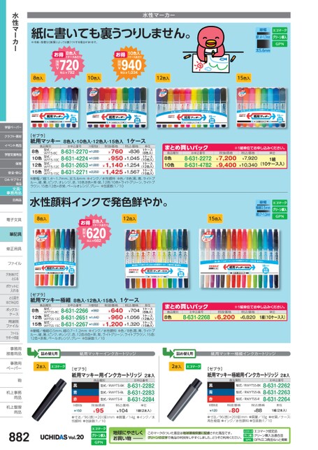 12色入15色入商品種別まとめ買いパック8色10色8-631-22728-631-4782お申込番号※1組単位申込。税抜価格¥7,200¥9,400税込価格¥7,920¥10,340単位1組(10ケース入)10色入1ケースあたり940税込¥1,034税抜¥お得10色入お得8色入1ケースあたり7税込¥792税抜¥8色入[ゼブラ]紙用マッキー8色入・10色入・12色入・15色入1ケース単位M価税抜税抜価格お申込番号商品種別型式/WYT5-8C型式/WYT5-10C型式/WYT5-12C型式/WYT5-15C8-631-2270¥1,2008-631-4224¥1,5008-631-2653¥1,8008-631-2271¥2,2508色10色12色15色(15色入)●線幅/細:1.4〜1.7mm、太:5.6mm●インク/水性顔料●色/8色:黒、青、ライトブルー、緑、黄、ピンク、オレンジ、赤、10色:8色+茶・紫、12色:10色+ライトグリーン、ライトブラウン、15色:12色+赤紫、ペールオレンジ、グレー●包装数:1/10税込価格¥760¥836¥950¥1,045¥1,140¥1,254¥1,425¥1,567(10色入)(12色入)(8色入)1ケース1ケース1ケース1ケース紙に書いても裏うつりしません。※半紙・辞書など紙質によっては裏うつりする場合があります。水性マーカー線幅細1.4〜1.7mm太5.6mm線幅極細0.5mm細0.7〜1.2mm12色入15色入1ケースあたり60税込¥682税抜¥お得8色入8色入水性顔料インクで発色鮮やか。[ゼブラ]紙用マッキー極細8色入・12色入・15色入1ケース税抜価格お申込番号M価税抜¥9608-631-2266商品種別型式/WYTS5-8C型式/WYTS5-12C8-631-2651¥1,440WYTS5-15C8-631-2267¥1,8008色12色15色(15色入)●線幅/極細:0.5mm、細:0.7〜1.2mm●インク/水性顔料●色/8色:黒、青、ライトブルー、緑、黄、ピンク、オレンジ、赤、12色:8色+茶、紫、ライトグリーン、ライトブラウン、15色:12色+赤紫、ペールオレンジ、グレー●包装数:1/10税込価格¥640¥704¥960¥1,056¥1,200¥1,320(12色入)(8色入)1ケース1ケース1ケース型式/単位まとめ買いパック8-631-22688色お申込番号商品種別※1組単位申込。税抜価格¥6,200税込価格¥6,820単位1組(10ケース入)詰め替え用紙用マッキーインクカートリッジ詰め替え用紙用マッキー極細インクカートリッジ2本入[ゼブラ]紙用マッキー用インクカートリッジ2本入黒青赤M価税抜¥150商品種別型式/RWYT5-BK型式/RWYT5-BL型式/RWYT5-Rお申込番号8-631-22828-631-22838-631-2284税抜価格¥95税込価格¥104単位1組(2本入)2本入[ゼブラ]紙用マッキー極細用インクカートリッジ2本入黒青赤M価税抜¥120商品種別型式/RWYTS5-BK型式/RWYTS5-BL型式/RWYTS5-Rお申込番号8-631-22628-631-22638-631-2264税抜価格¥80税込価格¥88単位1組(2本入)●寸法/96(長)×20(径)mm●質量/14g●インク/水性顔料●包装数:1/10●寸法/96長)×20径)mm●質量/10g●材質/ケース:再生樹脂●インク/水性顔料●包装数:1/10水性マーカー学習ペーパークラフト・素材イベント用品学習支援用品保育安全・安心OA・サプライ用品文具・事務用品日用品電子文具電子文筆記具修正用具修正用ファイルファイル穴をあけて穴をあけてとじるポケットにポケットに入れるとじ具でとじ具ではさみ込むボックス・ボックス・ケース用途別用途別ファイルファイルサポート用品事務用事務接着用品接着用事務用事務用ペーパーペーパー鞄鞄机上事務机上事用品用品机上整理机上整用品用品882Vol.20地球にやさしくお買い物このマークのついた商品は地球環境保護に配慮された商品です。グリーンの文字で商品の判別をしやすくしました。どうぞご利用ください。エコマーク認定品グリーン購入法適合品GPNエコ商品ねっと掲載
