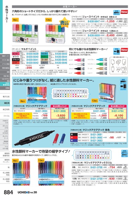 六角形のショートサイズだから、しっかり握れて使いやすい!水性マーカー紙、プラスチック、金属、ガラスなど、いろいろな素材に描けるので工作にも最適です。8色入12色入線幅中字丸1.4mm[パイロット]商品種別ジュースペイント中字丸芯8色セット単位1セット型式/SJP160MN-8Cお申込番号M価税抜8-630-5647¥2,000税抜価格¥1,255税込価格¥1,380(8色入)●線幅/中字1.4mm●寸法/157(幅)×20奥)×122(高)mm●質量/190g●材質/軸:樹脂(かくはん用ボール入)、キャップ:樹脂●インク/水性顔料●色/8色入(ピンク、レッド、イエロー、グリーン、ブルー、ライトブルー、ホワイト、ブラック)●包装数:1/10[パイロット]商品種別ジュースペイント中字丸芯12色セットお申込番号税抜価格M価税抜型式/SJP240MN-12C8-630-5659¥3,000¥2,400(12色入)●線幅/中字1.4mm●寸法/118(幅)×38(奥)×122(高)mm●質量/268.3g●材質/軸:樹脂(かくはん用ボール入)、キャップ:樹脂●インク/水性顔料●色/12色入(ピンク、レッド、オレンジ、イエロー、グリーン、ブルー、ライトブルー、ライトグリーン、ペールオレンジ、ブラウン、ブラック、バイオレット)●包装数:1/10税込価格¥2,640単位1セット[マービー]商品種別マルチペイントピンクホワイトブラックレッドM価税抜¥320型式/224P-9型式/224P-0型式/224P-1型式/224P-2お申込番号8-630-56398-630-56408-630-56418-630-5642商品種別ライトブルーライトグリーンゴールドシルバー型式/224P-10型式/224P-11型式/224P-M13型式/224P-M12税抜価格¥256税込価格¥281お申込番号8-630-56438-630-56448-630-56458-630-5646単位1本●線幅/平1.5〜4mm●寸法/141(長)×12(径)mm●質量/25g●材質/本体・キャップ:ポリプロピレン、ペン先:ポリエステル●インク/水性顔料(直液式)●筆記可能箇所/紙、木、ガラス、金属、布、ビニール、プラスチックなど●包装数:1/3何にでも描ける水性顔料マーカー!下地に透けにくいので、素材を選ばない多種多様な使い方が可能です。線幅平1.5〜4mmピンクホワイトブラックレッドライトブルーライトグリーンゴールドシルバー線幅細1〜2mm太2.5×6mmうす橙黄緑黒青空緑黄橙桃赤茶紫8色12色●●●●●●●●●●●●●●●●●●●●8色入12色入にじみや裏うつりがなく、紙に適した水性顔料マーカー。鮮明な発色で耐光性に優れ、色あせしにくい!金属・ガラス・プラスチックにもOK。[寺西化学工業]マジックアクアテック商品種別型式/MAQ50C-8「まとめ買いパック」は、「1組」単位でお申し込みください。1箱(8色入)8-631-3694M価税抜税抜価格税込価格¥1,200¥769¥845まとめ買いパック1組(8色入×5箱)8-631-3696ー¥3,820¥4,202[寺西化学工業]マジックアクアテック商品種別型式/MAQ50C-12「まとめ買いパック」は、「1組」単位でお申し込みください。1箱(12色入)8-631-3695M価税抜税抜価格税込価格¥1,800¥1,260¥1,386まとめ買いパック1組(12色入×5箱)8-631-4784ー¥6,100¥6,710●線幅/太2.5×6mm、細1〜2mm●寸法/179(幅)×25奥)×150(高)mm●質量/243g●材質/ポリプロピレン●色/8色入(黒、青、空、緑、黄、橙、桃、赤)●包装数:1/5●線幅/太2.5×6mm、細1〜2mm●寸法/132(幅)×43(奥)×150(高)mm●質量/347g●材質/ポリプロピレン●色/12色入(黒、青、空、緑、黄、橙、桃、赤、茶、紫、黄緑、うす橙)●包装数:1/5[寺西化学工業]マジックアクアテック単色商品種別型式/MAQ50-T1お申込番号M価税抜税抜価格税込価格単位型式/MAQ50-T2黒赤青●線幅/太2.5×6mm、細1〜2mm●寸法/147.5(長)×24(径)mm●質量/26g●材質/ポリプロピレン●インク/水性顔料●包装数:1/108-631-36818-631-36828-631-3683型式/MAQ50-T3¥98¥107¥1501本黒赤青線幅極細0.5mm細0.6〜1.0mmうす橙黄緑黒青空緑黄橙桃赤茶紫8色12色●●●●●●●●●●●●●●●●●●●●[寺西化学工業]マジックアクアテックスリム商品種別型式/MAQ70C-88色(8色入)●線幅/極細0.5mm、細0.6〜1.0mm●寸法/101幅)×18奥)×145高)mm●質量/97g●材質/ポリプロピレン●インク/水性顔料●色/8色入(黒、青、空、緑、黄、橙、桃、赤)●包装数:1/58-631-3708¥754税込価格¥829単位1箱お申込番号税抜価格M価税抜¥960商品種別お申込番号M価税抜税抜価格税込価格型式/MAQ70C-1212色(12色入)●線幅/極細0.5mm、細0.6〜1.0mm●寸法/150幅)×18奥)×145高)mm●質量/144g●材質/ポリプロピレン●インク/水性顔料●色/12色入(黒、青、空、緑、黄、橙、桃、赤、茶、紫、黄緑、うす橙)●包装数:1/58-631-3709¥1,440¥930¥1,023単位1箱水性顔料マーカーで待望の細字タイプ!書き味なめらかな細字・極細字の両用タイプ。携帯クリップ付き。8色入12色入水性マーカー学習ペーパークラフト・素材イベント用品学習支援用品保育安全・安心OA・サプライ用品文具・事務用品日用品電子文具電子文筆記具修正用具修正用ファイルファイル穴をあけて穴をあけてとじるポケットにポケットに入れるとじ具でとじ具ではさみ込むボックス・ボックス・ケース用途別用途別ファイルファイルサポート用品事務用事務接着用品接着用事務用事務用ペーパーペーパー鞄鞄机上事務机上事用品用品机上整理机上整用品用品884Vol.20