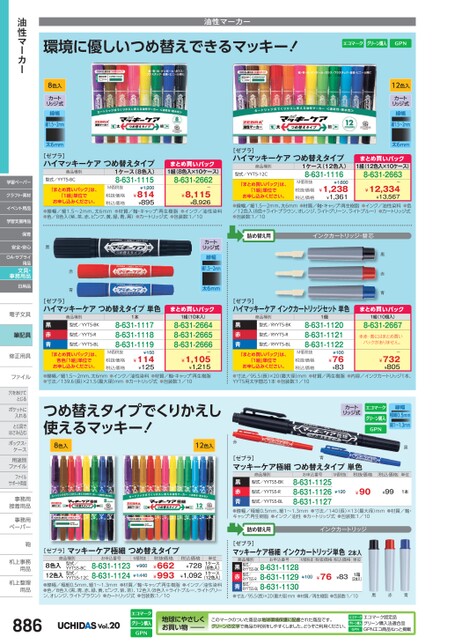 環境に優しいつめ替えできるマッキー!油性マーカー12色入カートリッジ式線幅細1.5〜2mm太6mmまとめ買いパック1組(12色入×10ケース)8-631-2663ー¥12,334¥13,567[ゼブラ]ハイマッキーケアつめ替えタイプ商品種別型式/YYT5-12C「まとめ買いパック」は、「1組」単位でお申し込みください。1ケース(12色入)8-631-1116M価税抜税抜価格税込価格¥1,800¥1,238¥1,361●線幅/細1.5〜2mm、太6mm●材質/軸・キャップ:再生樹脂●インク/油性染料●色/12色入(8色+ライトブラウン、オレンジ、ライトグリーン、ライトブルー)●カートリッジ式●包装数:1/10詰め替え用インクカートリッジ・替芯黒赤青[ゼブラ]ハイマッキーケアインクカートリッジセット単色商品種別型式/RYYT5-BK型式/RYYT5-R型式/RYYT5-BL黒赤青「まとめ買いパック」は、「1組」単位でお申し込みください。1個8-631-11208-631-11218-631-1122M価税抜税抜価格税込価格¥100¥76¥83まとめ買いパック1組(10個入)8-631-2667※赤・青にはまとめ買いパックがありません。ー¥732¥805ファイルファイル●線幅/細1.5〜2mm、太6mm●インク/油性染料●材質/軸・キャップ:再生樹脂●寸法/139.6(長)×21.5(最大径)mm●カートリッジ式●包装数:1/10●寸法/95.5(長)×20(最大径)mm●材質/再生樹脂●内容/インクカートリッジ1本、YYT5用太字替芯1本●包装数:1/10穴をあけて穴をあけてとじるポケットにポケットに入れるとじ具でとじ具ではさみ込むボックス・ボックス・ケース用途別用途別ファイルファイルサポート用品事務用事務接着用品接着用事務用事務用ペーパーペーパー鞄鞄机上事務机上事用品用品机上整理机上整用品用品つめ替えタイプでくりかえし使えるマッキー!8色入12色入赤カートリッジ式線幅極細0.5mm細1〜1.3mm黒[ゼブラ]マッキーケア極細つめ替えタイプ単色青商品種別お申込番号M価税抜税抜価格税込価格単位型式/YYTS5-R型式/YYTS5-BK黒赤青●線幅/極細0.5mm、細1〜1.3mm●寸法/140(長)×13(最大径)mm●材質/軸・キャップ:再生樹脂●インク/油性●カートリッジ式●包装数:1/108-631-11258-631-11268-631-1127型式/YYTS5-BL¥90¥99¥1201本詰め替え用インクカートリッジ[ゼブラ]マッキーケア極細インクカートリッジ単色2本入商品種別お申込番号M価税抜税抜価格税込価格単位RYYTS5-BK8-631-11288-631-1129RYYTS5-BL8-631-1130黒型式/赤型式/青型式/●寸法/95.5(長)×20最大径)mm●材質/再生樹脂●包装数:1/10¥76¥83RYYTS5-R¥1001箱(2本入)黒赤青[ゼブラ]マッキーケア極細つめ替えタイプM価税抜¥960商品種別お申込番号税抜価格型式/YYTS5-8C型式/YYTS5-12C8-631-11238-631-11248色入12色入(12色入)●線幅/極細0.5mm、細1〜1.3mm●材質/軸・キャップ:再生樹脂●インク/油性染料●色/8色入(黒、青、赤、緑、黄、ピンク、紫、茶)、12色入(8色入+ライトブルー、ライトグリーン、オレンジ、ライトブラウン)●カートリッジ式●包装数:1/10¥662¥993(8色入)1ケース1ケース¥1,440税込価格¥728¥1,092単位886Vol.20地球にやさしくお買い物このマークのついた商品は地球環境保護に配慮された商品です。グリーンの文字で商品の判別をしやすくしました。どうぞご利用ください。エコマーク認定品グリーン購入法適合品GPNエコ商品ねっと掲載8色入カートリッジ式線幅細1.5〜2mm太6mm[ゼブラ]ハイマッキーケアつめ替えタイプ1ケース(8色入)8-631-1115型式/YYT5-8C商品種別「まとめ買いパック」は、「1組」単位でお申し込みください。M価税抜税抜価格税込価格¥1,200¥814¥895まとめ買いパック1組(8色入×10ケース)8-631-2662ー¥8,115¥8,926●線幅/細1.5〜2mm、太6mm●材質/軸・キャップ:再生樹脂●インク/油性染料●色/8色入(紫、茶、赤、ピンク、黄、緑、青、黒)●カートリッジ式●包装数:1/10赤青カートリッジ式線幅細1.5〜2mm太6mm[ゼブラ]ハイマッキーケアつめ替えタイプ単色商品種別型式/YYT5-BK型式/YYT5-R型式/YYT5-BL黒赤青「まとめ買いパック」は、各色「1組」単位でお申し込みください。1本8-631-11178-631-11188-631-1119M価税抜税抜価格税込価格¥150¥114¥125まとめ買いパック1組(10本入)8-631-26648-631-26658-631-2666ー¥1,105¥1,215油性マーカー学習ペーパークラフト・素材イベント用品学習支援用品保育OA・サプライ用品文具・事務用品日用品電子文具電子文筆記具修正用具修正用安全・安心黒