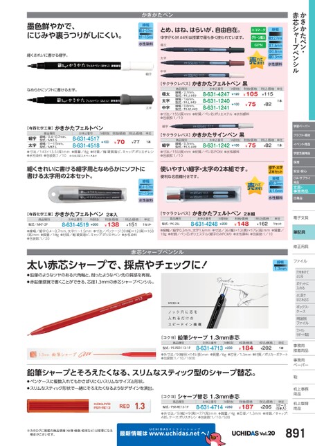 かきかたペン・赤芯シャープペンシル学習ペーパークラフト・素材イベント用品学習支援用品保育安全・安心OA・サプライ用品文具・事務用品日用品電子文具子かきかたペン墨色鮮やかで、にじみや裏うつりがしにくい。細くきれいに書ける細字。なめらかにソフトに書ける太字。線幅細0.4〜0.7mm太1〜1.5mm水性染料細字太字[寺西化学工業]かきかたフェルトペン商品種別お申込番号M価税抜税抜価格税込価格単位線幅/0.4〜0.7mm、型式/MKF-S線幅/1〜1.5mm、型式/MKF-L細字太字●寸法/143×13.5(径)mm●質量/8g●材質/軸:硬質塩ビ、キャップ:ポリエチレン●水性染料●包装数:1/10※なまえ記入スペースあり8-631-45178-631-4518¥70¥77¥1001本とめ、はね、はらいが、自由自在。中字(FK-M#49)は授業で最も多く使われています。極太太字中字[サクラクレパス]かきかたフェルトペン黒税抜価格お申込番号M価税抜¥120商品種別線幅/2.7mm、型式/FK-J#49線幅/1.6mm、型式/FK-L#49線幅/0.8mm、型式/FK-M#49極太太字中字●寸法/155長)mm●材質/ペン芯:ポリエステル●水性顔料●包装数:1/108-631-42478-631-12408-631-1241¥105¥75¥100細字[サクラクレパス]かきかたサインペン黒商品種別線幅/0.3mm、型式/FK-S#49細字●寸法/155長)mm●材質/ペン芯:POM●水性顔料●包装数:1/108-631-1242M価税抜¥100お申込番号税抜価格¥75細くきれいに書ける細字用となめらかにソフトに書ける太字用の2本セット。線幅細0.4〜0.7mm太1〜1.5mm水性染料使いやすい細字・太字の2本組です。便利な名前欄付きです。線幅極太2.7mm太1.6mm中0.8mm細0.3mm水性顔料税込価格¥115¥82単位1本税込価格¥82単位1本細字・太字2本セット線幅細0.3mm太1.6mm水性顔料[寺西化学工業]かきかたフェルトペン2本入商品種別型式/MKF-2Pお申込番号8-631-4519M価税抜¥200税抜価格¥138税込価格¥151単位1セット●線幅/細字:0.4〜0.7mm、太字:1〜1.5mm●寸法/パッケージ:39(幅)×12奥)×168(高)mm●質量/18g●材質/軸:硬質塩ビ、キャップ:ポリエチレン●水性染料●包装数:1/20[サクラクレパス]かきかたフェルトペン2本組商品種別型式/FK-2SLお申込番号8-631-4248M価税抜¥200税抜価格¥148税込価格¥162単位1セット●線幅/細字0.3mm、太字1.6mm●寸法/36(幅)×13(奥)×175(高)mm●質量/18g●材質/ペン芯:ポリエステル(細字のみPOM)●水性顔料●包装数:1/10筆記具赤芯シャープペンシル太い赤芯シャープで、採点やチェックに!●鉛筆のようなツヤのある六角軸と、削ったようなペン先の質感を再現。●赤鉛筆感覚で書くことができる、芯径1.3mmの赤芯シャープペンシル。[コクヨ]鉛筆シャープ1.3mm赤芯商品種別型式/PS-PER113-1Pお申込番号8-631-4713M価税抜¥230税抜価格¥184線幅1.3mm税込価格¥202単位1本●外寸法/9(軸径)×145(長)mm●質量/6g●芯径/1.3mm●材質/ポリカーボネート●包装数:1/10/1000鉛筆シャープとそろえたくなる、スリムなスティック型のシャープ替芯。●ペンケースに複数入れてもかさばりにくいスリムなサイズと形状。●スリムなスティック形状で一緒にそろえたくなるようなデザインを演出。[コクヨ]シャープ替芯1.3mm赤芯商品種別お申込番号8-631-4714M価税抜¥250税抜価格¥187型式/PSR-RE13-1P(5本入)●外寸法/9(幅)×9(奥)×77(高)mm●質量/4g●芯径/1.3mm●材質/キャップ:ABS、ケース:ポリスチレン●包装数:1/10/500税込価格¥205単位1ケース修正用具正ファイルファイル穴をあけて穴をあけてとじるポケットにポケットに入れるとじ具でとじ具ではさみ込むボックス・ボックス・ケースス用途別用途別ファイルファイルサポート用品事務用務接着用品着事務用務ペーパーペーパー鞄机上事務上用品品机上整理上用品用品※カタログに掲載の商品情報(仕様・価格・税率など)は変更になる場合がございます。最新情報はUCHIDASww.uchidas.netwへ!Vol.20891