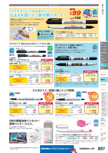 ネームペン線幅極細0.5mm細1.0mm油性インク1本税抜¥99税込¥108ネームペンウチダオリジナルなまえペン!ウチリナま!なまえを書いて、新学期スタート!なまえを書いて、新学期スタート!線幅0.3mmアルコール染料[ウチダ]なまえペン1本商品種別型式/UE-NWお申込番号8-631-4015M価税抜オープン税抜価格¥99税込価格¥108単位1本●線幅/極細:0.5mm、細:1.0mm●寸法/143長)×約10(最大径)mm●インク/油性●包装数:1/125布・プラスチック・金属にも書けて、にじみにくい。洗濯に強い。●体操着やお弁当箱には、0.8mmの細字ペンで、大きく。●鉛筆や筆箱などの小物には、0.4mmの極細ペンで。線幅極細0.4mm細0.8mm油性インク[トンボ鉛筆]なまえ専科ツイン商品種別型式/MCA-1111本8-631-2737「まとめ買いパック」は、「1組」単位でお申し込みください。M価税抜税抜価格税込価格¥150¥110¥121まとめ買いパック1組(5本入)8-631-2738ー¥525¥577●線幅/極細0.4mm、細0.8mm●寸法/142(長)×15(最大径)mm●質量/8g●材質/軸:ポリプロピレン、ペン芯:アクリル(細)・ポリアセタール(極細)●インク/油性●包装数:1/51本あたり106税込¥116.6税抜¥お得油性染料まとめ買いパック1組(10本入)8-631-3165ー¥1,060¥1,166線幅極細0.5mm細1.0〜1.3mm特に衣類の名前書きに適しています。[ゼブラ]おなまえマッキー両用商品種別型式/YYTS7-BK「まとめ買いパック」は、「1組」単位でお申し込みください。1本8-631-1221M価税抜税抜価格税込価格¥150¥113¥124●極細0.5mm、細字1.0mmのツインタイプ、書く場所に応じて使い分けができます。●本体に自分のなまえを記入するスペースがあります。●洗濯しても落ちにくく、いろいろな素材に書けます。握りやすくスムーズに書ける!なまえペンの特長本体に名前を書けるので、持ち物管理がしやすく便利です。クラフトテープ、布などにもにじみにくく、クッキリした黒!!ビニール・プラスチック・布、さらにクラフトテープにもはじかず書ける!●細字+極細線幅極細0.4mm細0.9mm油性インク[三菱鉛筆]名前ペンパワフルネーム●細字商品種別●細字+極細型式/PNA155T1P.24「まとめ買いパック」は、「1組」単位でお申し込みください。1本8-631-2315M価税抜税抜価格税込価格¥150¥120¥132線幅0.9mm油性インクまとめ買いパック1組(10本入)8-631-3216ー¥1,173¥1,290●線幅/極細0.4mm、細0.9mm●寸法/145.6(長)×12.8(最大径)mm●質量/11.5g●インク/油性●包装数:1/10●細字商品種別型式/PNA1251P.24「まとめ買いパック」は、「1組」単位でお申し込みください。1本8-631-2316M価税抜税抜価格税込価格¥120¥96¥1051組(10本入)8-631-3217ー¥939¥1,032●線幅/0.9mm●寸法/139.1(長)×10.7(最大径)mm●質量/8.1g●インク/油性●包装数:1/10921本あたり税込¥101.2税抜¥お得まとめ買いパック1組(10本入)8-631-2314ー¥920¥1,012線幅油性染料細1.2〜1.5mm[ゼブラ]おなまえマッキー細字商品種別型式/YYSS7-BK「まとめ買いパック」は、「1組」単位でお申し込みください。M価税抜税抜価格税込価格1本8-631-2313¥120¥94¥1036色の極細油性ペンセット!専用ペンケース入り。スリムな油性ペンの6色セット。専用ペンケースは、ペン立てにもなります!にじみにくく、洗濯に強いインク採用。学習ペーパークラフト・素材イベント用品学習支援用品保育安全・安心OA・サプライ用品文具・事務用品日用品電子文具子筆記具修正用具正ファイルファイル穴をあけて穴をあけてとじるポケットにポケットに入れるとじ具でとじ具ではさみ込むボックス・ボックス・ケースス用途別用途別ファイルファイルサポート用品事務用務接着用品着事務用務ペーパーペーパー鞄机上事務上用品品机上整理上用品用品●線幅/1.2〜1.5mm●寸法/140(長)×11(最大径)mm●質量/8g●インク/油性染料●包装数:1/10●線幅/極細0.5mm、細1.0〜1.3mm●寸法/140.1長)×11.7(最大径)mm●質量/9g●インク/油性染料●包装数:1/10専用ケース付き![マービー]アルバムペン6色セットハードケース商品種別型式/106Aお申込番号8-630-5634M価税抜¥900税抜価格¥760税込価格¥836単位1セット(6色入)●線幅/極細:0.3mm●寸法/67(幅)×14(奥)×150(高)mm●材質/ポリプロピレン●インク/アルコール染料(中綿タイプ)●インク色/ブラック・レッド・ライトブルー・グリーン・オレンジ・ピンク●専用ペンケース付属●包装数:1※カタログに掲載の商品情報(仕様・価格・税率など)は変更になる場合がございます。最新情報はUCHIDASww.uchidas.netwへ!Vol.20897