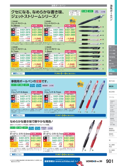 ●●●●●●●●●●●学習ペーパークラフト・素材イベント用品学習支援用品保育安全・安心OA・サプライ用品文具・事務用品日用品電子文具子筆記具修正用具正ファイルファイル穴をあけて穴をあけてとじるポケットにポケットに入れるとじ具でとじ具ではさみ込むボックス・ボックス・ケースス用途別用途別ファイルファイルサポート用品事務用務接着用品着事務用務ペーパーペーパー鞄机上事務上用品品机上整理上用品用品油性ボールペン油性インクノック式●油性ボールペンクセになる、なめらかな書き味、ジェットストリームシリーズ!ボール径0.380.70.51.0まとめ買いパック1組(10本入)8-631-38878-631-38888-631-3889ー¥1,046¥1,1501本8-631-38838-631-38848-631-3885M価税抜¥150税抜価格¥114¥125税込価格商品種別黒型式/赤型式/青型式/SXN15005SXN15005SXN15005「まとめ買いパック」は、各色「1組」単位でお申し込みください。●●●[三菱鉛筆]ジェットストリーム0.5mmまとめ買いパック1組(10本入)8-631-39948-631-39958-631-3996ー¥1,046¥1,1501本8-631-39758-631-39768-631-3977M価税抜¥150税抜価格¥114¥125税込価格商品種別黒型式/赤型式/青型式/SXN15038SXN15038SXN15038「まとめ買いパック」は、各色「1組」単位でお申し込みください。●●●[三菱鉛筆]ジェットストリーム0.38mm●寸法/140(長)×12最大径)mm●質量/9.9g●材質/樹脂●替芯/BRS-6A-K●インク/油性染料●ノック式●包装数:1/100●寸法/140長)×12(最大径)mm●質量/10g●材質/ポリカーボネート●替芯/BR-6A-K●インク/油性染料●ノック式●包装数:1/10●●●替芯はこちら!P.907-をご覧ください。なめらかな書き味で鮮やかな発色!油性インクと水性インクを混合。業界初のエマルジョンインク搭載。●寸法/139.6(長)×11.3(径)mm●質量/9.3g●材質/軸:再生ポリカーボネート、ラバーグリップ付、クリップ:ABS樹脂、口プラ:再生PBT●替芯/0.7mm:SXR7、1.0mm:SXR10●インク/油性●ノック式●包装数:1/10替芯はこちら!P.906-⓲〜をご覧ください。事務用ボールペンの定番です。ボール径0.5mmボール径0.7mm油性染料ノック式まとめ買いパック1組(10本入)8-631-41888-631-41898-631-4190ー¥642¥706[ゼブラ]ジムノック0.7mm商品種別黒型式/赤型式/青型式/KRB-100KRB-100●KRB-100「まとめ買いパック」は、各色「1組」単位でお申し込みください。1本8-631-23568-631-23588-631-2357M価税抜税抜価格税込価格¥100¥66¥72まとめ買いパック1組(10本入)8-631-23598-631-23618-631-2360ー¥642¥7061本8-631-41728-631-41738-631-4174M価税抜税抜価格税込価格¥100¥66¥72商品種別黒型式/赤型式/青型式/KRBS-100KRBS-100KRBS-100「まとめ買いパック」は、各色「1組」単位でお申し込みください。●●[ゼブラ]ジムノック0.5mm●寸法/139.6(長)×11.3(径)mm●質量/9.3g●材質/軸:再生ポリカーボネート、ラバーグリップ付、クリップ:ABS樹脂、口プラ:再生PBT●替芯/0.38mm:SXR38、0.5mm:SXR5●インク/油性●ノック式●包装数:1/10まとめ買いパック1組(10本入)8-631-41178-631-41188-631-4119ー¥1,046¥1,1501本8-631-41278-631-41288-631-4129M価税抜¥150税抜価格¥114¥125税込価格商品種別黒型式/赤型式/青型式/SXN15010SXN15010SXN15010「まとめ買いパック」は、各色「1組」単位でお申し込みください。●●●[三菱鉛筆]ジェットストリーム1.0mmまとめ買いパック1組(10本入)8-631-23698-631-23688-631-2370ー¥1,046¥1,1501本8-631-23638-631-23628-631-2364M価税抜¥150税抜価格¥114¥125税込価格商品種別黒型式/赤型式/青型式/SXN15007SXN15007SXN15007「まとめ買いパック」は、各色「1組」単位でお申し込みください。●●●[三菱鉛筆]ジェットストリーム0.7mm●寸法/140(長)mm●質量/10g●材質/再生ポリカーボネート●替芯/0.5mm:REQ5●エマルジョンインク●ノック式●包装数:1/10●寸法/140(長)mm●質量/10g●材質/再生ポリカーボネート●替芯/0.7mm:REQ7●エマルジョンインク●ノック式●包装数:1/10●●替芯はこちら!P.907-をご覧ください。ボール径0.5mmボール径0.7mmエマルジョンノック式インク[ゼブラ]ボールペンスラリ0.7mm商品種別型式/BN11型式/BN11黒赤「まとめ買いパック」は、各色「1組」単位でお申し込みください。1本8-631-33728-631-3371M価税抜税抜価格税込価格¥100¥73¥80まとめ買いパック1組(10本入)8-631-34638-631-3464ー¥703¥773まとめ買いパック1組(10本入)8-631-34608-631-3461ー¥703¥773[ゼブラ]ボールペンスラリ0.5mm1本8-631-33758-631-3374M価税抜税抜価格税込価格¥100¥73¥80商品種別黒赤型式/BNS11型式/BNS11「まとめ買いパック」は、●●各色「1組」単位でお申し込みください。※カタログに掲載の商品情報(仕様・価格・税率など)は変更になる場合がございます。最新情報はUCHIDASww.uchidas.netwへ!Vol.20901
