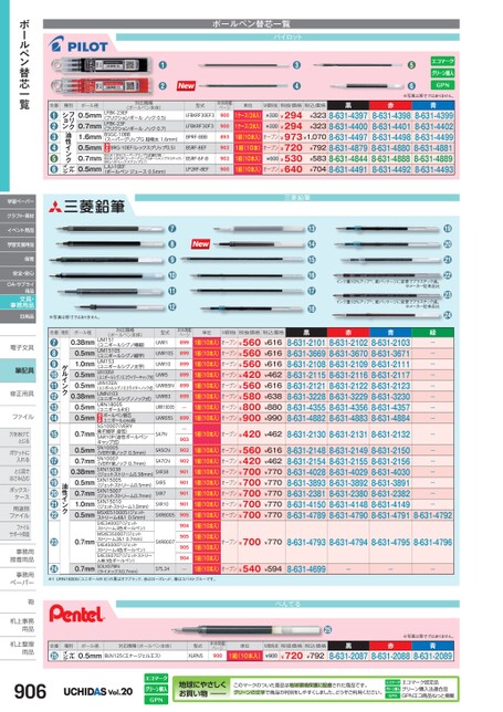 ●●※写真は原寸ではありません。赤8-631-43988-631-44018-631-44988-631-48808-631-48888-631-4492青8-631-43998-631-44028-631-44998-631-48818-631-48898-631-4493ボールペン替芯一覧パイロット●●●●型式LFBKRF30EF3LFBKRF30F3BPRF-8BBBSRF-8EFBSRF-6F-BLP2RF-8EF本体掲載ページ900900893902902900黒単位M価税抜税抜価格税込価格¥330¥294¥330¥294¥3238-631-43971ケース(3本入)¥3238-631-44001ケース(3本入)1組(10本入)オープン¥973¥1,0708-631-44971組(10本)オープン¥7208-631-4879¥600¥5308-631-48441組(10本入)1組(10本入)オープン¥6408-631-4491¥792¥583¥704(フリクションボールノック0.7)(フリクションボールノック0.5)0.5mmLFBK-23EF0.7mmLFBK-23F1.6mmBSGC-10BB0.5mm0.7mmBSGK-10FKスーパーグリップG抗菌仕様)/0.5mmLJU-10EF(ボールペンジュース0.5mm)BRG-10EF(レックスグリップ0.5)(スーパーグリップG超極太1.6mm)BSGK-10FOPスーパーグリップGオーシャンプラスチック)/BRG-10Fレックスグリップ0.7)フリクション油性インクゲルインク種別ボール径対応機種(ボールペン本体)合番❶❷❸❹❺❻ボールペン替芯一覧学習ペーパークラフト・素材イベント用品学習支援用品保育安全・安心OA・サプライ用品文具・事務用品日用品電子文具電子文筆記具修正用具修正用ファイルファイル穴をあけて穴をあけてとじるポケットにポケットに入れるとじ具でとじ具ではさみ込むボックス・ボックス・ケース用途別用途別ファイルファイルサポート用品事務用事務接着用品接着用事務用事務用ペーパーペーパー鞄鞄机上事務机上事用品用品机上整理机上整用品用品●●●●●●インク量10%アップ※、紙パッケージに変更でプラスチック減。※メーカー従来品比インク量10%アップ※、紙パッケージに変更でプラスチック減。※メーカー従来品比●⓮●●●●三菱鉛筆黒8-631-21018-631-36698-631-21088-631-21158-631-21218-631-32288-631-43558-631-4882赤8-631-21028-631-36708-631-21098-631-21168-631-21228-631-32298-631-43568-631-4883青8-631-21038-631-36718-631-21118-631-21178-631-21238-631-32308-631-43578-631-4884¥4628-631-21308-631-21318-631-2132¥616¥462¥770¥770¥770¥770¥7708-631-21488-631-21548-631-40288-631-38938-631-23818-631-41508-631-47898-631-21498-631-21558-631-40298-631-38928-631-23808-631-41488-631-47908-631-21508-631-21568-631-40308-631-38918-631-23828-631-41498-631-4791緑ーーーーーーーーーーーーーーー8-631-4792¥7708-631-47938-631-47948-631-47958-631-4796¥5948-631-4699ーーーぺんてる●※写真は原寸ではありません。本体掲載ページ899899899899899899ー899ー903902902901901901901905904905905904ーM価税抜税抜価格税込価格¥616¥616¥616¥462¥616¥638¥880¥990単位1組(10本入)オープン¥5601組(10本入)オープン¥5601組(10本入)オープン¥5601組(10本入)オープン¥4201組(10本入)オープン¥5601組(10本入)オープン¥5801組(10本入)オープン¥8001組(10本入)オープン¥9001組(10本入)オープン¥4201組(10本入)オープン¥5601組(10本入)オープン¥4201組(10本入)オープン¥7001組(10本入)オープン¥7001組(10本入)オープン¥7001組(10本入)オープン¥7001組(10本入)オープン¥7001組(10本入)1組(10本入)1組(10本入)1組(10本入)1組(10本入)オープン¥540オープン¥700●●●●●●型式UMR1UMR105※写真は原寸ではありません。種別ボール径対応機種(ボールペン本体)0.38mmUM151(ユニボールシグノ極細)(ユニボールシグノ細字)0.5mmUM151051.0mmUM1530.5mmUM100EW0.5mmUMN105EW0.38mmUMN103(ユニボールシグノ太字)(ユニボールシグノエコライターキャップ式)UMR5(ユニボールシグノエコライターノック式)UMR85N(ユニボールシグノノック式)UMR83UMR10URR10005UMR05SSA7NSA5CN0.5mmURN180050.5mm(ユニボールR:E)ボールペン替芯ユニボールone用0.7mmSG10007(VERY楽ボ細字油性)SAR10P油性ボールペンキャップ式)SA7CN(VERY楽ノック0.5mm)0.5mmSN100050.7mmSN100070.38mmSXN150380.5mmSXN150050.7mmSXN150071.0mmSXN150100.5mmMSXE510005(ジェット(VERY楽ノック0.7mm)(ジェットストリーム0.38mm)SXR38(ジェットストリーム0.5mm)SXR5(ジェットストリーム0.7mm)SXR7SXR10(ジェットストリーム1.0mm)0.7mmストリーム4&10.5mm)SXE340007(ジェットストリーム3色ボールペン)MSXE350007(ジェットストリーム2&10.7mm)SXE450007(ジェットストリーム4色ボールペン)SXE350707(ジェットストリーム新3色ボールペン)SXR8005SXR8007S7S.240.7mmSDLX07BN(ライメックス0.7mm)ゲルインク油性インク合番❼❽❾❿⓫⓬⓭⓮⓯⓰⓱⓲⓳⓴※1URN18005(ユニボールR:E)の黒はオフブラック、赤はローズレッド、青はコバルトブルーです。型式XLRN5本体掲載ページ900ボール径対応機種(ボールペン本体)0.5mmBLN125(エナージェルエス)種別ゲルインク合番単位1組(10本入)¥900M価税抜税抜価格税込価格¥792¥720黒8-631-2087赤8-631-2088青8-631-2089906Vol.20地球にやさしくお買い物このマークのついた商品は地球環境保護に配慮された商品です。グリーンの文字で商品の判別をしやすくしました。どうぞご利用ください。エコマーク認定品グリーン購入法適合品GPNエコ商品ねっと掲載
