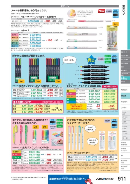 学習ペーパークラフト・素材イベント用品学習支援用品保育安全・安心OA・サプライ用品文具・事務用品日用品電子文具子筆記具修正用具正ファイルファイル穴をあけて穴をあけてとじるポケットにポケットに入れるとじ具でとじ具ではさみ込むボックス・ボックス・ケースス用途別用途別ファイルファイルサポート用品事務用務接着用品着事務用務ペーパーペーパー鞄机上事務上用品品机上整理上用品用品蛍光ペン水性顔料線幅細0.5mm太3.3mmピンク5色入オレンジイエローグリーンブルー水性顔料線幅細0.8〜1.1mm太4.0mmノートも教科書も、もう汚させない。速乾インキでノートや教科書が汚れにくい。[パイロット]商品種別型式/SKIW-1-5C1キレーナベーシックカラー5色セットお申込番号8-630-5664M価税抜¥600税抜価格¥536税込価格¥589蛍光ペンしなるペン先「ナイロンチップ」とペン先両端のガイド「キチントガイド」が、きれいな線を引くことをサポートします。単位1セット(5色入)●線幅/細:0.5mm、太:3.3mm●寸法/85(幅)×12(奥)×205(高)mm●質量/47g●材質/軸・キャップ:樹脂●水性顔料●包装数:1/10〈セット内容〉ピンク、オレンジ、イエロー、グリーン、ブルー[パイロット]キレーナ商品種別お申込番号M価税抜税抜価格税込価格単位型式/SKIW-1-P型式/SKIW-1-Y型式/SKIW-1-Oピンクオレンジイエローグリーンブルー●線幅/細:0.5mm、太:3.3mm●寸法/10.85(径)×136.6(長)mm●質量/8.7g●材質/軸・キャップ:樹脂●水性顔料●包装数:1/108-630-56658-630-56668-630-56678-630-56688-630-5669¥108型式/SKIW-1-G型式/SKIW-1-L¥118¥1201本鮮やかな蛍光色が長持ちします。3色入5色入7色入[ゼブラ]蛍光オプテックスケア太細両用1ケース商品種別お申込番号3色入(ピンク、黄、緑)、型式/WKCR1-3C5色入(ピンク、オレンジ、黄、緑、青)、型式/WKCR1-5C7色入(赤、オレンジ、ピンク、黄、緑、青、紫)、型式/WKCR1-7C3色5色7色●線幅/細0.8〜1.1mm、太4mm●水性顔料●包装数:1/108-631-13548-631-13558-631-1356¥500¥700M価税抜¥300税抜価格¥210¥345¥484税込価格¥231¥379¥532単位1ケース(3色入)1ケース(5色入)1ケース(7色入)商品種別お申込番号まとめ買いパック3色5色7色8-631-29268-631-29278-631-2928※1組単位申込。税抜価格¥2,000¥3,370¥4,730税込価格¥2,200¥3,707¥5,203単位1組(10ケース入)引きすぎ、引き間違いも簡単に消去!こすると消える蛍光ペン。3色セット6色セット線幅3.3mmフリクションインキイエローピンクグリーン3色セット6色セット[パイロット]蛍光ペンフリクションライト商品種別お申込番号M価税抜税抜価格税込価格単位¥120¥101型式/SFL-10SL-Y型式/SFL-10SL-P型式/SFL-10SL-G型式/SFL-30SL-3C型式/SFL-60SL-6C8-631-43878-631-43888-631-43898-631-43908-630-5633イエローピンクグリーン¥3321ケース3色セット(3本入)¥6651ケース6色セット(6本入)●線幅/3.3mm●寸法/12.6(最大径)×139(長)mm(1本)●材質/軸・キャップ:リサイクル樹脂●質量/9.8g(1本)●インキ/フリクションインキ●包装数:1/10〈セット内容〉3色セット:イエロー・ピンク・グリーン、6色セット:イエロー・ピンク・グリーン・オレンジ・ブルー・バイオレット※フリクションシリーズの注意についてはP.900を参照ください。¥302¥605¥111¥360¥7201本耐水・耐光。黄ピンクオレンジ緑青[ゼブラ]蛍光オプテックスケア太細両用単色黄ピンクオレンジ緑青商品種別型式/WKCR1-Y型式/WKCR1-P型式/WKCR1-OR型式/WKCR1-G型式/WKCR1-BL「まとめ買いパック」は、各色「1組」単位でお申し込みください。1本8-631-13578-631-13588-631-13598-631-13608-631-1361M価税抜税抜価格税込価格¥100¥68¥74まとめ買いパック1組(10本入)8-631-21698-631-21708-631-21718-631-21728-631-2173ー¥650¥715●線幅/細0.8〜1.1mm、太4mm●寸法/133.9(長)mm●材質/軸・キャップ・先端カバー:再生樹脂●水性顔料●包装数:1/10水性顔料線幅細1〜1.4mm太4.0mmおだやかで優しい色合いのラインマーカーです!1本で太細両用。ほんのり蛍光色。[ゼブラ]マイルドライナー商品種別お申込番号3色セット型式/WKT7-3C-N8-631-47215色セット型式/WKT7-5C-N8-631-47223色セット5色セットM価税抜¥300¥500税抜価格¥240¥400税込価格¥264¥440単位1個●線幅/太:4mm、細:1〜1.4mm●寸法/3色セット:64(幅)×16奥)×210(高)mm、5色セット:94(幅)×16(奥)×210(高)mm●質量/3色セット:31g、5色セット:53g●材質/軸・キャップ:樹脂●水性顔料●包装数:1/10〈セット内容〉3色セット:マイルドピンク・マイルドイエロー・マイルドブルーグリーン、5色セット:マイルドピンク・マイルドオレンジ・マイルドイエロー・マイルドブルーグリーン・マイルドブルー※筆記具以外には使用しないでください。※カタログに掲載の商品情報(仕様・価格・税率など)は変更になる場合がございます。最新情報はUCHIDASww.uchidas.netwへ!Vol.20911