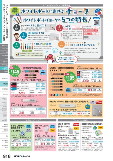 ホワイトボードチョーク関連用品ホワイトボードに書けるMovie筆記距離の比較ホワイトボードチョーク太字中字約1.5倍1本あたり145円(税抜)約3倍約105円(税抜)1本あたり一般的なホワイトボードマーカー1本あたり約105〜145円(税抜)とっても経済的市販のホワイトボードマーカーの約1.5倍(中字)〜3倍(太字)※の筆記距離で、最後まで使い切ることができます。※当社独自調査において、筆記距離に対するコスト比較に基づいています。・ドリルなど生徒用に作成したラミネーターフィルムに書き消しできて、マーカーのように黒ずみません。・また、ビーカーなどガラス器具にも書き消しができて、ラベルを貼る手間が省けます。ラミネーターフィルムやガラス器具にも書き消しできます。長5特材質は米ぬかから取れるワックスを使用していて安全で環境にも配慮しています!長2特チョークのような書きごこちチョークのように滑らかな書きごこちです。筆圧で線幅を自在に調整できます!長1特消しカスがでない市販のマイクロファイバークロスか固く絞った雑巾※できれいに消すことができます。消しカスが出ないので衛生的です。※ホワイトボードイレーザーでは消去できませんのでご注意ください。長3特うれしい6色展開ホワイトボードマーカーでご要望が多かったカラーバリエーションをご用意しました!CUDカラーCUD(カラーユニバーサルデザイン)に認定されています。※黒青緑橙の4色)長4特[ウチダ]ホワイトボードチョーク紙巻タイプ中字10本入商品種別型式/UWBCH-NP-BK-10型式/UWBCH-NP-R-10型式/UWBCH-NP-BL-10黒赤青お申込番号8-631-48578-631-48588-631-4859M価税抜オープン税抜価格¥1,050税込価格¥1,155単位1組(10本入)1本あたり105税込¥115.5税抜¥お得75mm6色セットは特別支援教室にオススメです![ウチダ]ホワイトボードチョーク紙巻タイプ中字6色セットお申込番号M価税抜税抜価格税込価格8-631-4866オープン¥800¥880単位1組(6色各1本入)商品種別型式/UWBCH-NP-6C線幅約2〜6mm赤黒青緑黄橙●寸法/10.5径)×75(長)mm●質量/約7.2g1本あたり)●材質/ライスワックス・顔料・耐油紙●日本製●包装数:1/10チャック式ホルダーで、最後まで使い切ることが出来ます。※チョークは付属しておりません。チョークホルダー[ウチダ]チョークホルダー(中字用)商品種別型式/U-CHKHD-01白●寸法/92幅)×7奥)×21(厚)mm●材質/プラスチック●マグネット付●包装数:18-630-5698オープン¥483税込価格¥531単位1本お申込番号M価税抜税抜価格裏面マグネット付使用例10.5mm赤黒青緑黄橙大きな文字の提示に!90mm線幅約2〜10mm14.5mm赤黒青1本あたり145税込¥159.5税抜¥お得[ウチダ]ホワイトボードチョーク紙巻タイプ太字10本入黒赤青商品種別型式/UWBCH-BP-BK-10型式/UWBCH-BP-R-10型式/UWBCH-BP-BL-10お申込番号8-631-48638-631-48648-631-4865M価税抜オープン税抜価格¥1,450税込価格¥1,595単位1組(10本入)●寸法/14.5(径)×90(長)mm●質量/約19.8g●材質/ライスワックス・顔料・耐油紙●日本製●包装数:1/6×314mm[祥碩堂]チョークホルダー(太字用)3本パック111mm商品種別型式/S15417M価税抜オープン税抜価格¥400お申込番号8-630-5635税込価格¥440単位1パック(3本入)●寸法/14(径)×111(長)mm●包装数:1/10マグネットクリップファイバークロスまとめて貼れる。書類の仮置きなどに便利。耐荷重800g綴じ数約90枚キャビネット、ロッカーに最適です。保護シート付き。耐荷重約1kgf2個入ホワイトボードの文字が簡単に消せるマルチクロス!洗って、再利用できます。10枚入[クラウン]ニューマグネットクリップ商品種別お申込番号37mm耐荷重/800g、クリップ幅/27mm、綴じ数/約90枚、型式/CR-MGM20-SL8-612-0008M価税抜¥300税抜価格¥210税込価格¥231単位1個●材質/本体:スチール・フェライト磁石●包装数:1/12[オート]マグネットフック丸2個入商品種別お申込番号耐荷重/約1kgf型式/OH-14M8-636-3012単位1パックM価税抜¥460税抜価格¥370税込価格¥407(2個入)●寸法/41(幅)×29(奥)×75(高)mm●材質/ABS樹脂、ステンレス、フェライト磁石●色/白●包装数:1/10[林]掛けひも付きマルチマイクロファイバークロス10枚組商品種別型式/ZM477829お申込番号8-630-5693極細繊維が洗剤なしで汚れを落とします。●吸収性と速乾性に優れています。●5色パックなので用途別に使い分けできます。5枚入[トレードワン]マイクロファイバークロス5Pセット商品種別型式/30755お申込番号8-630-5616税込価格税抜価格¥2,200¥2,420M価税抜オープン●寸法(1枚あたり)/200縦)×300横)mm●質量(1枚あたり)/約25g●材質/ポリエステル90%、ナイロン10%●包装数:1単位1セット(10枚入)税抜価格¥300税込価格¥330M価税抜オープン(5枚入)●寸法(1枚あたり)/270縦)×270横)×2(厚)mm●質量(1枚あたり)/16g●材質/ポリエステル85%、ナイロン15%●包装数:1/144単位1袋ホワイトボードチョーク関連用品・マグネットクリップ・ファイバークロス学習ペーパークラフト・素材イベント用品学習支援用品保育安全・安心OA・サプライ用品文具・事務用品日用品電子文具電子文筆記具修正用具修正用ファイルファイル穴をあけて穴をあけてとじるポケットにポケットに入れるとじ具でと