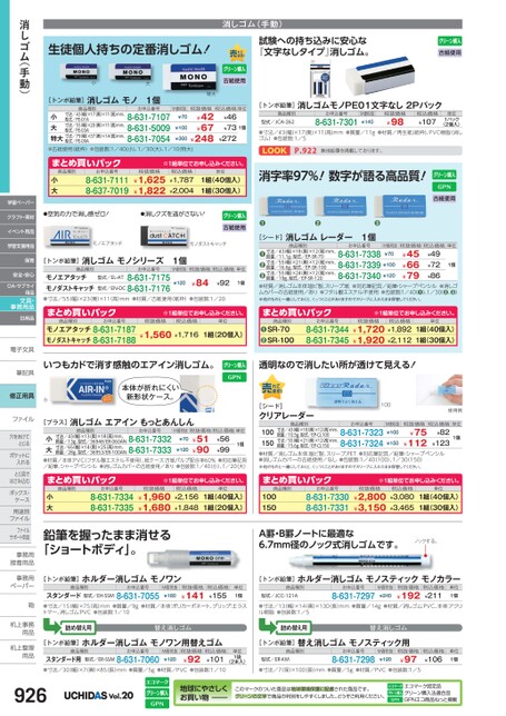 生徒個人持ちの定番消しゴム!試験への持ち込みに安心な『文字なしタイプ』消しゴム。古紙使用消しゴム(手動)[トンボ鉛筆]消しゴムモノPE01文字なし2Pパック商品種別型式/JCA-262お申込番号8-631-7301M価税抜¥140税抜価格¥98税込価格¥107単位1パック(2個入)●寸法/43(幅)×17(奥)×11(高)mm●質量/11g●材質/再生紙(紙枠)、PVC樹脂(消しゴム)●包装数:1/5LOOKP.922無地鉛筆を掲載しております。消字率97%!数字が語る高品質!古紙使用●●●M価税抜税抜価格税込価格単位¥70¥45¥66¥79¥49¥72¥861個商品種別お申込番号8-631-73388-631-7339¥1008-631-7340¥120寸法/43幅)×18奥)×12(高)mm、質量/11.1g、型式/EP-SR-70寸法/55幅)×21奥)×12(高)mm、質量/16.6g、型式/EP-SR-100寸法/55幅)×24奥)×12(高)mm、質量/19g、型式/EP-SR-120●●●[シード]消しゴムレーダー1個●材質/消しゴム本体:塩ビ製、スリーブ:紙●対応筆記具/鉛筆・シャープペンシル●消しゴムカバーの古紙使用/あり●フタル酸エステル:不使用●包装数:1/40●)、1/30●、●)※他のものと一緒にしておくと、くっつくことがありますのでスリーブに入れたまま保管してください。小大古紙使用特大[トンボ鉛筆]消しゴムモノ1個商品種別お申込番号寸法/43幅)×17奥)×11高)mm、型式/PE-01A寸法/55幅)×20奥)×11高)mm、型式/PE-03A小大特大寸法/79幅)×37奥)×14高)mm、●古紙使用(紙枠)●包装数:1/40(小)、1/30(大)、1/10(特大)8-631-71078-631-50098-631-7054型式/PE-09A¥100¥360M価税抜¥70税抜価格¥42¥67¥248税込価格単位¥46¥73¥2721個商品種別まとめ買いパック小大8-631-71118-637-7019お申込番号※1組単位申込。税抜価格¥1,625¥1,822税込価格¥1,787¥2,004単位1組(40個入)1組(30個入)●空気の力で消し感ゼロ!●消しクズを逃がさない!モノエアタッチモノダストキャッチ古紙使用[トンボ鉛筆]消しゴムモノシリーズ1個商品種別お申込番号M価税抜税抜価格税込価格単位型式/EL-ATモノエアタッチモノダストキャッチ●寸法/55(幅)×23(奥)×11(高)mm●材質/古紙使用(紙枠)●包装数:1/208-631-7175型式/EN-DC8-631-7176¥84¥120¥921個※1組単位申込。税抜価格税込価格¥1,720¥1,892¥1,920¥2,112単位1組(40個入)1組(30個入)お申込番号8-631-73448-631-7345商品種別SR-70SR-100●●まとめ買いパック商品種別まとめ買いパックモノエアタッチ8-631-7187モノダストキャッチ8-631-7188お申込番号※1組単位申込。税抜価格税込価格単位¥1,560¥1,7161組(20個入)いつもカドで消す感触のエアイン消しゴム。透明なので消したい所が透けて見える!消しゴム(手動)学習ペーパークラフト・素材イベント用品学習支援用品保育安全・安心OA・サプライ用品文具・事務用品日用品電子文具電子文筆記具筆記具修正用具小本体が折れにくい新形状ケース。[シード]クリアレーダー商品種別100使用例ファイルファイル穴をあけて穴をあけてとじるポケットにポケットに入れるとじ具でとじ具ではさみ込むボックス・ボックス・ケース用途別用途別ファイルファイルサポート用品事務用事務接着用品接着用事務用事務用ペーパーペーパー鞄鞄机上事務机上事用品用品机上整理机上整用品用品[プラス]消しゴムエアインもっとあんしん商品種別お申込番号M価税抜税抜価格税込価格単位寸法/65(幅)×14奥)×25(高)mm、寸法/43(幅)×13奥)×18(高)mm、質量/13g、型式/36948/ER-060AN8-631-7332質量/28g、型式/36953/ER-100AN8-631-7333小大●材質/本体:PVC(フタル酸エステル不使用)、紙ケース:古紙パルプ配合率60%●対応筆記具/鉛筆、シャープペンシル●消しゴムカバーの古紙使用/あり●包装数:1/40(小)、1/20(大)¥51¥90¥56¥99¥120¥701個お申込番号税抜価格税込価格単位寸法/43(幅)×18奥)×12(高)mm、質量/10.5g、型式/EP-CL100寸法/55(幅)×21奥)×12(高)mm、質量/15.6g、型式/EP-CL150¥82100¥123150●材質/消しゴム本体:塩ビ製、スリーブ:PET●対応筆記具/鉛筆・シャープペンシル●消しゴムカバーの古紙使用/なし●包装数:1/40(100)、1/30(150)※他のものと一緒にしておくと、くっつくことがありますのでスリーブに入れたまま保管してください。8-631-73238-631-7324¥75¥112¥1501個M価税抜¥100商品種別まとめ買いパック小大8-631-73348-631-7335お申込番号※1組単位申込。税抜価格¥1,960¥1,680税込価格¥2,156¥1,848単位1組(40個入)1組(20個入)商品種別まとめ買いパック1001508-631-73308-631-7331お申込番号※1組単位申込。税抜価格¥2,800¥3,150税込価格¥3,080¥3,465単位1組(40個入)1組(30個入)鉛筆を握ったまま消せる「ショートボディ」。A罫・B罫ノートに最適な6.7mm径のノック式消しゴムです。ノックする。[トンボ鉛筆]ホルダー消しゴムモノワン商品種別お申込番号税抜価格スタンダード型式/EH-SSM●寸法/15(幅)×75高)mm●質量/9g●材質/本体:ポリカーボネート、グリップ:エラストマー、消しゴム:PVC●包装数:1/108-631-7055¥141税込価格¥155単位1個M価税抜¥180詰め替え用替え消しゴム[トンボ鉛筆]ホルダー消しゴムモノワン用替えゴム商品種別税抜価格税込価格¥101スタンダード用●寸法/30(幅)×7(奥)×85(長)mm●質量/5g●材質/PVC●包装数:1/10型式/ER-SSM8-631-7060M価税抜¥120¥92お申込番号単位1袋(2本入)[トンボ鉛筆]ホルダー消しゴムモノスティックモノカラー商品種別型式/JCC-121Aお申