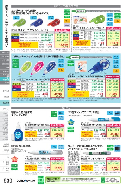 たっぷり15mの大容量!消す箇所が見やすいヨコ引きタイプ。テープ幅4mmテープ幅5mmテープ幅6mm[プラス]修正テープホワイパースイッチ商品種別グリーンブルーレッド4mm5mm6mm型式/50134/WH-1514型式/50135/WH-1515型式/50136/WH-15161個8-631-52008-631-52018-631-5202「まとめ買いパック」は、各色「1組」単位でお申し込みください。M価税抜税抜価格税込価格¥420¥310¥341修正テープ(詰替タイプ)詰め替え用修正テープホワイパースイッチ交換テープ15mヨコ引きまとめ買いパック1組(10個入)8-631-73498-631-73508-631-7351オープン¥2,988¥3,286[プラス]修正テープホワイパースイッチ交換テープグリーン4mm商品種別4mm5mm6mmグリーンブルーレッド「まとめ買いパック」は、型式/50137/WH-1514R型式/50138/WH-1515R型式/50139/WH-1516R各色「1組」単位でお申し込みください。1個8-631-52038-631-52048-631-5205M価税抜税抜価格税込価格¥270¥195¥214テープ幅4mmテープ幅5mmテープ幅15m6mmまとめ買いパック1組(10個入)8-631-73528-631-73538-631-7354オープン¥1,878¥2,065●テープ長/15m●寸法/77幅)×10奥)×36高)mm●材質/再生樹脂●引き方/ヨコ引き●包装数:1※交換テープは「ホワイパースイッチ」シリーズ本体いずれとも互換性があります。●テープ長/15m●寸法/83幅)×20(奥)×41(高)mm●質量/21g●材質/再生樹脂(アッパーケース:ポリスチレン、ロアケース:再生ABS樹脂)●引き方/ヨコ引き●キャップ付●包装数:1たるんだテープもピンッと張れるスライド機能付き。詰め替え用修正テープホワイパースライド交換テープテープ幅4mmテープ幅5mmテープ幅6mm12mまとめ買いパック1組(10個入)8-631-72488-631-72498-631-72508-631-7251オープン¥1,692¥1,861テープ幅4mmテープ幅5mm12m4mm5mm5mm使用例[プラス]修正テープホワイパースライド交換テープブルー5mm[プラス]修正テープホワイパースライドライムグリーンピンクブルー商品種別4mm型式/49551/WH-114LGR型式/49552/WH-115PK型式/49553/WH-115BL5mm「まとめ買いパック」は、各色「1組」単位でお申し込みください。1個8-631-72408-631-72418-631-7242M価税抜税抜価格税込価格¥380¥285¥313まとめ買いパック1組(10個入)8-631-72558-631-72568-631-7257オープン¥2,727¥2,999ライムグリーンピンクブルーイエロー商品種別4mm型式/49556/WH-114RLGR型式/49557/WH-115RPK型式/49558/WH-115RBL5mm6mm型式/49559/WH-116RYL「まとめ買いパック」は、各色「1組」単位でお申し込みください。1個8-631-72448-631-72458-631-72468-631-7247M価税抜税抜価格税込価格¥240¥178¥195●テープ長/12m●寸法/38(幅)×22(奥)×89(高)mm●質量/28g●材質/本体ケース:再生アクリロニトリルスチレン●包装数:1/10●テープ長/12m●寸法/33(幅)×11(奥)×74(高)mm●質量/8g●包装数:1/10※交換テープはホワイパースライドシリーズのすべてに使用できます。細部から広い面までスピーディ修正。修正ペンペン先プッシュでワンタッチ修正。1番人気の定番タイプ。先端芯1mm。7mL先端芯1.0mm18mL先端芯1.0mm[ぺんてる]修正液(油性・水性インキ両用)18mL商品種別18mL型式/「まとめ買いパック」は、XEZL1-W「1組」単位で1本8-631-5007M価税抜税抜価格税込価格¥500¥400¥440まとめ買いパック1組(10本入)8-637-7014ー¥3,900¥4,290お申し込みください。●寸法/91(長)mm●先端芯/1.0mm●材質/ボトル:PA、前軸:再生PBT●包装数:1/10[ぺんてる]ペン修正液(油性・水性インキ両用)7mL商品種別型式/XEZL21-W7mL「まとめ買いパック」は、「1組」単位で1本8-631-5008M価税抜税抜価格税込価格¥300¥240¥264まとめ買いパック1組(10本入)8-637-7015ー¥2,300¥2,530お申し込みください。●寸法/128(長)mm●先端芯/1.0mm●材質/前軸:再生PBT●包装数:1/10細部の修正に最適。先端芯0.78mm。極細ステンレスパイプ採用。7mL先端芯0.78mm修正テープのような修正ペンです。ワイドヘッドで、一気に修正!先端芯4.5mm[ぺんてる]ペン修正液極細(油性・水性インキ両用)7mL商品種別型式/XEZL61-W7mL「まとめ買いパック」は、「1組」単位で1本8-631-6023M価税抜税抜価格税込価格¥300¥240¥264まとめ買いパック1組(10本入)8-637-7016ー¥2,300¥2,530お申し込みください。●寸法/128(長)mm●先端芯/0.78mm●材質/ボトル:PA、前軸:再生PBT●包装数:1/10修正テープのように幅広で広範囲の修正が簡単にできる。従来の修正液の1/2の速さで乾く超速乾インキ。(※当社比)使用例[ぺんてる]修正液ホワイトスピード商品種別型式/XZLH64-W「まとめ買いパック」は、「1組」単位で1本8-631-5207M価税抜税抜価格税込価格¥400¥320¥352まとめ買いパック1組(10本入)8-631-7355ー¥3,100¥3,410お申し込みください。●寸法/128(長)mm●質量/19g●材質/キャップ:再生POM、ボディ:PA、ペン先:POM、前軸:PBT●包装数:1/10930Vol.20地球にやさしくお買い物このマークのついた商品は地球環境保護に配慮された商品です。グリーンの文字で商品の判別をしやすくしました。どうぞご利用ください。エコマーク認定品グリーン購入法適合品GPNエコ商品ねっと掲載修正テープ(詰替タイプ)・修正ペン学習ペーパークラフト・素材イベント用品学習支援用品保育安全・安心OA・サプライ用品文具・事務用品日用品電子文具電子文筆記具筆記具修正用具ファイルファイル穴をあけて穴をあけてとじるポケットにポ