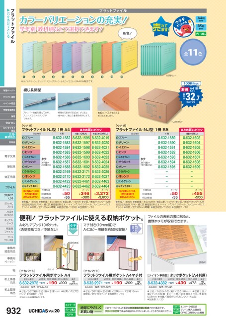 フラットファイルカラーバリエーションの充実!学年別・教科別などで選択できます!新色!A4判タテB5判タテ全11色100冊入ならA41冊お得あたり32.7税込¥36税抜¥100冊セット●●●※ライトグリーン、オレンジ、ミントグリーン・レモンイエローはA4のみ販売です。●●●●●●●●10冊セット綴じ具開閉ストッパー機能を備えており、スムーズなファイリングができます。特徴ある形状の凹凸が、ポリ足と噛み合い、綴じた書類を保持します。表紙のふくらみを抑える折り目があります。まとめ買いパック1組(10冊入)8-632-16038-632-16048-632-16058-632-16068-632-16078-632-16088-632-1609----オープン¥50¥55オープン¥455¥5001冊8-632-15898-632-15908-632-15918-632-15928-632-15938-632-15948-632-1595----タテ267縦)×197横)mmM価税抜税抜価格税込価格商品種別ブルーグリーンイエローピンクスカイブルーバイオレットグレーライトグリーンオレンジミントグリーンレモンイエロー「まとめ買いパック」は、各色「1組」単位でお申し込みください。●●●●●●●●●●●[ウチダ]フラットファイルNJ型1冊B5まとめ買いパック1組(10冊入)8-632-15968-632-15978-632-15988-632-15998-632-16008-632-16018-632-16028-632-31718-632-31728-632-44618-632-4462オープン¥346¥3801組(100冊入)8-632-40198-632-40208-632-40218-632-40228-632-40238-632-40248-632-40258-632-40268-632-40278-632-44638-632-4464オープン¥3,273¥3,600[ウチダ]フラットファイルNJ型1冊A41冊8-632-15828-632-15838-632-15848-632-15858-632-15868-632-15878-632-15888-632-31698-632-31708-632-44228-632-4423オープン¥50¥55タテ307(縦)×230(横)mmM価税抜税抜価格税込価格商品種別ブルーグリーンイエローピンクスカイブルーバイオレットグレーライトグリーンオレンジミントグリーンレモンイエロー●●●●●●●●●●●「まとめ買いパック」は、各色「1組」単位でお申し込みください。●背幅/18mm●表紙厚/約0.45mm●綴じ厚/15mm●材質/表紙:特抄ファイル用紙(古紙再生紙70%)、綴じ具:樹脂製(押さえ:ハイインパクトスチロール、ファスナー:ポリエチレン)●穴数/2穴(80mm間隔)●適正収容/150枚●包装数:1/10●背幅/18mm●表紙厚/約0.45mm●綴じ厚/15mm●材質/表紙:特抄ファイル用紙(古紙再生紙70%)、綴じ具:樹脂製(押さえ:ハイインパクトスチロール、ファスナー:ポリエチレン)●穴数/2穴(80mm間隔)●適正収容/150枚●包装数:1/10ファイルの表紙の裏に貼ると、書類やメモが収容できます。使用例便利!フラットファイルに使える収納ポケット。コれヨ入マチ付き(10mm幅)でA4コピー用紙を約50枚収納!タテ入れA4クリアブック10ポケット。(透明表紙つき/中紙なし)透明表紙タテ入ポケット[ナカバヤシ]フラットファイル用ポケットA4お申込番号M価税抜8-632-2972¥370税抜価格¥190税込価格¥209単位1冊(10ポケット)商品種別型式/FPR-A4-10[ナカバヤシ]フラットファイル用ポケットA4マチ付お申込番号8-632-2971M価税抜¥370税抜価格¥190税込価格¥209単位1組(2枚入)商品種別型式/FPR-A4W[ライオン事務器]タックポケット(A4判用)お申込番号8-632-4382M価税抜¥600税抜価格¥430税込価格¥473単位1組(2枚入)商品種別型式/TP-A4S●寸法/307縦)×253(横)×3(厚)mm●材質/ポリプロピレン●包装数:1/10※10ポケットは溶着されています。●寸法/307(縦)×256(横)×2(厚)mm、マチ幅10mm●材質/ポリプロピレン●包装数:1/10●寸法/160(+10)縦)×220(横)mm●収納寸法/横215mm程度●シート厚/粘着側0.1mm、手前側0.08mm●材質/透明ポリプロピレンフィルム製●包装数:1/20フラットファイル▶穴をあけてとじる学習ペーパークラフト・素材イベント用品学習支援用品保育安全・安心OA・サプライ用品文具・事務用品日用品電子文具電子文筆記具筆記具修正用具修正用ファイル穴をあけてとじるポケットにポケットに入れるとじ具でとじ具ではさみ込むボックス・ボックス・ケース用途別用途別ファイルファイルサポート用品事務用事務接着用品接着用事務用事務用ペーパーペーパー鞄鞄机上事務机上事用品用品机上整理机上整用品用品932Vol.20地球にやさしくお買い物このマークのついた商品は地球環境保護に配慮された商品です。グリーンの文字で商品の判別をしやすくしました。どうぞご利用ください。エコマーク認定品グリーン購入法適合品GPNエコ商品ねっと掲載