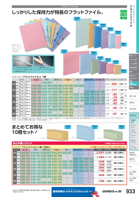 ◀穴をあけてとじるフラットファイル学習ペーパークラフト・素材イベント用品学習支援用品保育安全・安心OA・サプライ用品文具・事務用品日用品電子文具子筆記具筆記具修正用具正ファイル穴をあけてとじるポケットにポケットに入れるとじ具でとじ具ではさみ込むボックス・ボックス・ケースス用途別用途別ファイルファイルサポート用品事務用務接着用品着事務用務ペーパーペーパー鞄机上事務上用品品机上整理上用品用品しっかりした保持力が特長のフラットファイル。フラットファイルA3判タテB4判タテA4判タテB5判タテA5判タテ左から、ピンク、ブルー、グリーン、イエロー、グレー、スカイブルー、バイオレットA3判ヨコナミダ型の特長ある形状の凹凸が、ポリ足としっかり噛み合い、綴じた書類を保持します。ストッパー機能を備えており、スムーズなファイリングができます。B4判ヨコA4判ヨコB5判ヨコA5判ヨコB6判タテB6判ヨコグリーンイエローグレースカイブルーバイオレット[ナカバヤシ]フラットファイルJ1冊商品種別型式/フF-J81型式/フF-J80型式/フF-J101型式/フF-J100型式/フF-J221型式/フF-J220タテ430(縦)×313(横)mm、ヨコ307(縦)×436(横)mm、タテ374(縦)×272(横)mm、ヨコ267(縦)×379(横)mm、タテ307(縦)×230(横)mm、ヨコ226(縦)×312(横)mm、タテ267(縦)×197(横)mm、ヨコ192(縦)×272(横)mm、タテ220(縦)×163(横)mm、ヨコ158(縦)×225(横)mm、タテ192(縦)×143(横)mm、ヨコ138(縦)×197(横)mm、型式/フF-J70型式/フF-J72型式/フF-J71型式/フF-J73型式/フF-J60型式/フF-J61A3B4A4B5A5B6ピンク-8-632-26828-632-18708-632-18858-632-14748-632-13978-632-14818-632-14048-632-18758-632-18928-632-18808-632-1896ブルー8-632-26788-632-26838-632-18668-632-18818-632-14758-632-13938-632-14828-632-14008-632-18718-632-18888-632-18768-632-1893-8-632-26848-632-18678-632-18828-632-14718-632-13948-632-14788-632-14018-632-18728-632-1889-8-632-1894-8-632-26858-632-18688-632-18838-632-14728-632-13958-632-14798-632-14028-632-18738-632-18908-632-18788-632-18958-632-26868-632-14738-632-13968-632-14808-632-1874-------8-632-18868-632-14708-632-13988-632-14778-632-14058-632-18878-632-14768-632-13998-632-14838-632-1406M価税抜税抜価格税込価格単位¥370¥255¥2801冊¥190¥130¥140¥120¥130¥140¥130¥117¥65¥76¥62¥83¥92¥1281冊¥71¥83¥68¥911冊1冊¥1011冊¥87¥951冊-------●背幅/18mm●表紙厚/約0.45mm●綴じ厚/約15mm●材質/表紙:特抄ファイル用紙(古紙再生紙70%)、綴じ具:樹脂(押さえ:ハイインパクトスチロール、ファスナー:ポリエチレン)●穴数/2穴(80mm間隔)●適正収容/150枚●包装数:1/10まとめてお得な10冊セット!A5判ヨコA4判タテB6判ヨコイエローブルーグリーン-------------まとめ買いパック[ナカバヤシ]フラットファイルJ1組(10冊入)商品種別ピンクA3B4A4B5A5B6ヨコ8-632-2873タテ8-632-1901ヨコ8-632-1916タテ8-632-1497ヨコ8-632-1442タテ8-632-1504ヨコ8-632-1449タテ8-632-1906ヨコ8-632-1937タテ8-632-1911ヨコ8-632-1941ブルー8-632-28748-632-18978-632-19128-632-14988-632-14388-632-15058-632-14458-632-19028-632-19338-632-19078-632-1938グリーン8-632-28758-632-18988-632-19138-632-14948-632-14398-632-15018-632-14468-632-19038-632-1934-8-632-1939イエロー8-632-28768-632-18998-632-19148-632-14958-632-14408-632-15028-632-14478-632-19048-632-19358-632-19098-632-19408-632-28778-632-14968-632-14418-632-15038-632-1905------------グレースカイブルーバイオレット8-632-19178-632-14938-632-14438-632-15008-632-14508-632-19188-632-14998-632-14448-632-15068-632-1451※1組単位申込。注:「数量1」のご注文で「10冊入」が届く商品です。税抜価格税込価格¥2,291¥2,520¥1,064¥1,170¥600¥770¥620¥820¥546¥700¥564¥746¥846単位1組(10冊入)1組(10冊入)1組(10冊入)1組(10冊入)¥9301組(10冊入)¥782¥8601組(10冊入)※カタログに掲載の商品情報(仕様・価格・税率など)は変更になる場合がございます。最新情報はUCHIDASww.uchidas.netwへ!Vol.20933