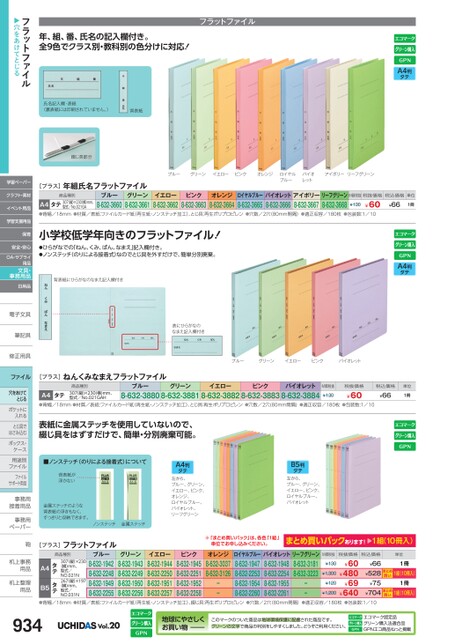 年、組、番、氏名の記入欄付き。全9色でクラス別・教科別の色分けに対応!フラットファイル氏名記入欄・表紙(裏表紙には印刷されていません。)背表紙綴じ具部分[プラス]年組氏名フラットファイルグリーン8-632-36618-632-3660ブルー商品種別A4タテ307縦)×230横)mm、●背幅/18mm●材質/表紙:ファイルカード紙(再生紙・ノンステッチ加工)、とじ具:再生ポリプロピレン●穴数/2穴(80mm間隔)●適正収容/180枚●包装数:1/10型式/No.021GA8-632-3663オレンジ8-632-3664ロイヤルブルー8-632-3665バイオレットアイボリーリーフグリーンM価税抜税抜価格¥608-632-36668-632-36688-632-3667¥130イエロー8-632-3662ピンクブルーグリーンイエローピンクオレンジロイヤルブルーバイオレットアイボリーリーフグリーン小学校低学年向きのフラットファイル!●ひらがなでの「ねん、くみ、ばん、なまえ」記入欄付き。●ノンステッチ(のりによる接着式)なのでとじ具を外すだけで、簡単分別廃棄。背表紙にひらがなのなまえ記入欄付き表にひらがなのなまえ記入欄付きブルーグリーンイエローピンクバイオレットA4判タテ税込価格単位¥661冊A4判タテ[プラス]ねんくみなまえフラットファイル商品種別タテA4●背幅/18mm●材質/表紙:ファイルカード紙(再生紙・ノンステッチ加工)、とじ具:再生ポリプロピレン●穴数/2穴(80mm間隔)●適正収容/180枚●包装数:1/108-632-38808-632-38818-632-38828-632-38838-632-3884307(縦)×230(横)mm、型式/No.021GAH¥130¥60ブルーグリーンイエローピンクバイオレットM価税抜税抜価格税込価格¥66単位1冊表紙に金属ステッチを使用していないので、綴じ具をはずすだけで、簡単・分別廃棄可能。■ノンステッチ(のりによる接着式)について背表紙が浮かない金属ステッチのような背表紙の浮きもなく、すっきりと収納できます。ノンステッチ金属ステッチA4判タテ左から、ブルー、グリーン、イエロー、ピンク、オレンジ、ロイヤルブルー、バイオレット、リーフグリーンB5判タテ左から、ブルー、グリーン、イエロー、ピンク、ロイヤルブルー、バイオレット[プラス]フラットファイル商品種別A4タテB5タテ307(縦)×230(横)mm、型式/NO.021N267(縦)×197(横)mm、型式/NO.031Nブルー8-632-19428-632-22488-632-19498-632-2255※「買」、各色「1組」単位申込。まとめ買いパック!1組(10冊入)グリーン8-632-19438-632-22498-632-19508-632-2256イエロー8-632-19448-632-22508-632-19518-632-2257ピンク8-632-19458-632-22518-632-19528-632-2258オレンジ8-632-30378-632-3126--ロイヤルブルーバイオレットリーフグリーン8-632-31818-632-19478-632-22538-632-32238-632-19548-632-22608-632-19488-632-22548-632-19558-632-2261--M価税抜¥130¥1,300¥120¥1,200税抜価格¥60¥480¥69¥640税込価格¥66¥528まとめ買い¥75単位1冊1組(10冊入)1冊¥704まとめ買い1組(10冊入)フラットファイル▶穴をあけてとじる学習ペーパークラフト・素材イベント用品学習支援用品保育安全・安心OA・サプライ用品文具・事務用品日用品電子文具電子文筆記具筆記具修正用具修正用ファイル穴をあけてとじるポケットにポケットに入れるとじ具でとじ具ではさみ込むボックス・ボックス・ケース用途別用途別ファイルファイルサポート用品事務用事務接着用品接着用事務用事務用ペーパーペーパー鞄鞄机上事務机上事用品用品机上整理机上整用品用品●背幅/18mm●材質/表紙:ファイルカード紙(再生紙・ノンステッチ加工)、綴じ具:再生ポリプロピレン●穴数/2穴(80mm間隔)●適正収容/180枚●包装数:1/10934Vol.20地球にやさしくお買い物このマークのついた商品は地球環境保護に配慮された商品です。グリーンの文字で商品の判別をしやすくしました。どうぞご利用ください。エコマーク認定品グリーン購入法適合品GPNエコ商品ねっと掲載
